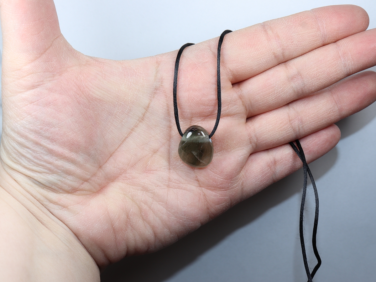 Die Halskette mit Aktinolithquarz wird nach Ihren Angaben individualisiert. Sie haben die Wahl zwischen einem schwarzen Band mit einem Verschluss aus Edelstahl oder einer Kette aus Silber 925.