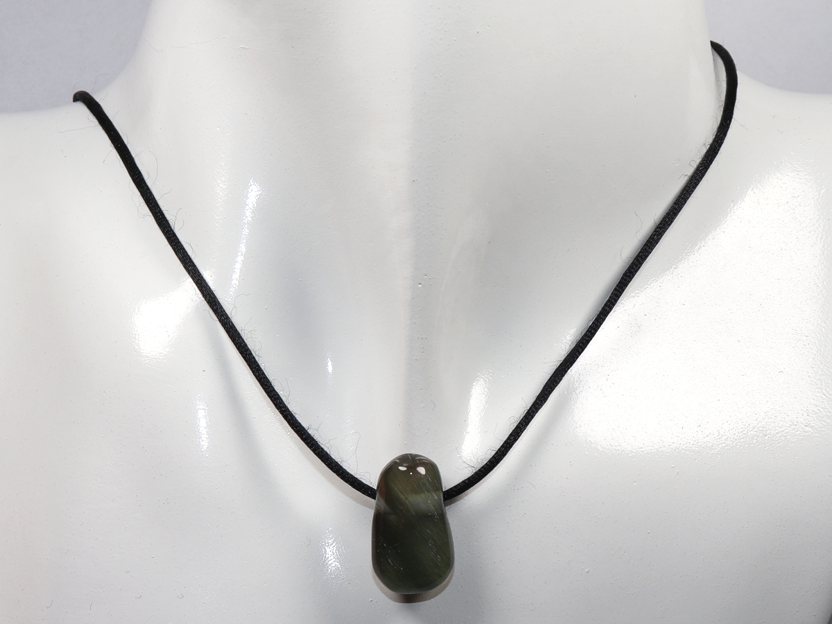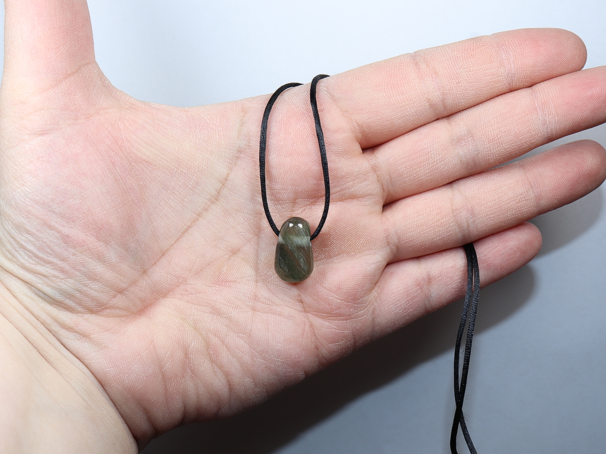 Die Halskette mit Aktinolithquarz wird nach Ihren Angaben individualisiert. Sie haben die Wahl zwischen einem schwarzen Band mit einem Verschluss aus Edelstahl oder einer Kette aus Silber 925.