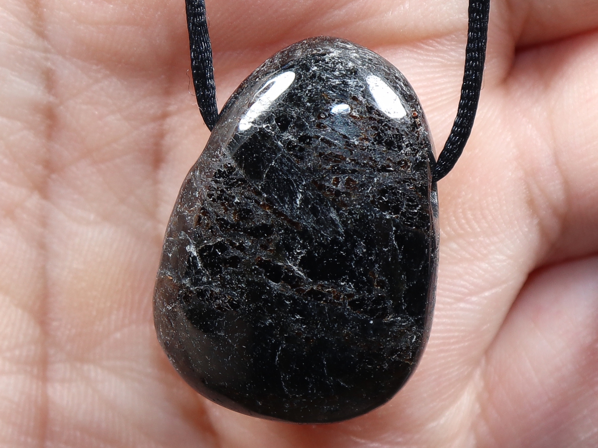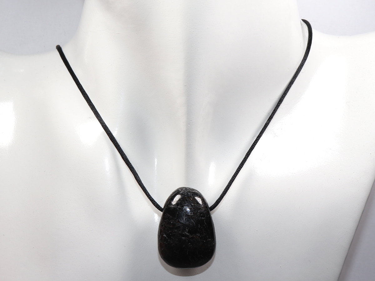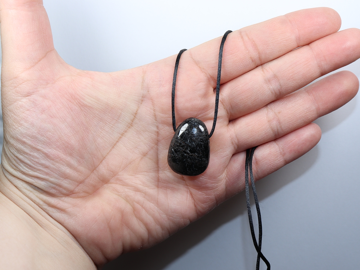 Die Halskette mit Anthophyllit wird nach Ihren Angaben individualisiert. Sie haben die Wahl zwischen einem schwarzen Band mit einem Verschluss aus Edelstahl oder einer Kette aus Silber 925.