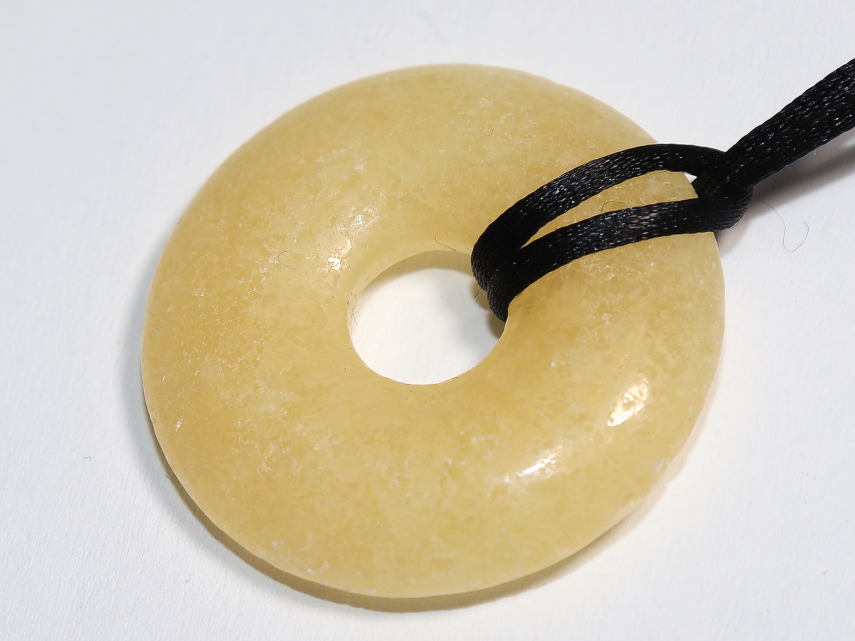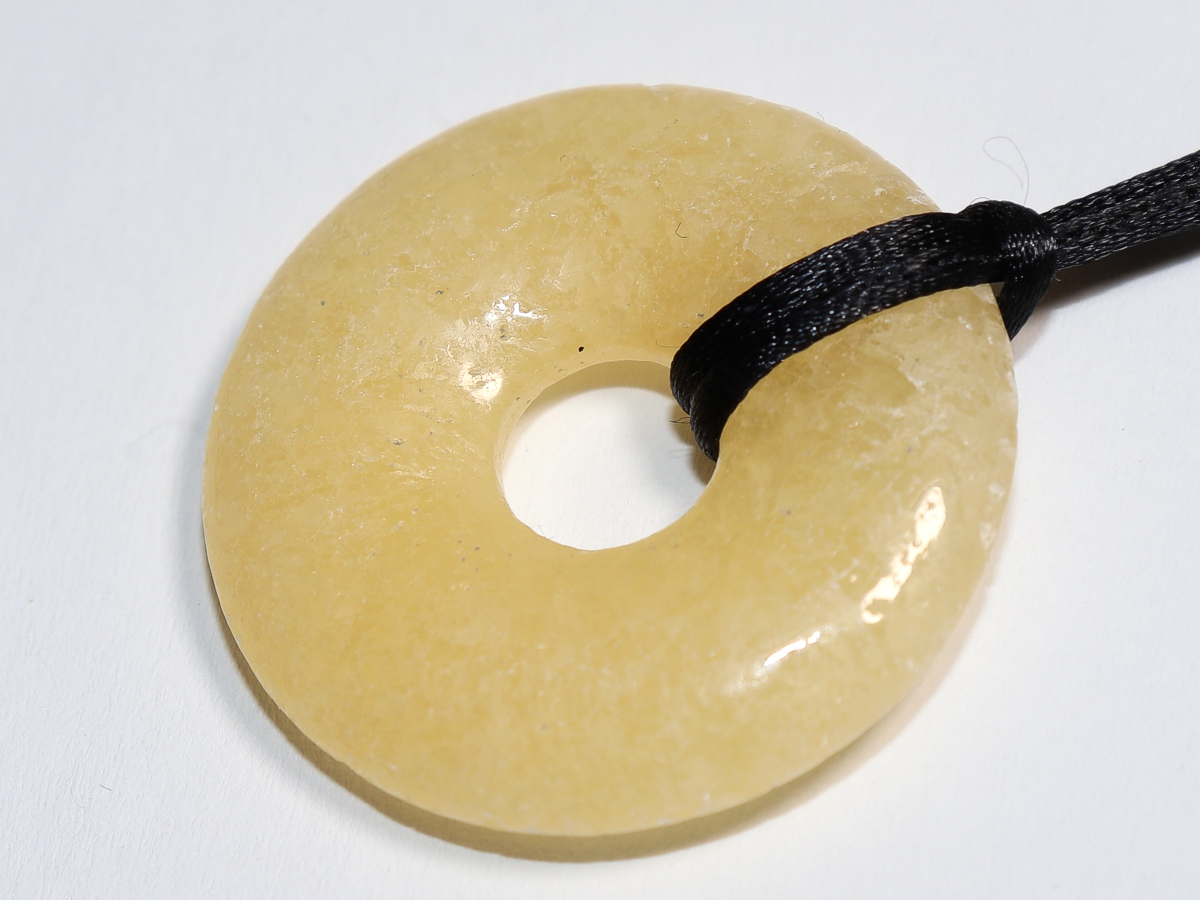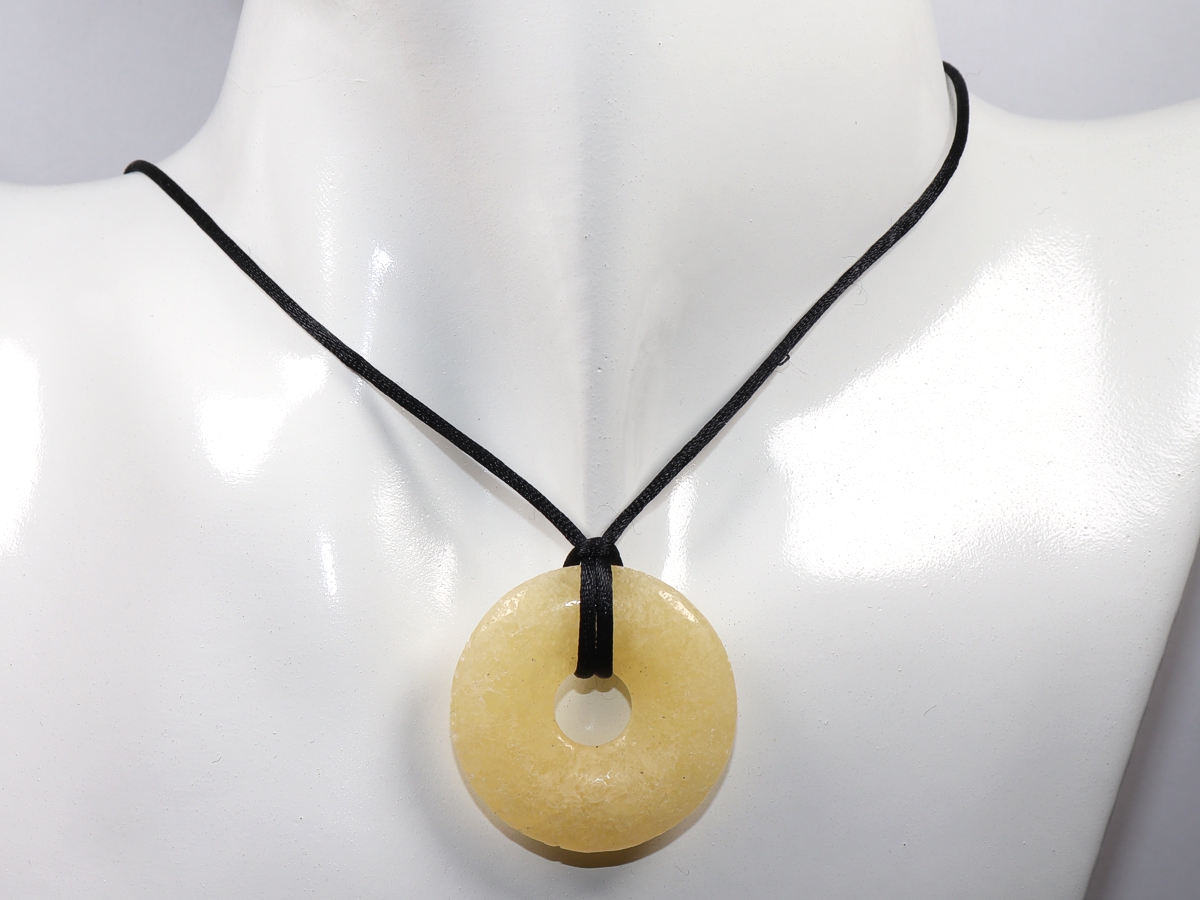 Die Halskette mit dem Donut aus Aragonit und einem schwarzen Band wird nach Ihren Angaben individualisiert. Der Verschluss ist aus Edelstahl.