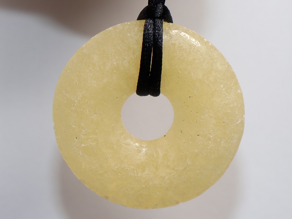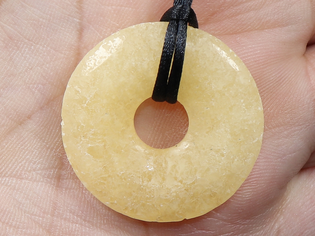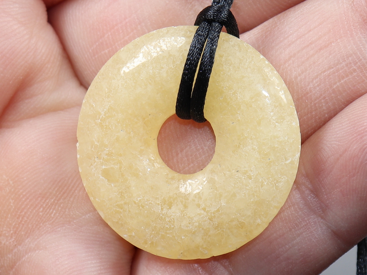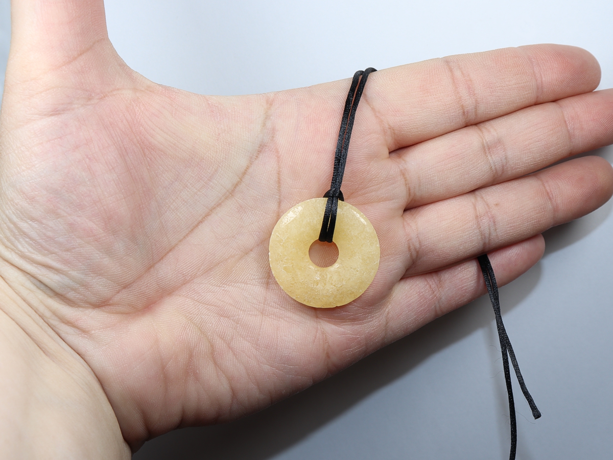 Die Halskette mit dem Donut aus Aragonit und einem schwarzen Band wird nach Ihren Angaben individualisiert. Der Verschluss ist aus Edelstahl.