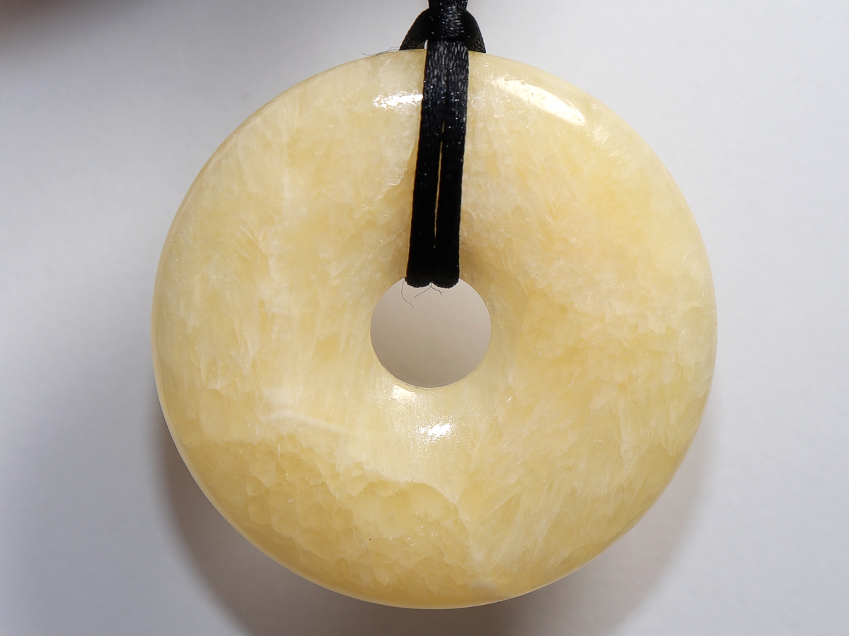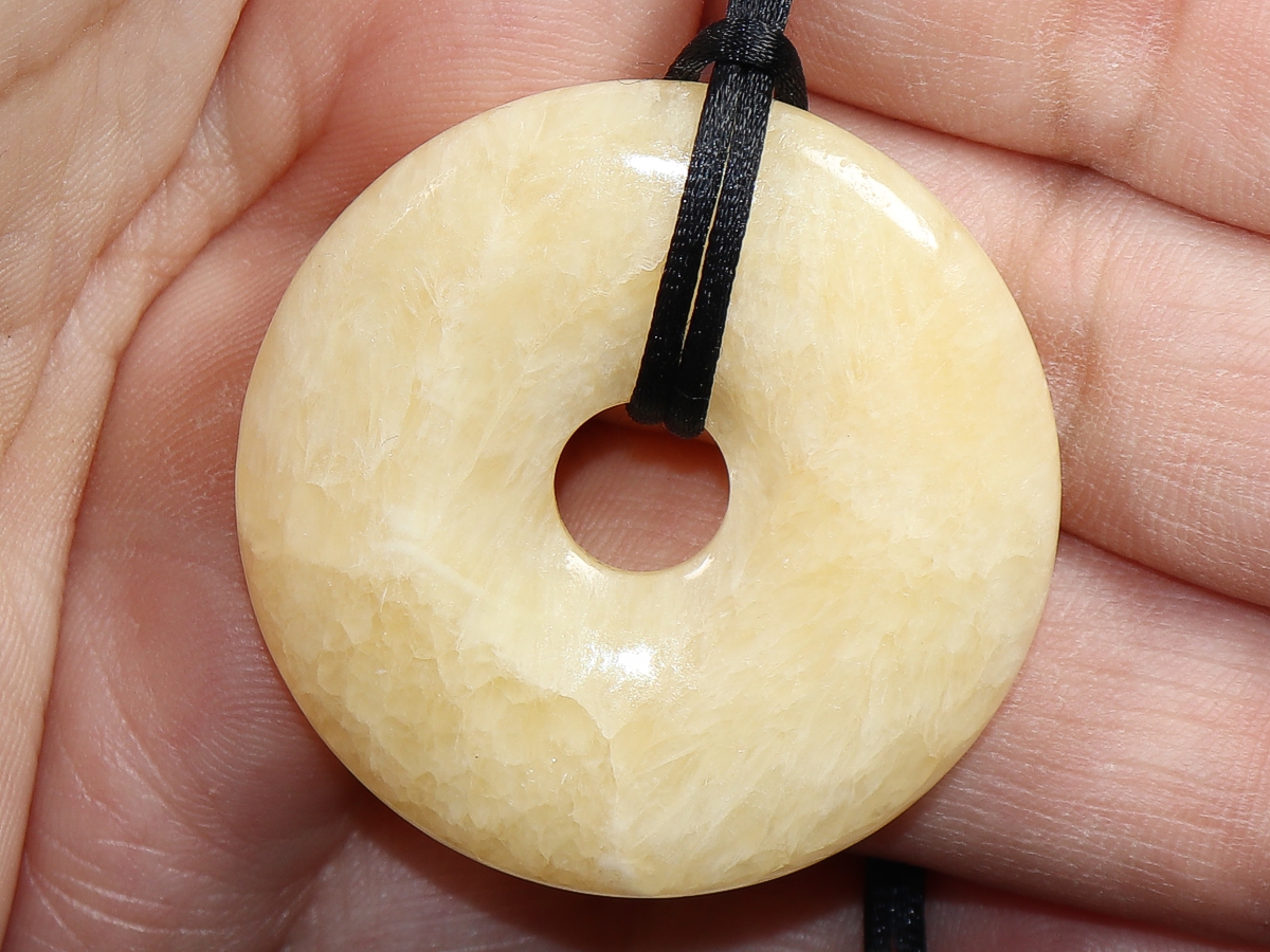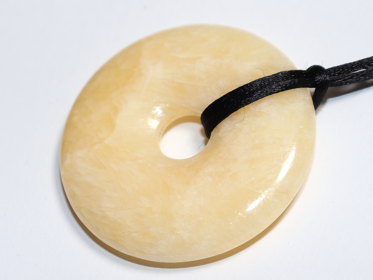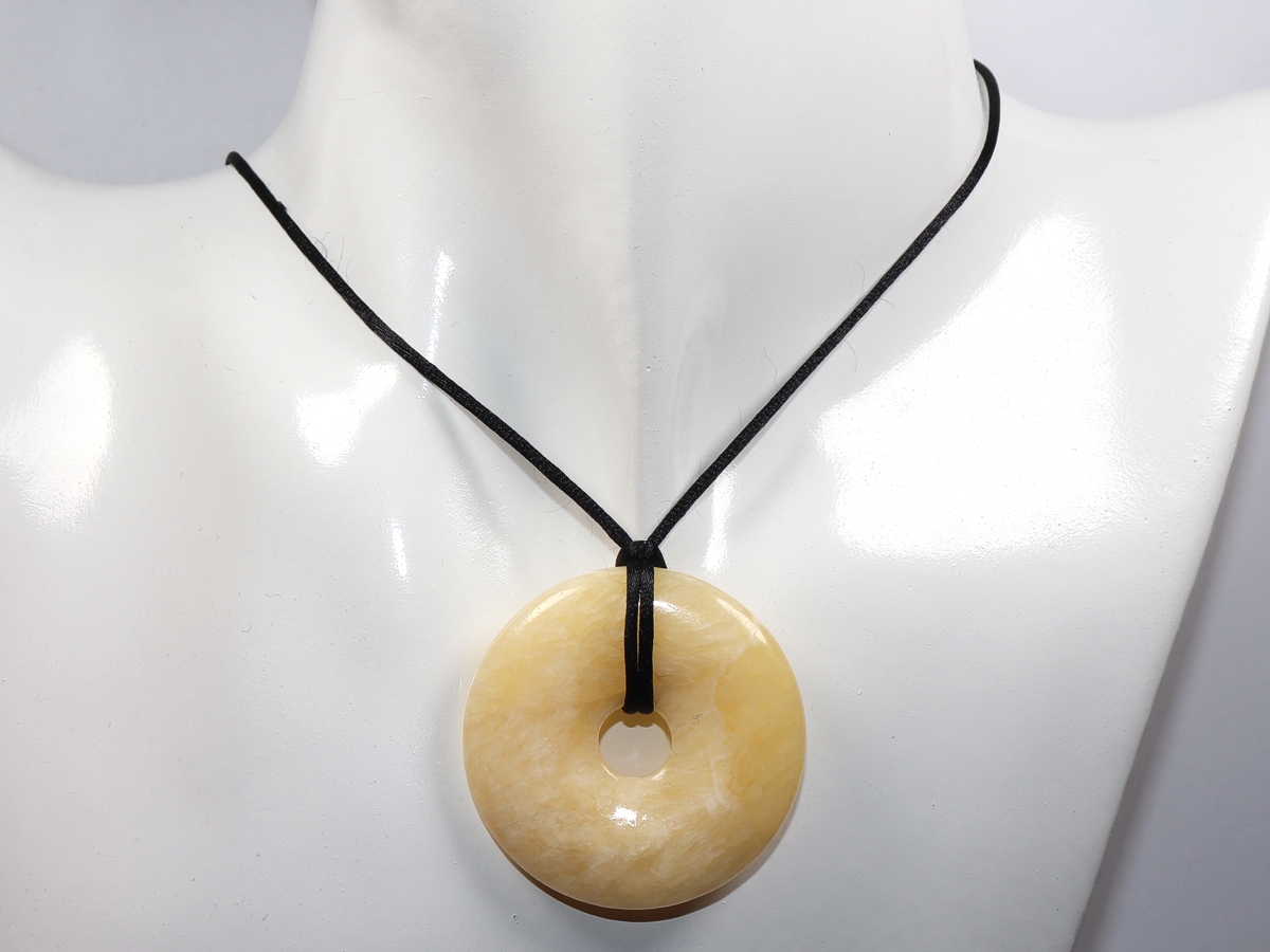 Die Halskette mit dem Donut aus Aragonit und einem schwarzen Band wird nach Ihren Angaben individualisiert. Der Verschluss ist aus Edelstahl.