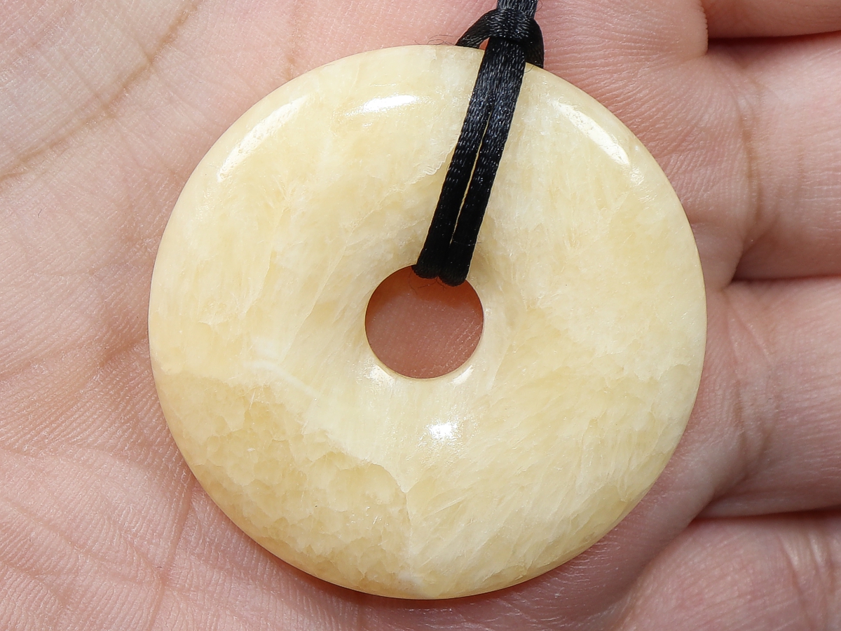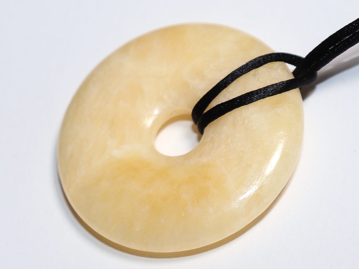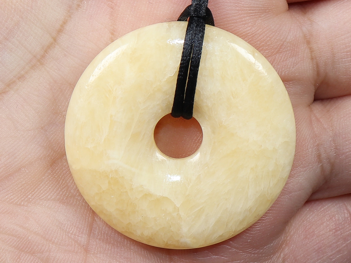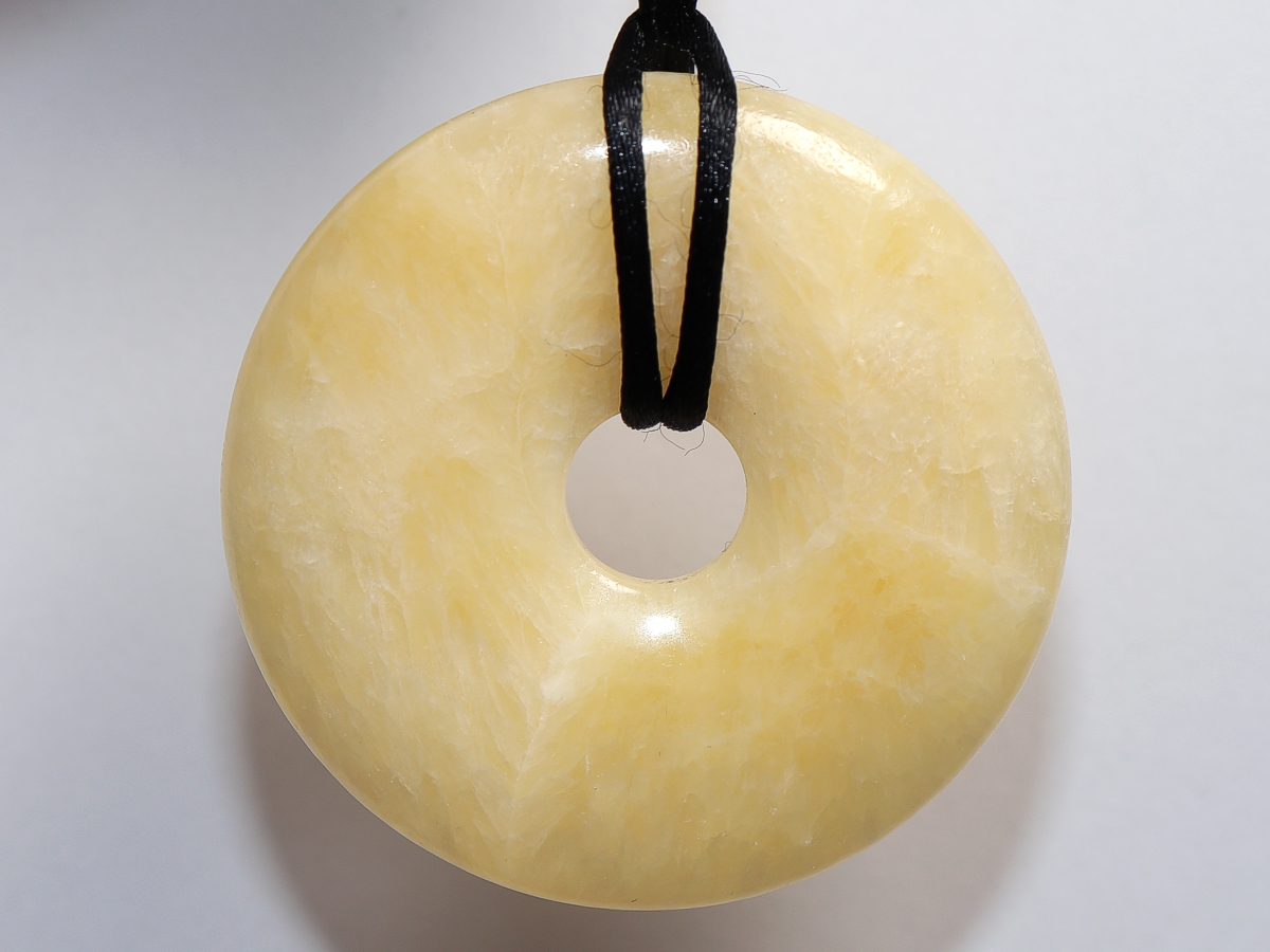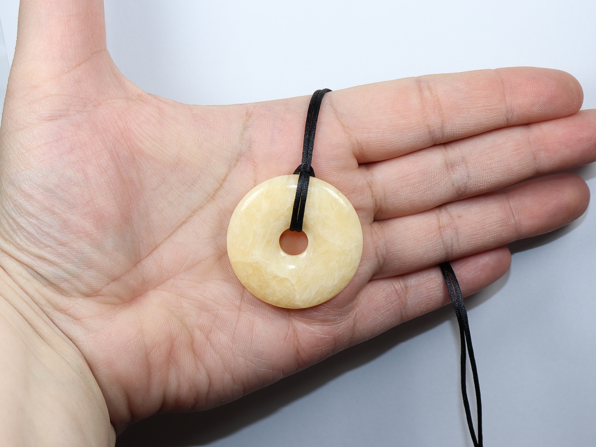 Die Halskette mit dem Donut aus Aragonit und einem schwarzen Band wird nach Ihren Angaben individualisiert. Der Verschluss ist aus Edelstahl.