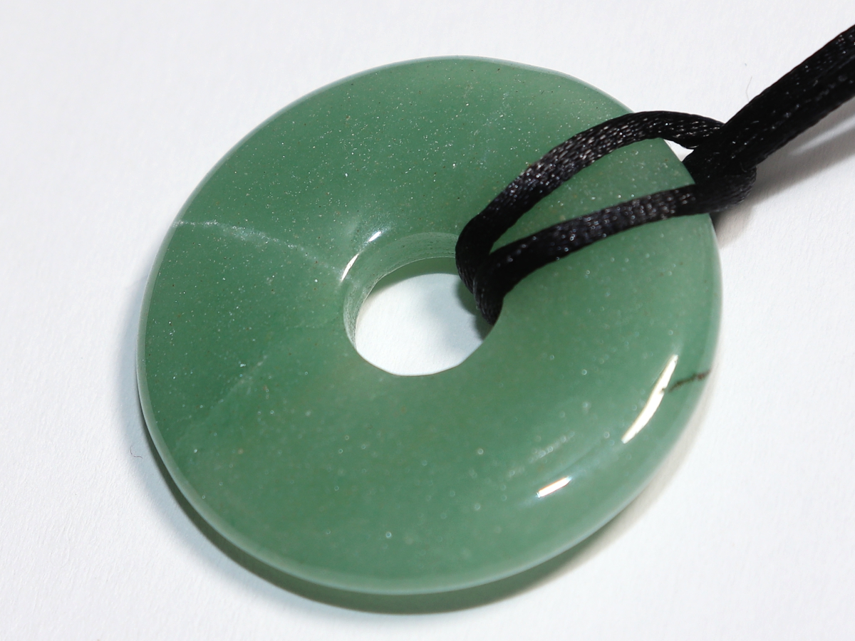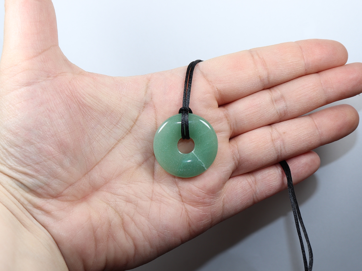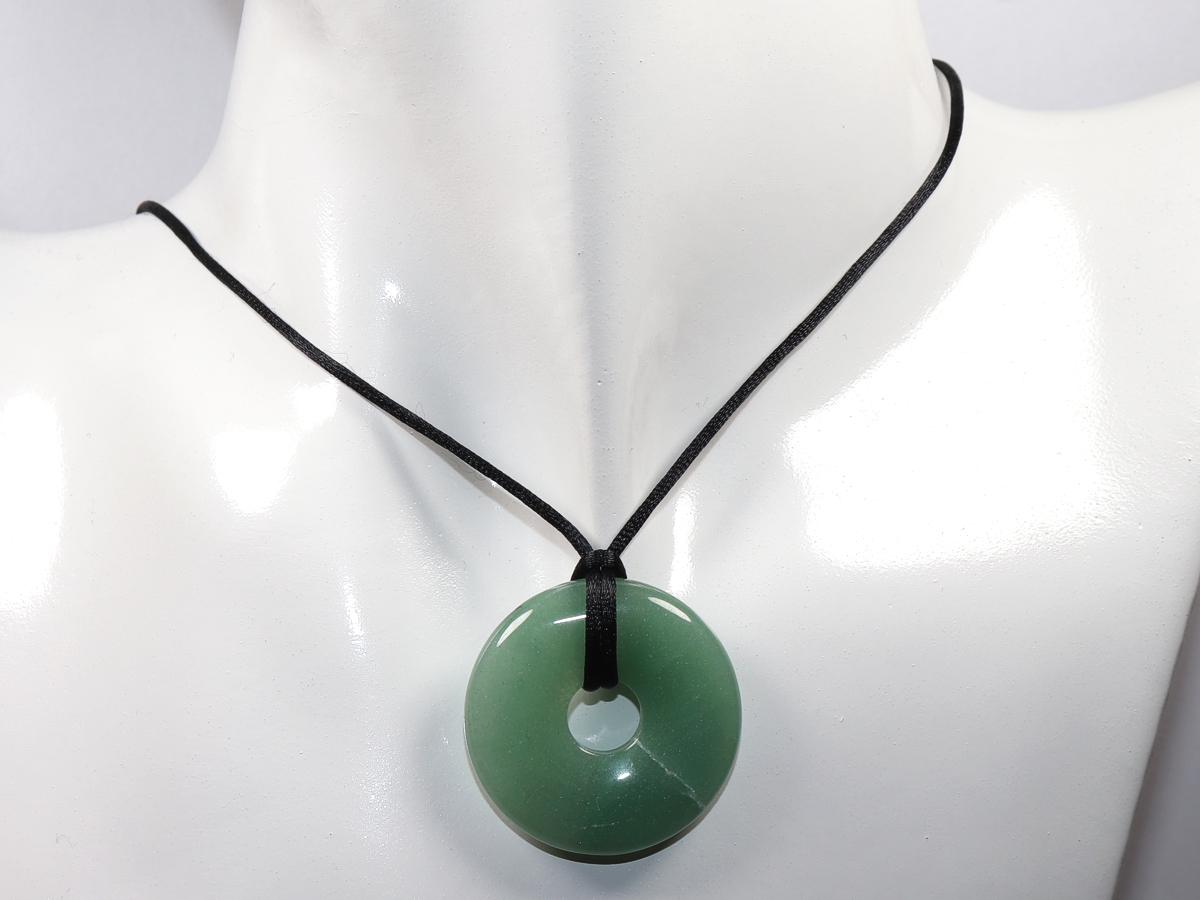 Die Halskette mit dem Donut aus Aventurin und einem schwarzen Band wird nach Ihren Angaben individualisiert. Der Verschluss ist aus Edelstahl.
