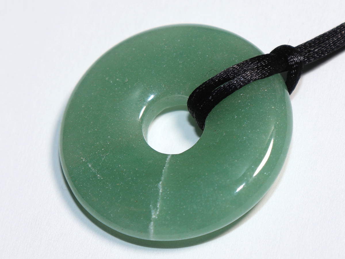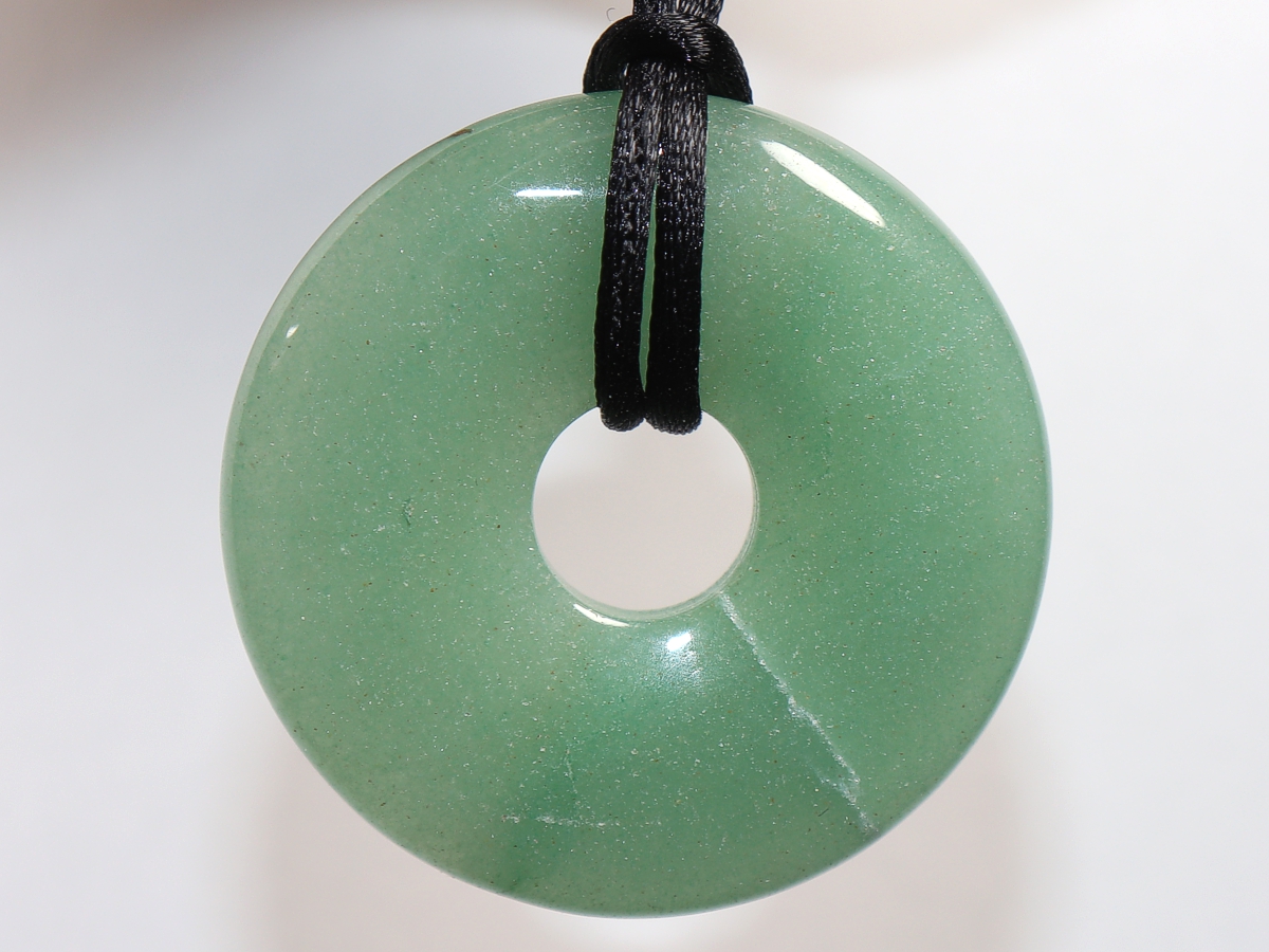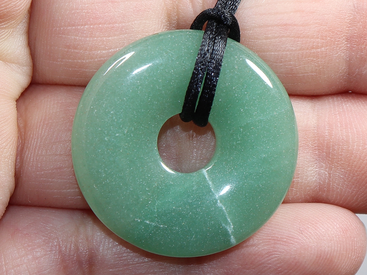 Die Halskette mit dem Donut aus Aventurin und einem schwarzen Band wird nach Ihren Angaben individualisiert. Der Verschluss ist aus Edelstahl.