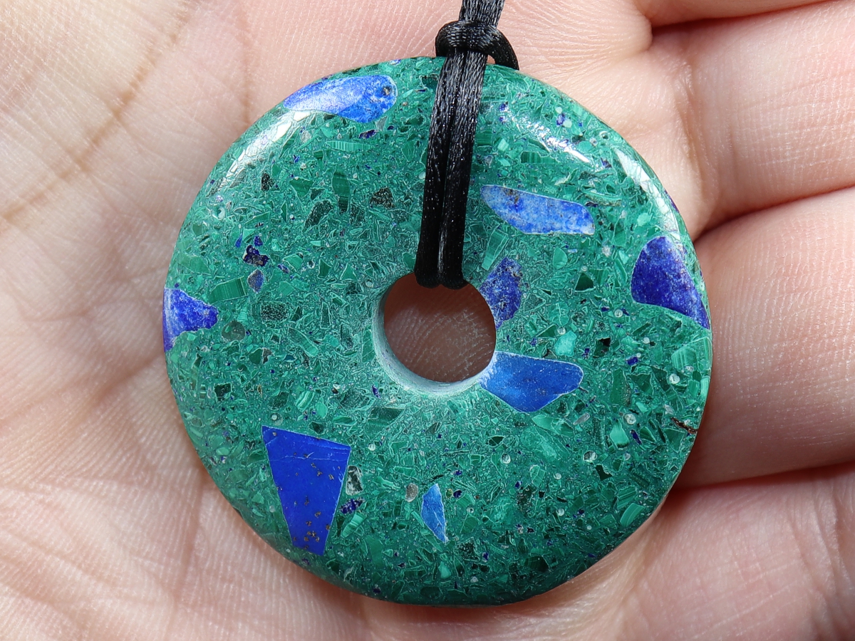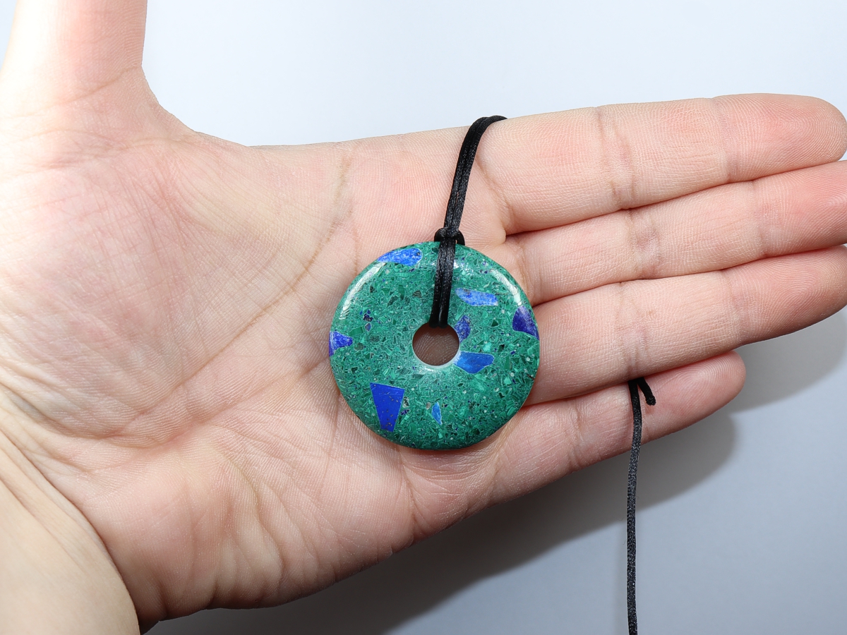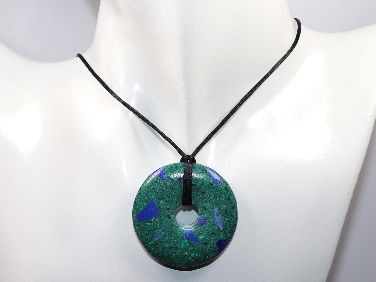 Die Halskette mit dem Donut aus Azurit-Malachit und einem schwarzen Band wird nach Ihren Angaben individualisiert. Der Verschluss ist aus Edelstahl.