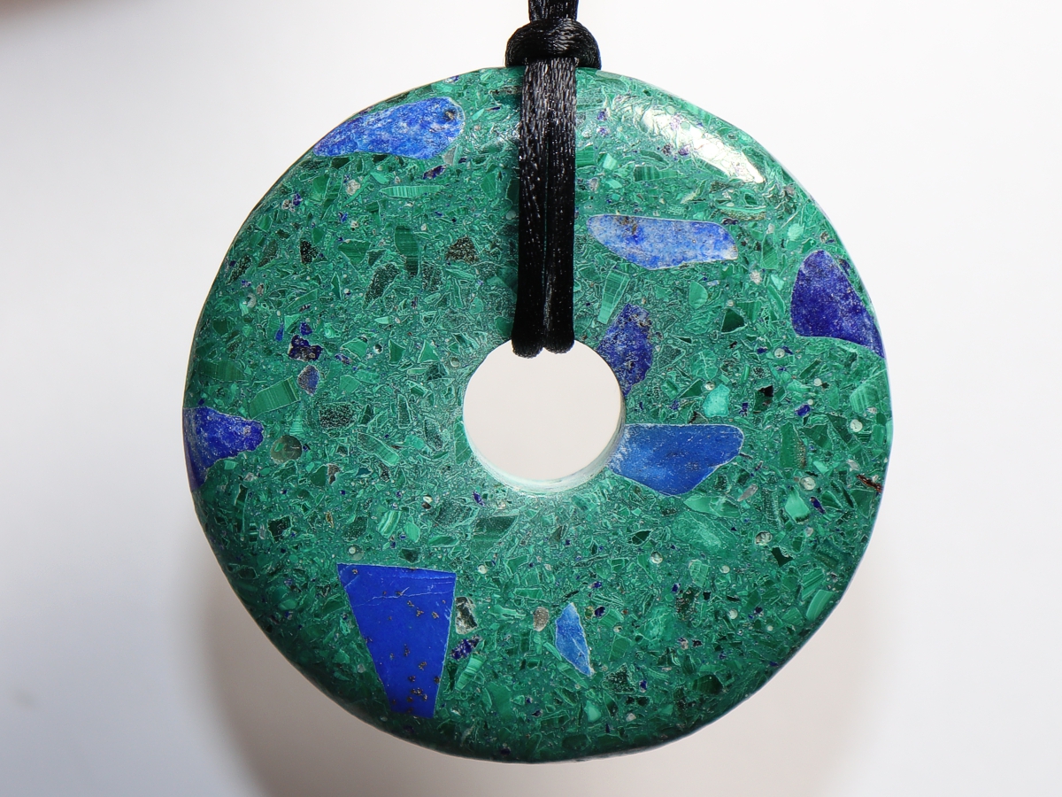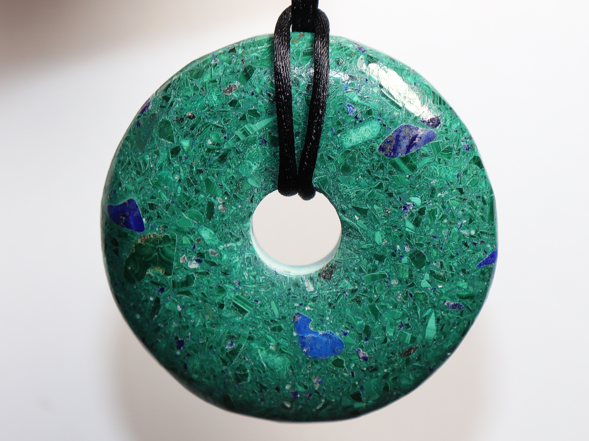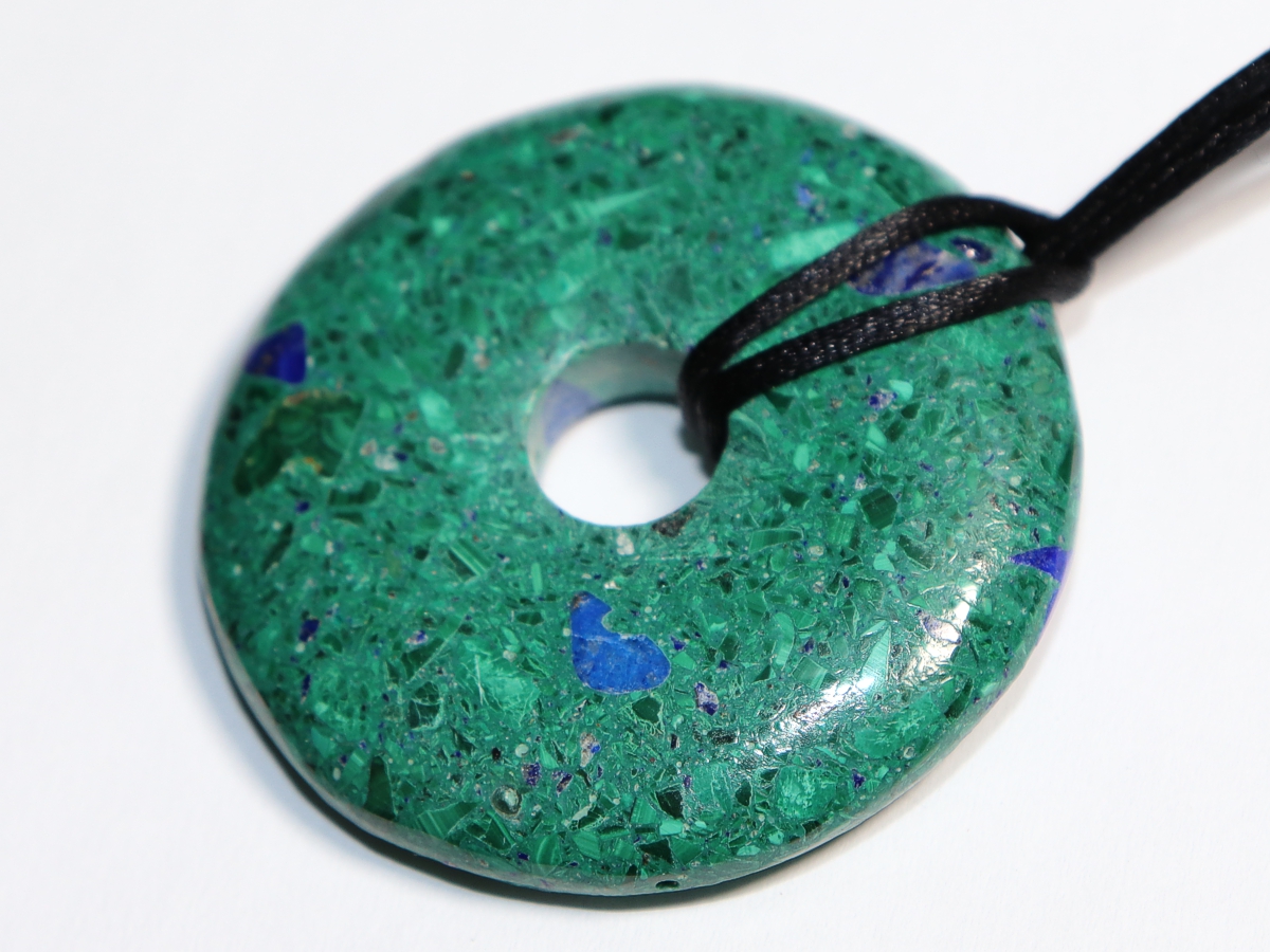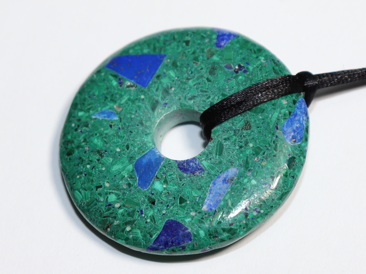 Die Halskette mit dem Donut aus Azurit-Malachit und einem schwarzen Band wird nach Ihren Angaben individualisiert. Der Verschluss ist aus Edelstahl.
