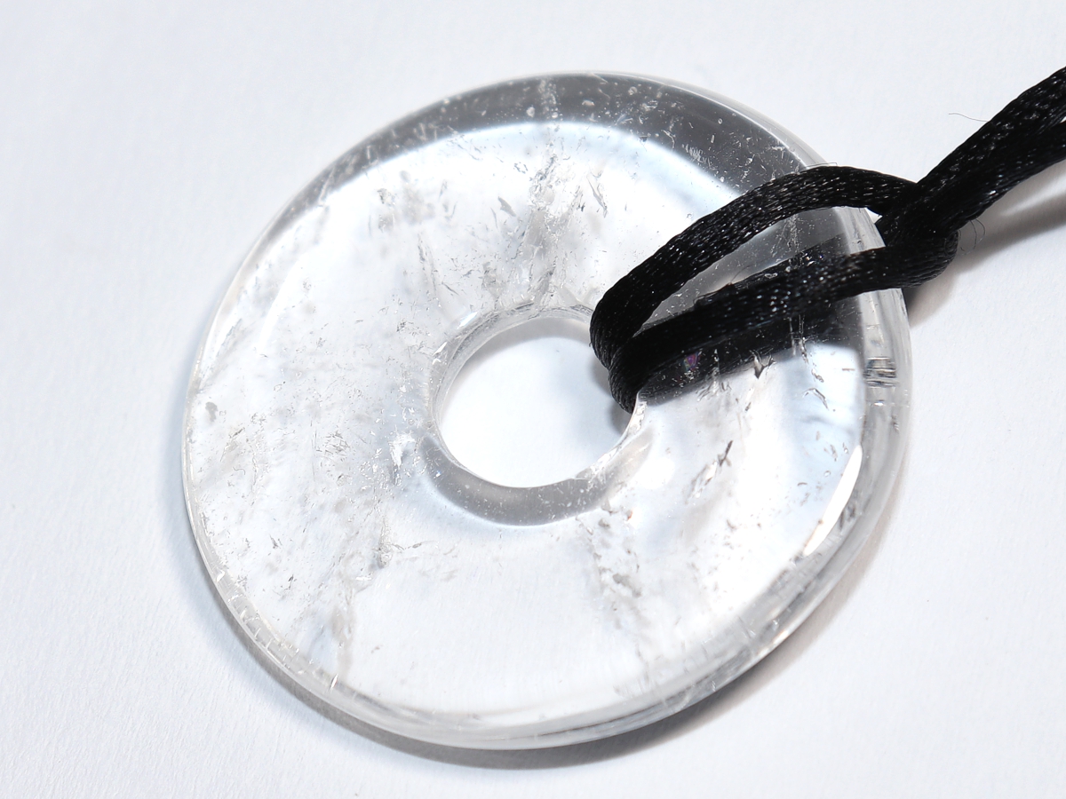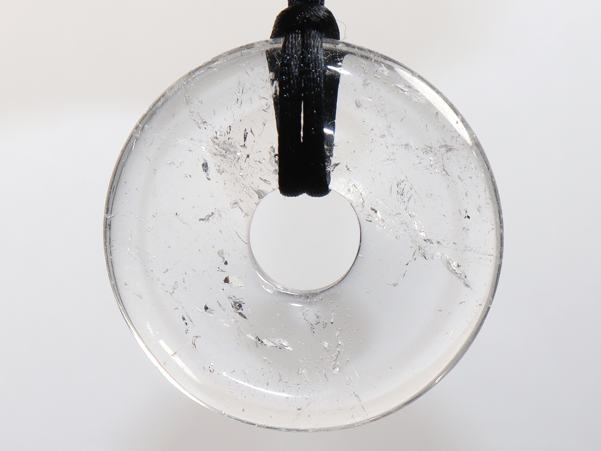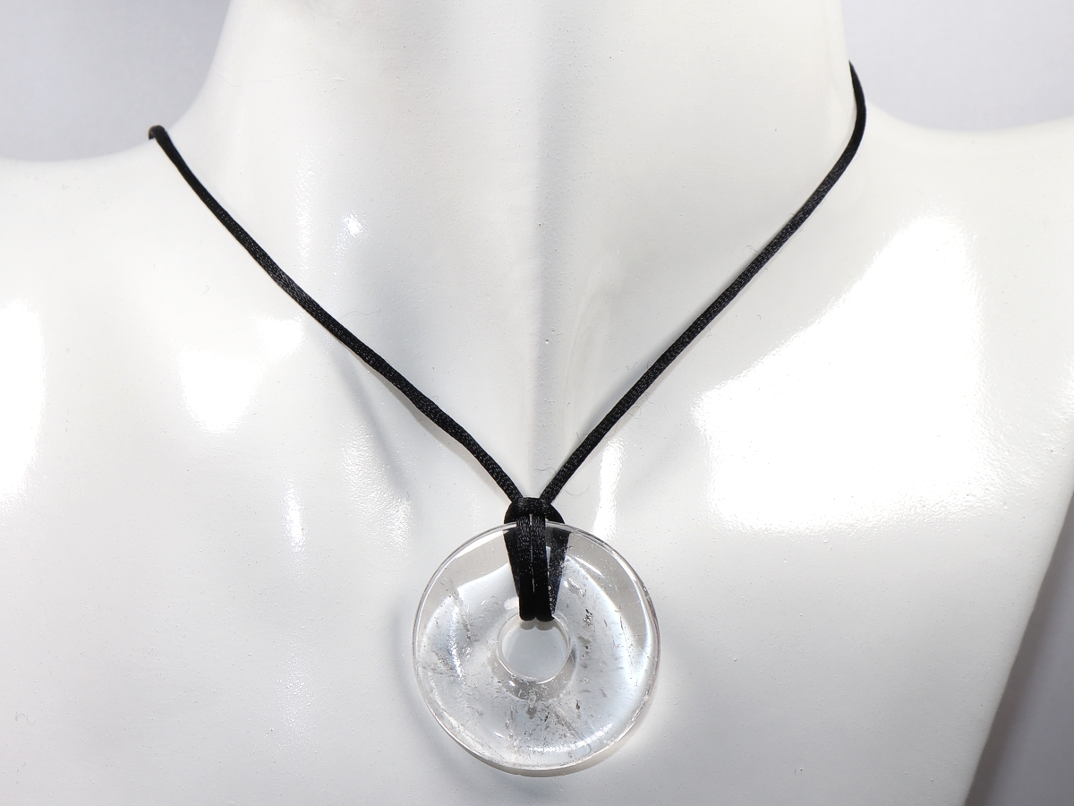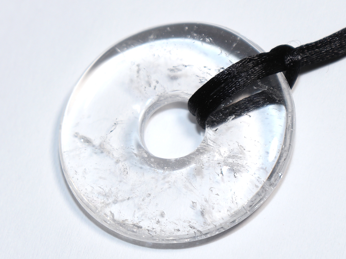 Die Halskette mit dem Donut aus Bergkristall und einem schwarzen Band wird nach Ihren Angaben individualisiert. Der Verschluss ist aus Edelstahl.