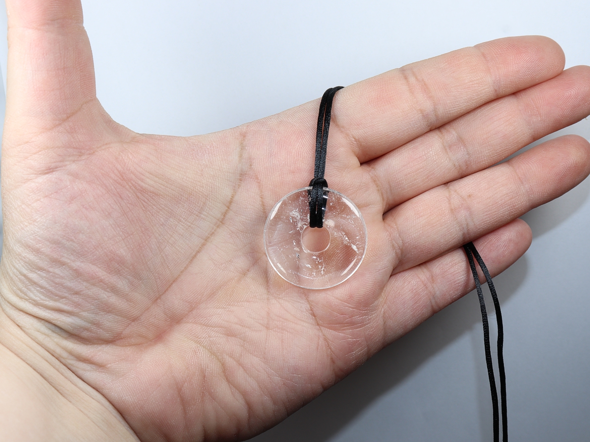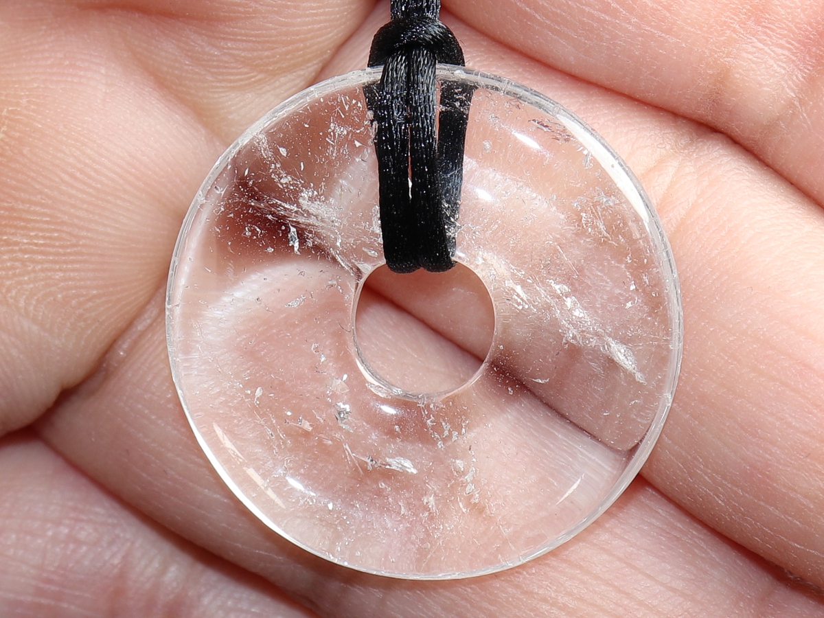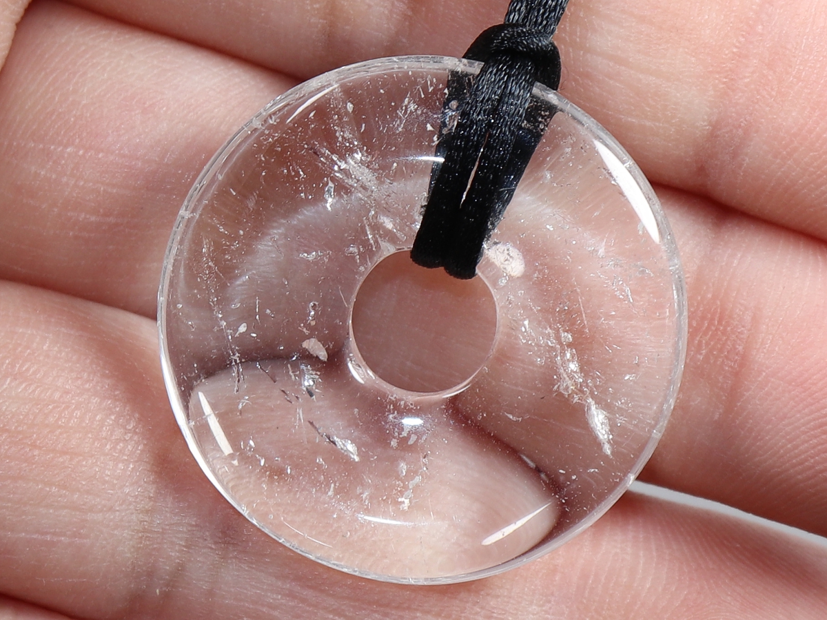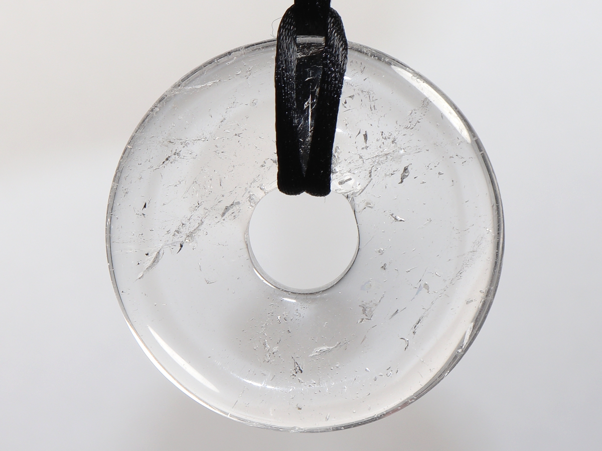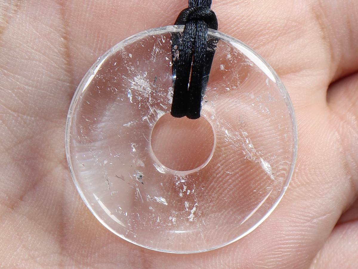 Die Halskette mit dem Donut aus Bergkristall und einem schwarzen Band wird nach Ihren Angaben individualisiert. Der Verschluss ist aus Edelstahl.