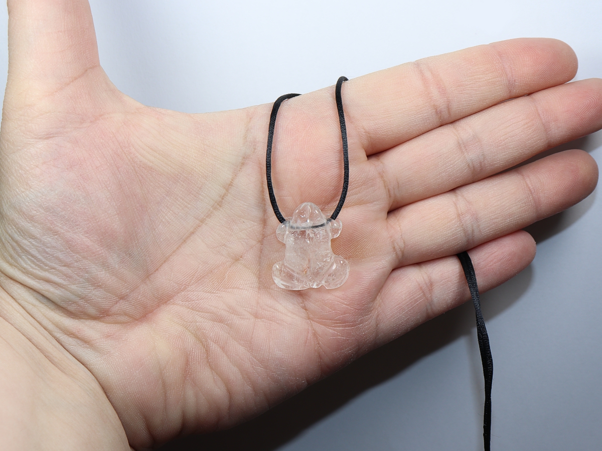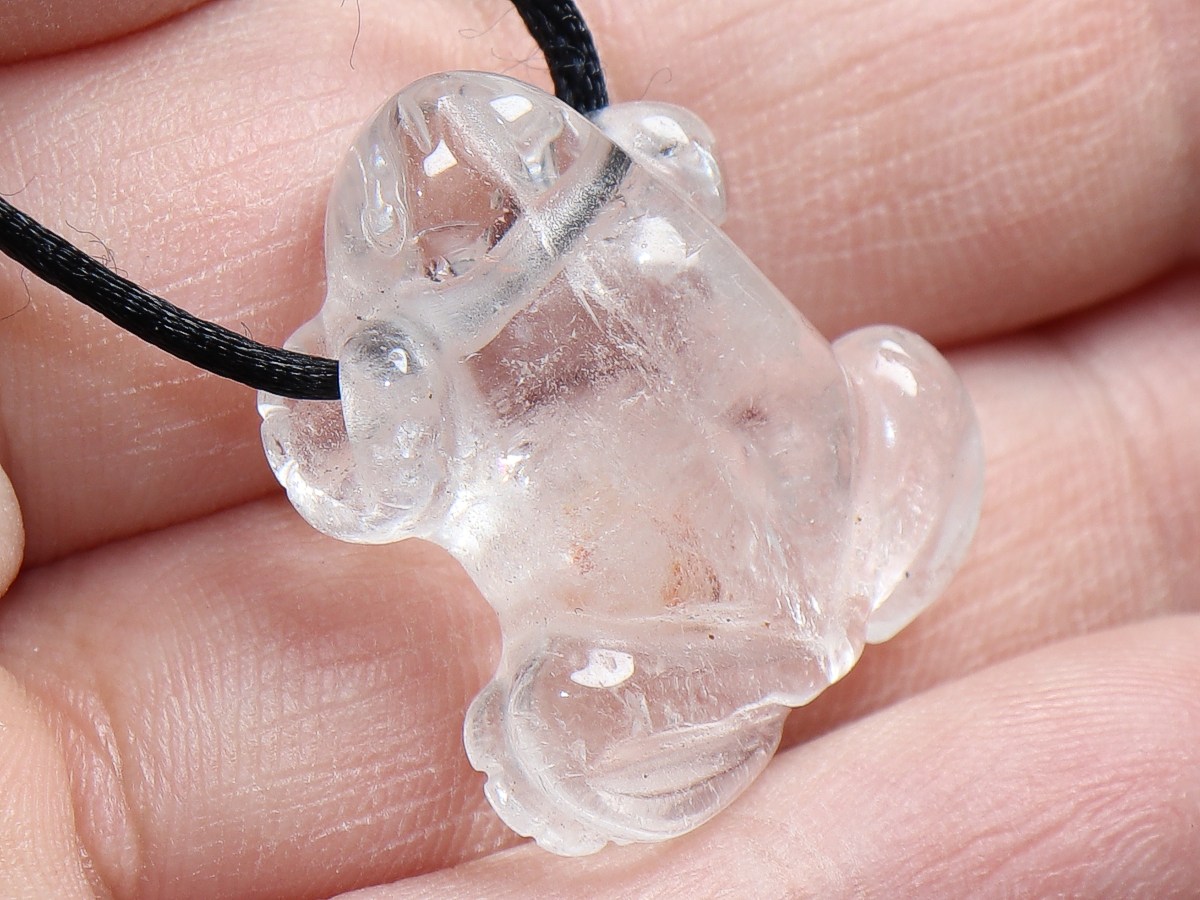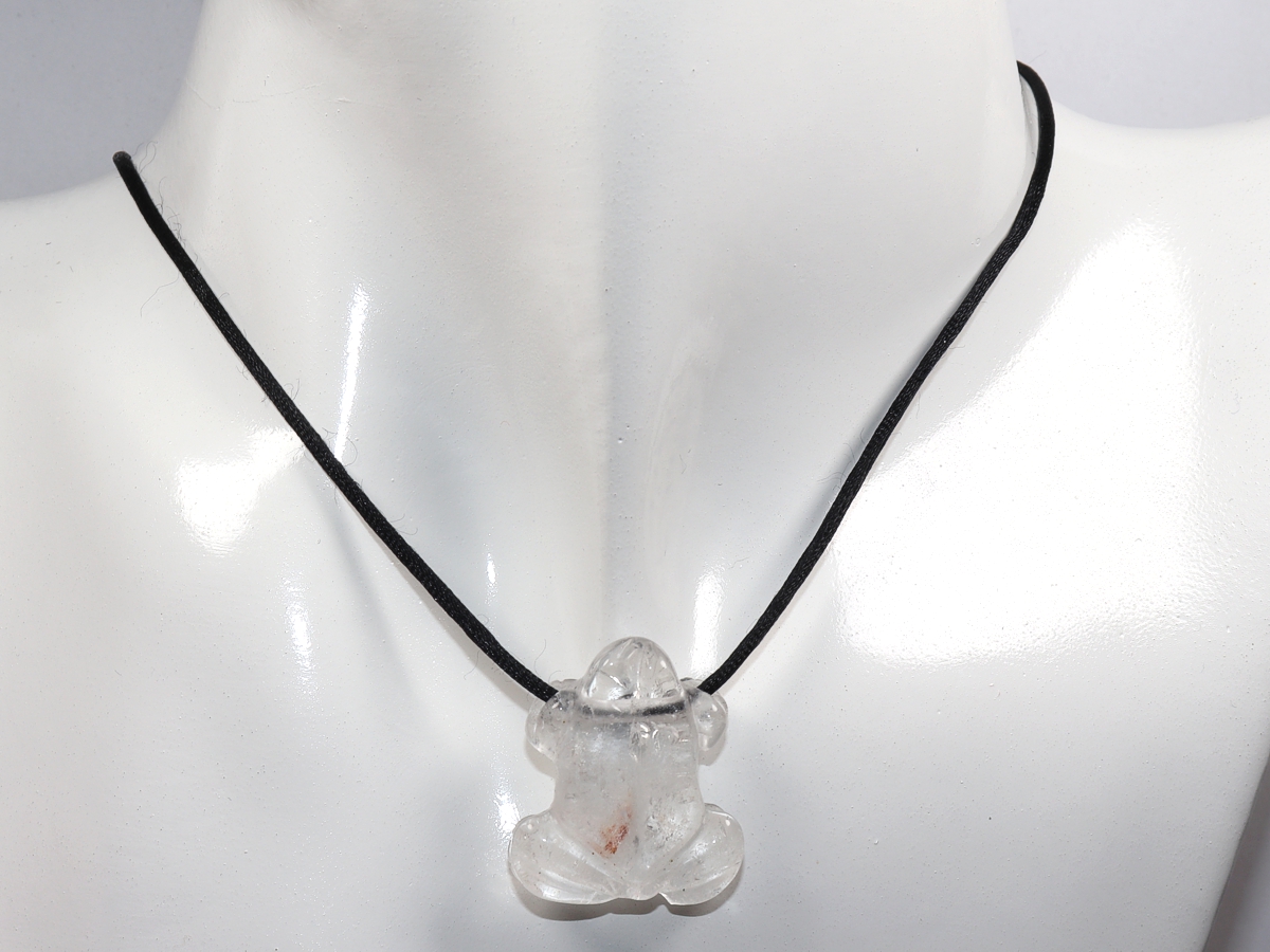 Die Halskette mit dem Frosch aus Bergkristall wird nach Ihren Angaben individualisiert. Sie haben die Wahl zwischen einem schwarzen Band mit einem Verschluss aus Edelstahl oder einer Kette aus Silber 925.
