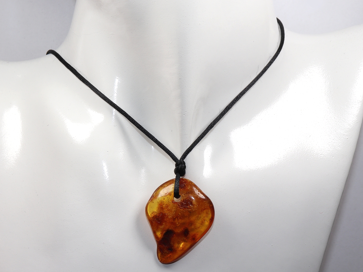 Die Halskette mit Bernstein und einem schwarzen Band wird nach Ihren Angaben individualisiert. Der Verschluss ist aus Edelstahl.