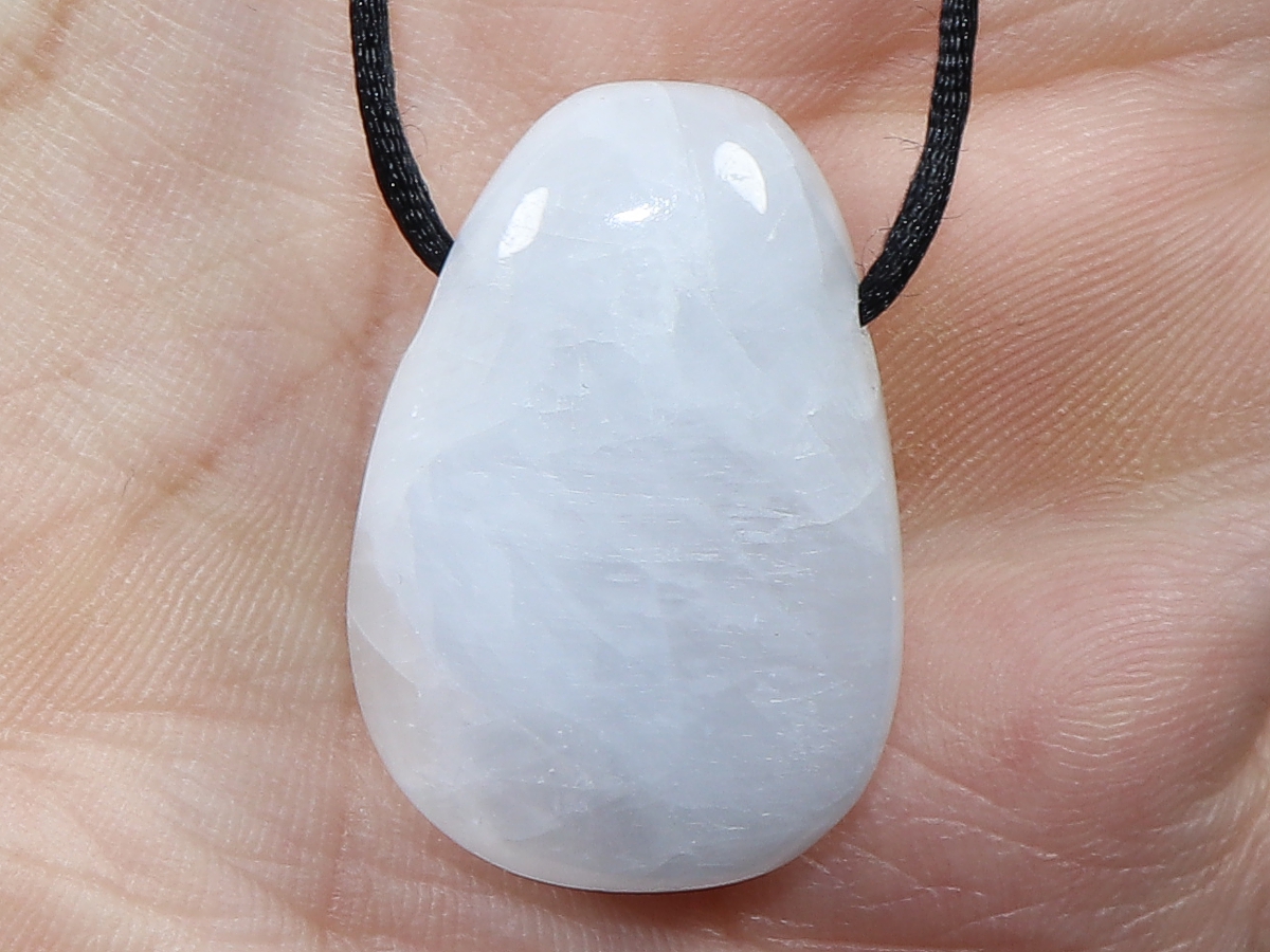 Die Halskette mit blauem Calcit wird nach Ihren Angaben individualisiert. Sie haben die Wahl zwischen einem schwarzen Band mit einem Verschluss aus Edelstahl oder einer Kette aus Silber 925.