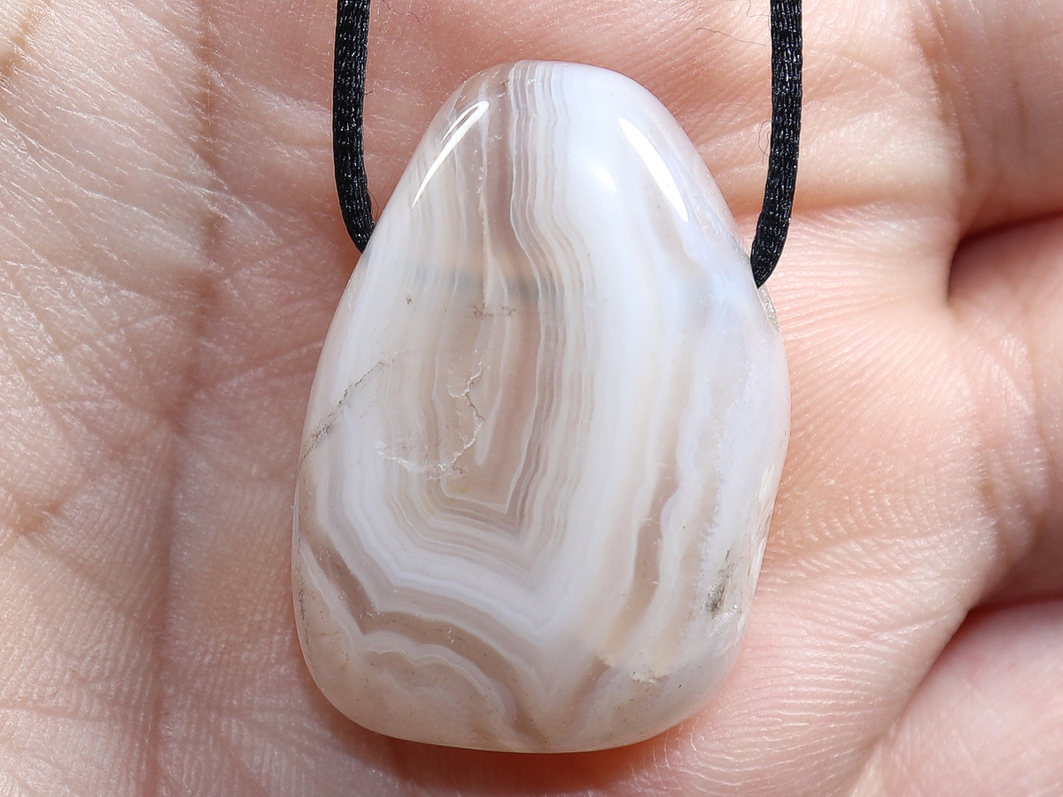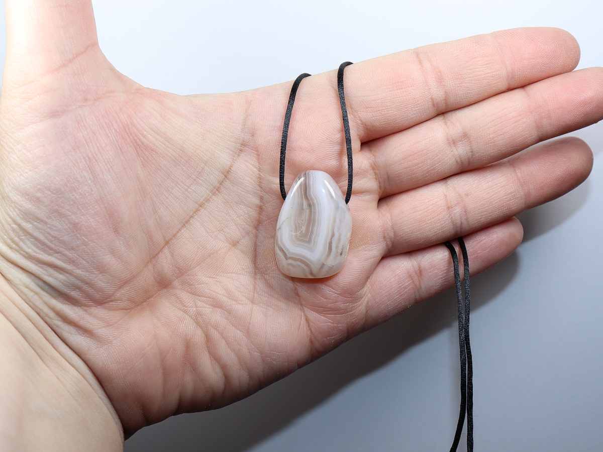 Die Halskette mit Botswana-Achat wird nach Ihren Angaben individualisiert. Sie haben die Wahl zwischen einem schwarzen Band mit einem Verschluss aus Edelstahl oder einer Kette aus Silber 925.