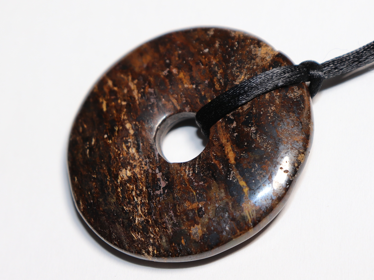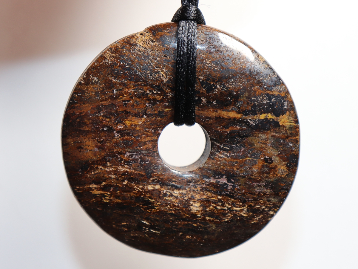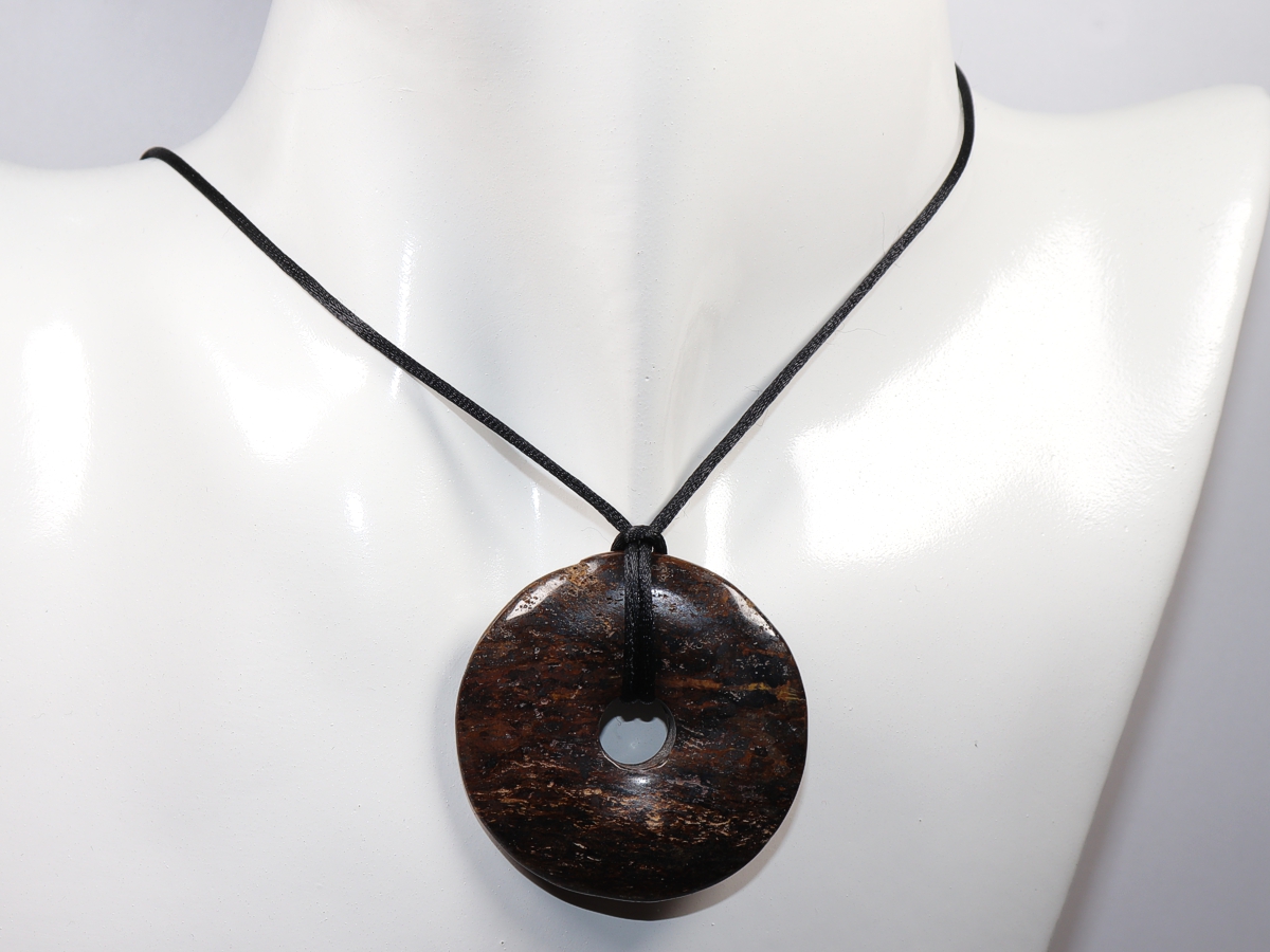 Die Halskette mit dem Donut aus Bronzit und einem schwarzen Band wird nach Ihren Angaben individualisiert. Der Verschluss ist aus Edelstahl.