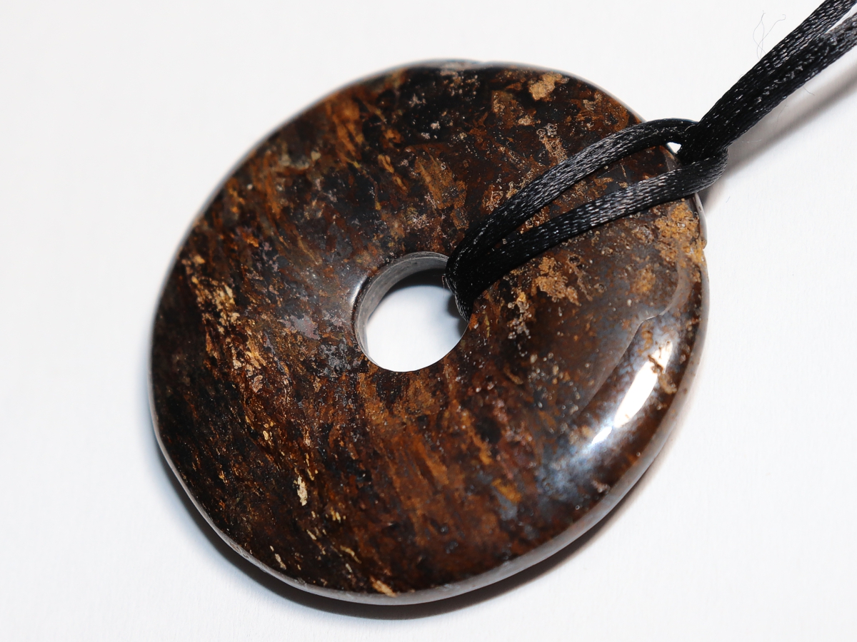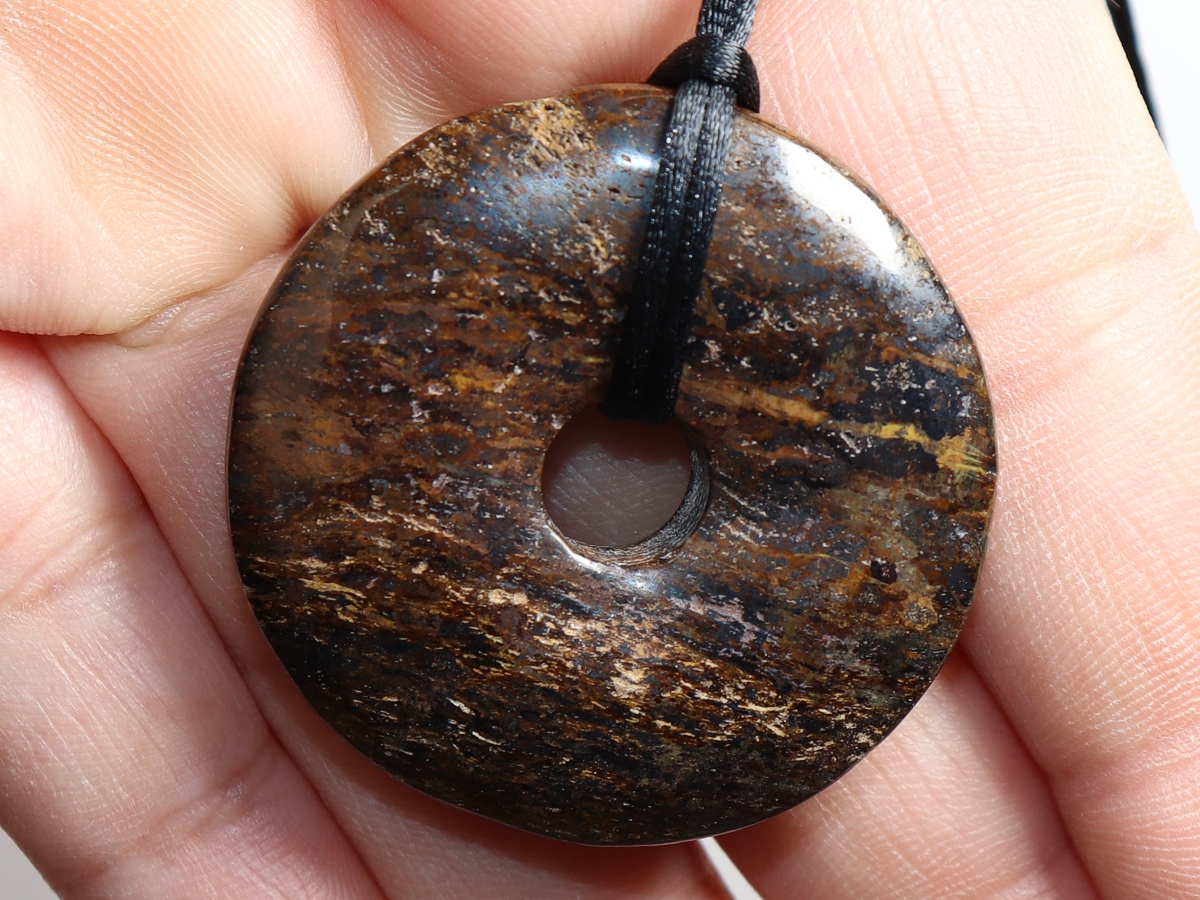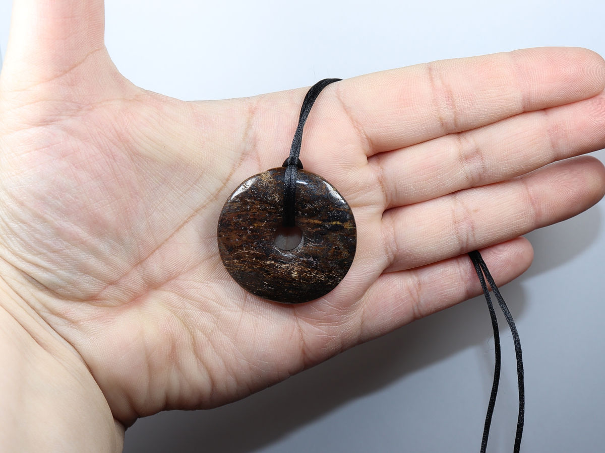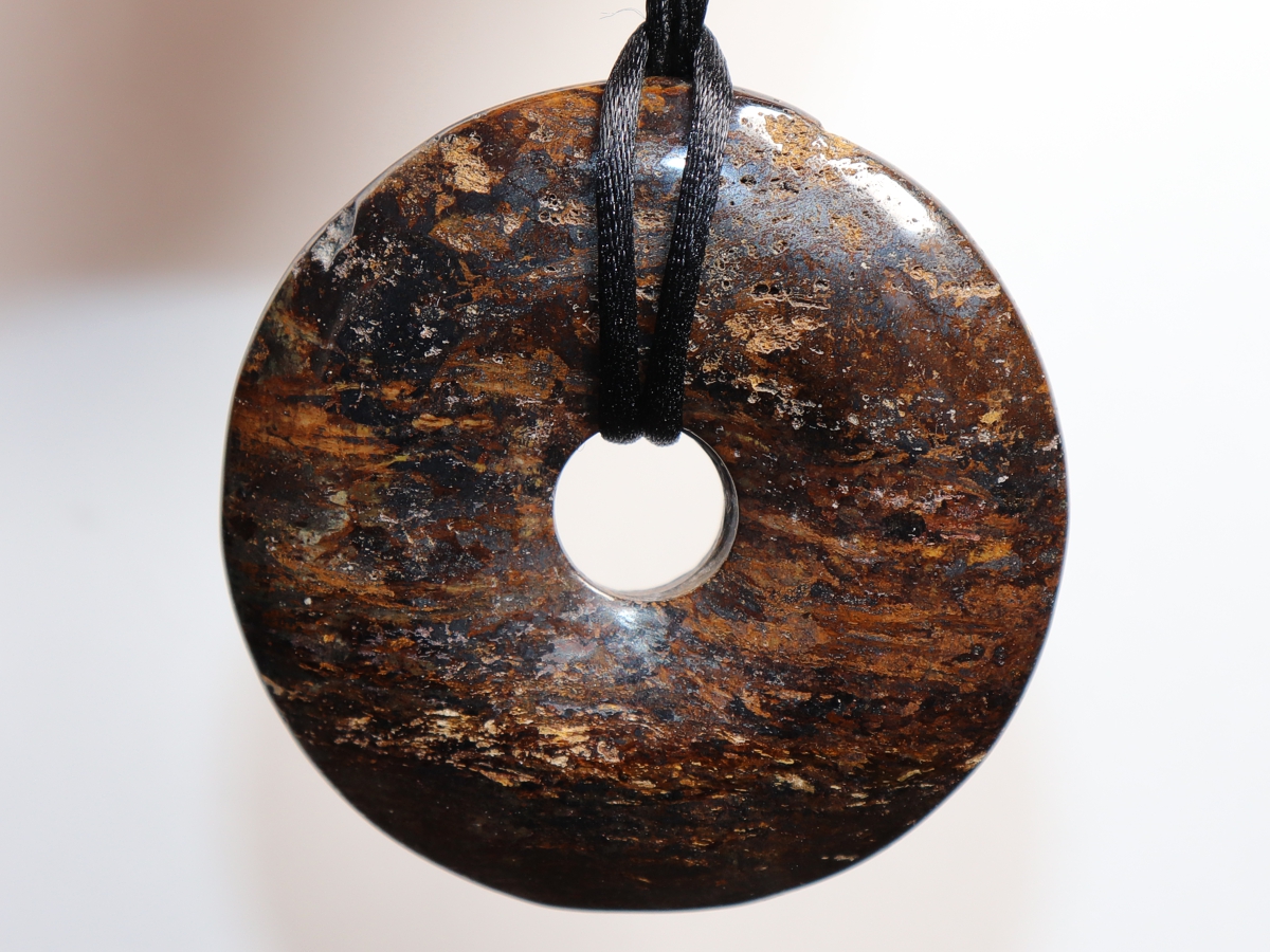 Die Halskette mit dem Donut aus Bronzit und einem schwarzen Band wird nach Ihren Angaben individualisiert. Der Verschluss ist aus Edelstahl.