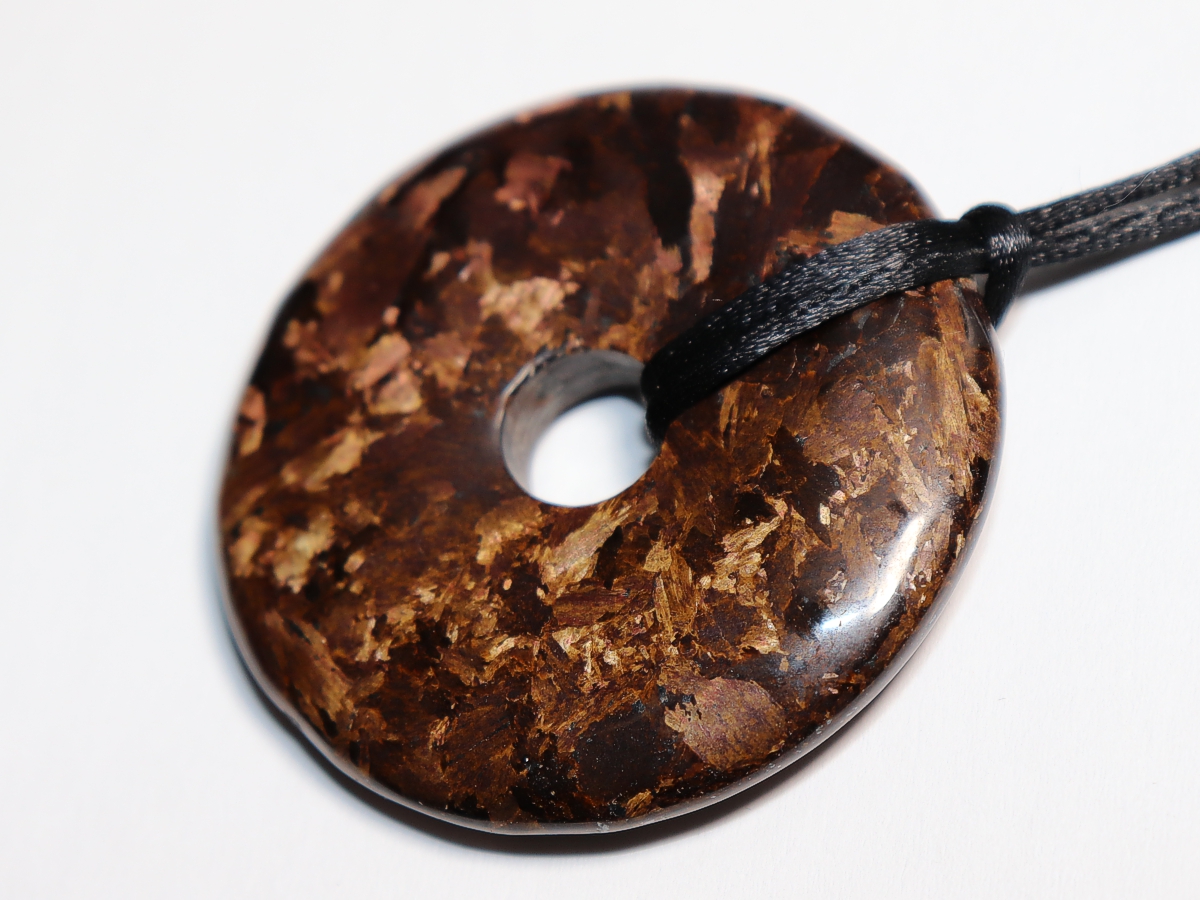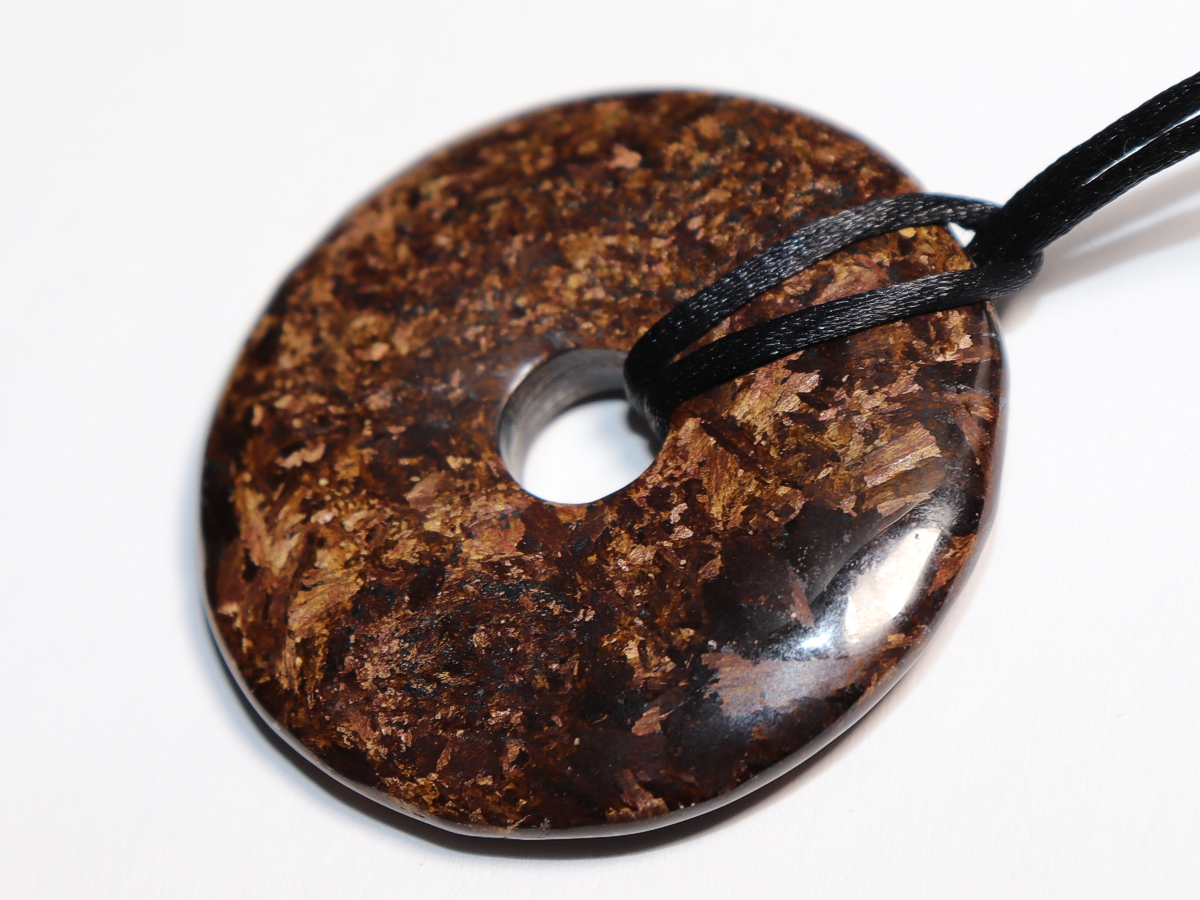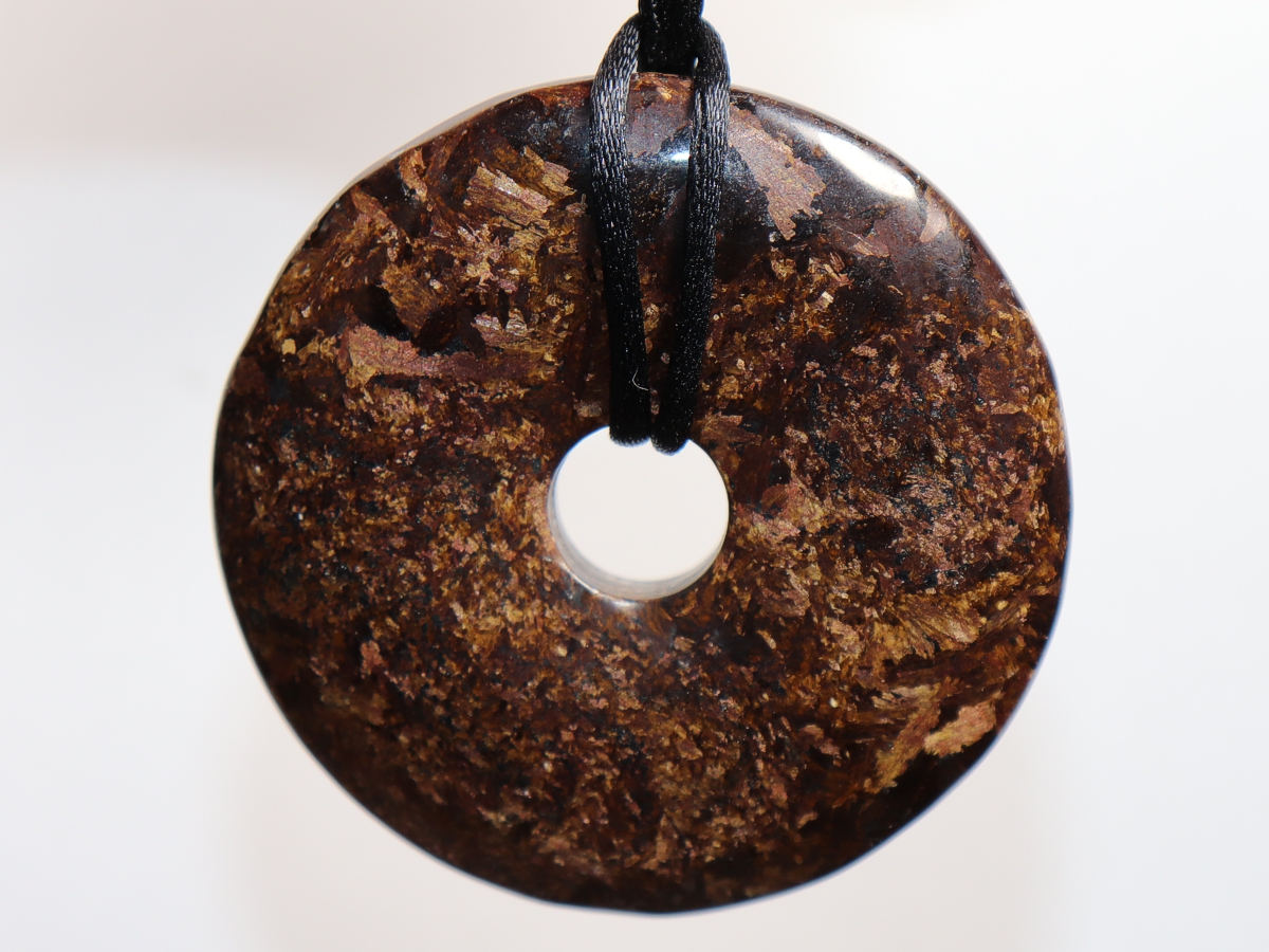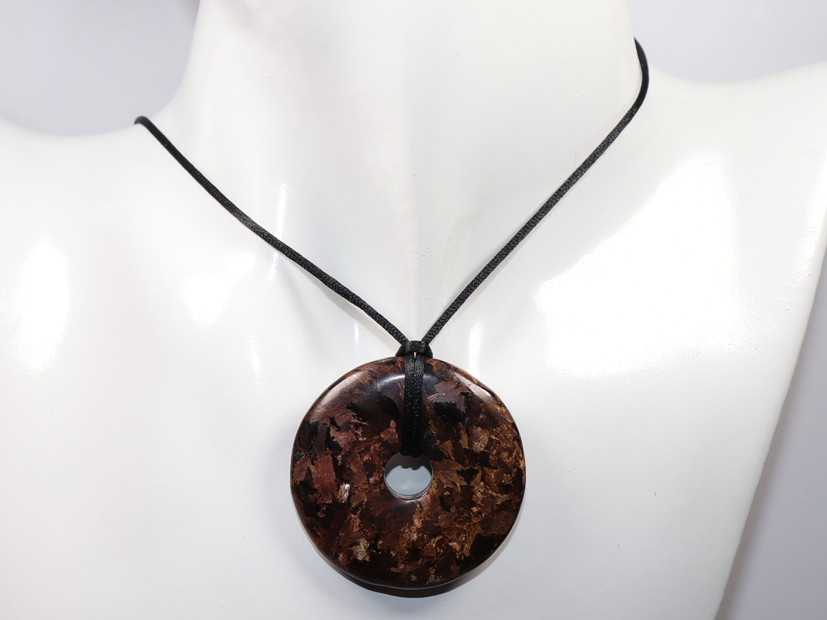 Die Halskette mit dem Donut aus Bronzit und einem schwarzen Band wird nach Ihren Angaben individualisiert. Der Verschluss ist aus Edelstahl.