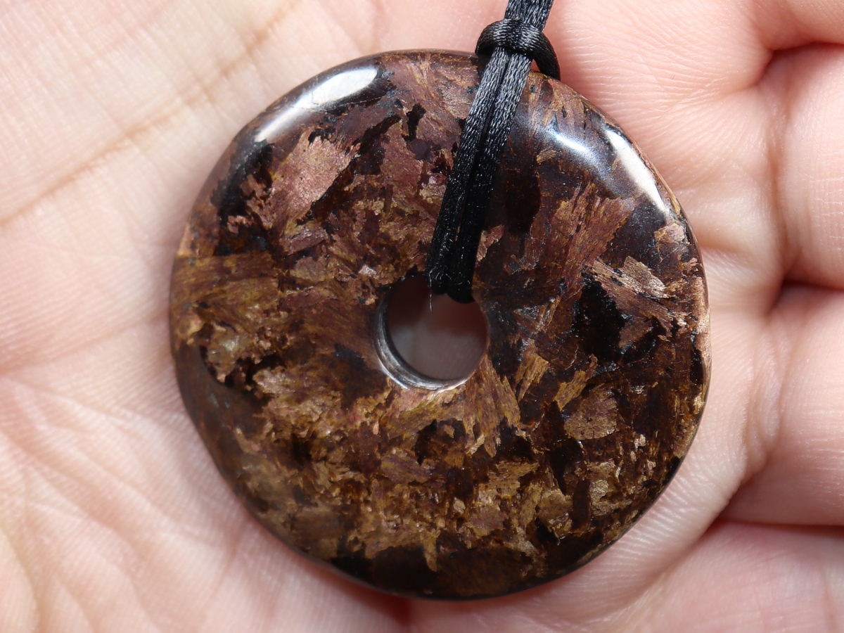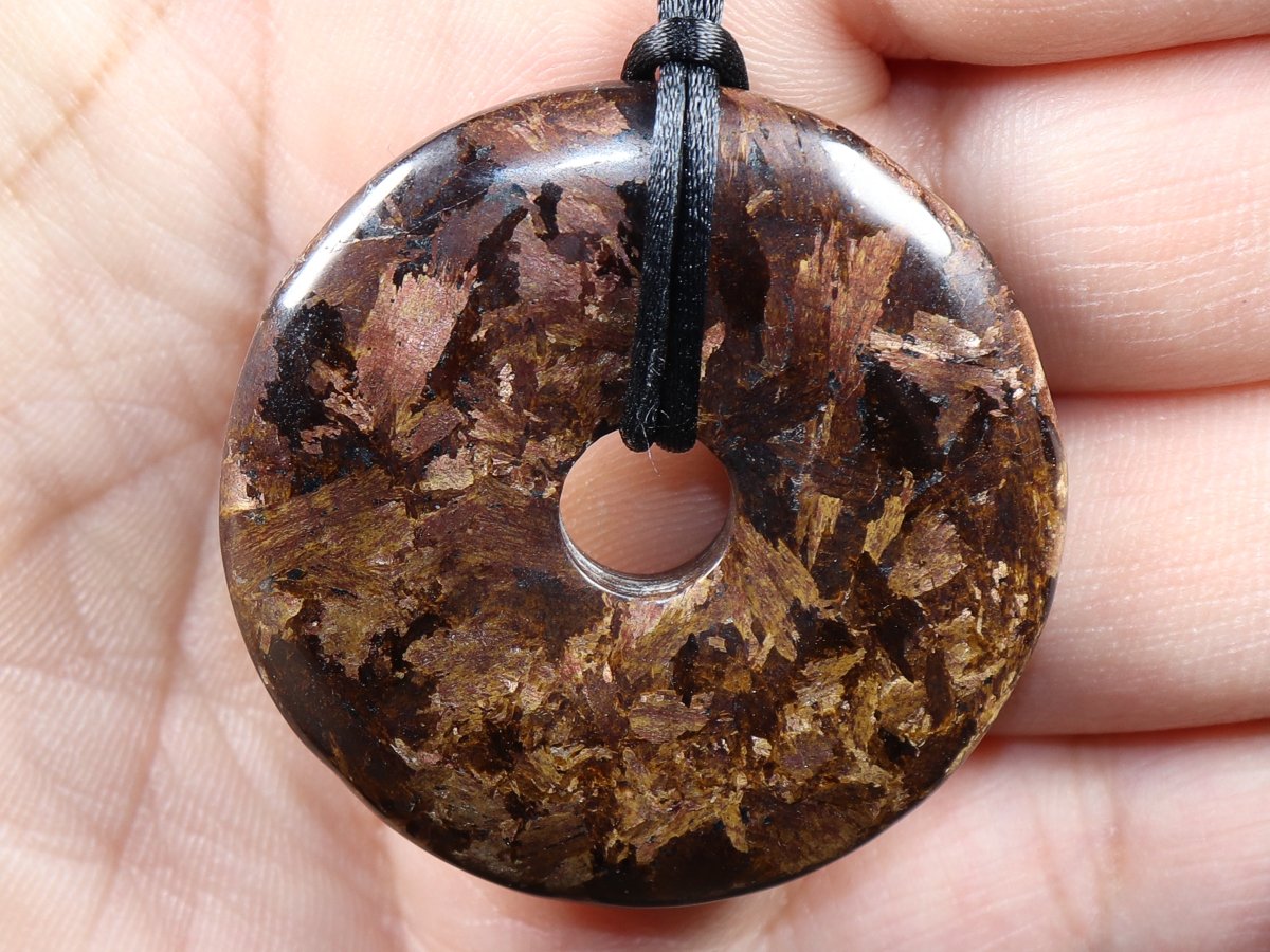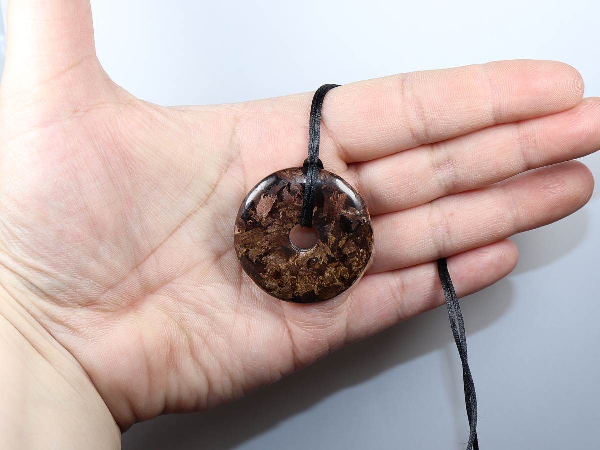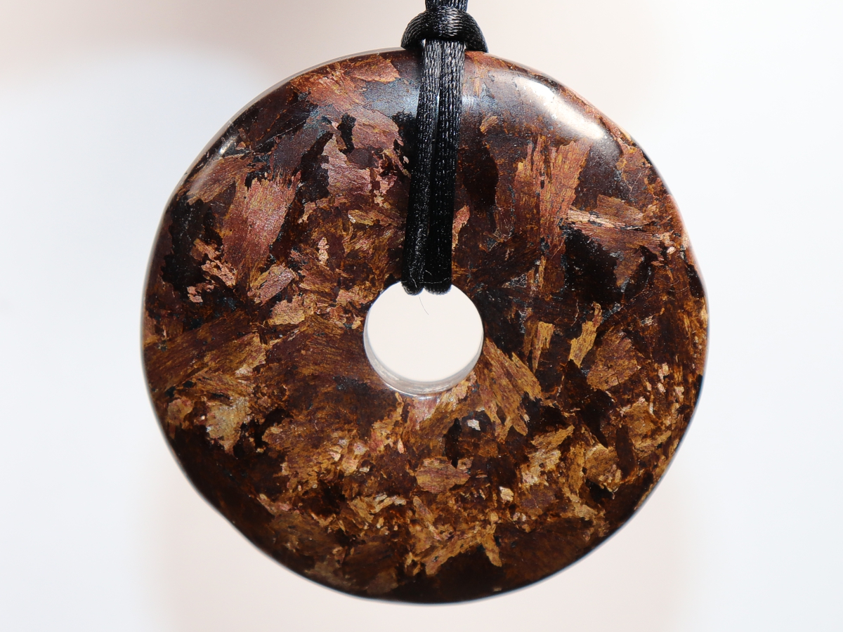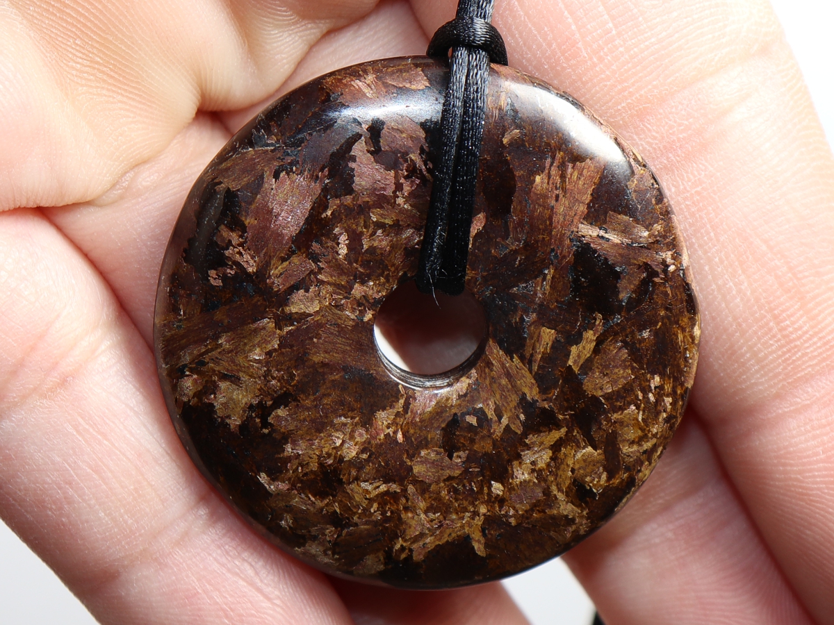 Die Halskette mit dem Donut aus Bronzit und einem schwarzen Band wird nach Ihren Angaben individualisiert. Der Verschluss ist aus Edelstahl.