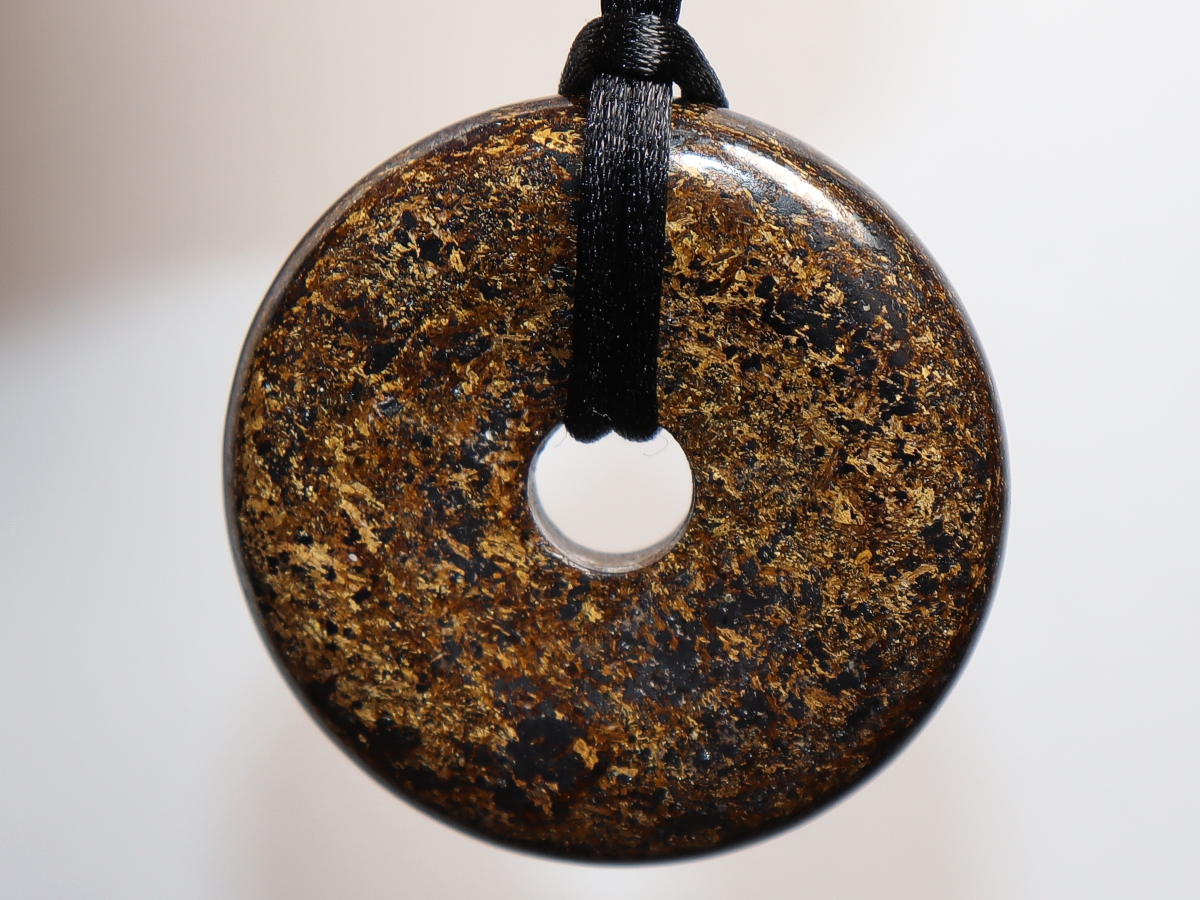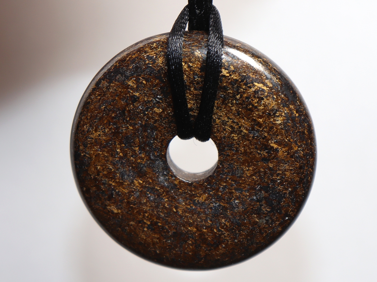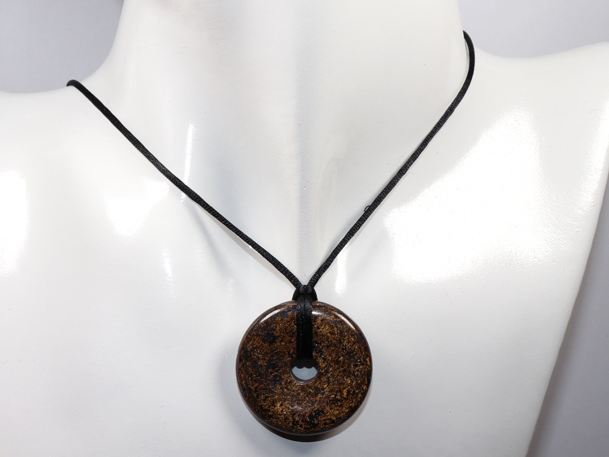 Die Halskette mit dem Donut aus Bronzit und einem schwarzen Band wird nach Ihren Angaben individualisiert. Der Verschluss ist aus Edelstahl.