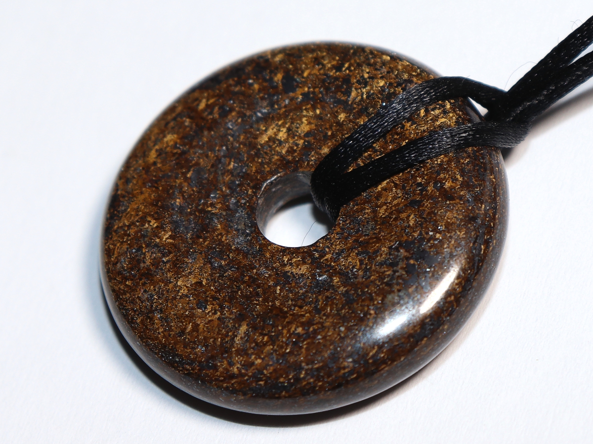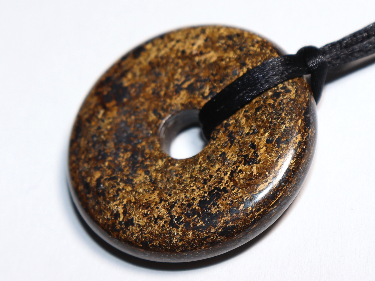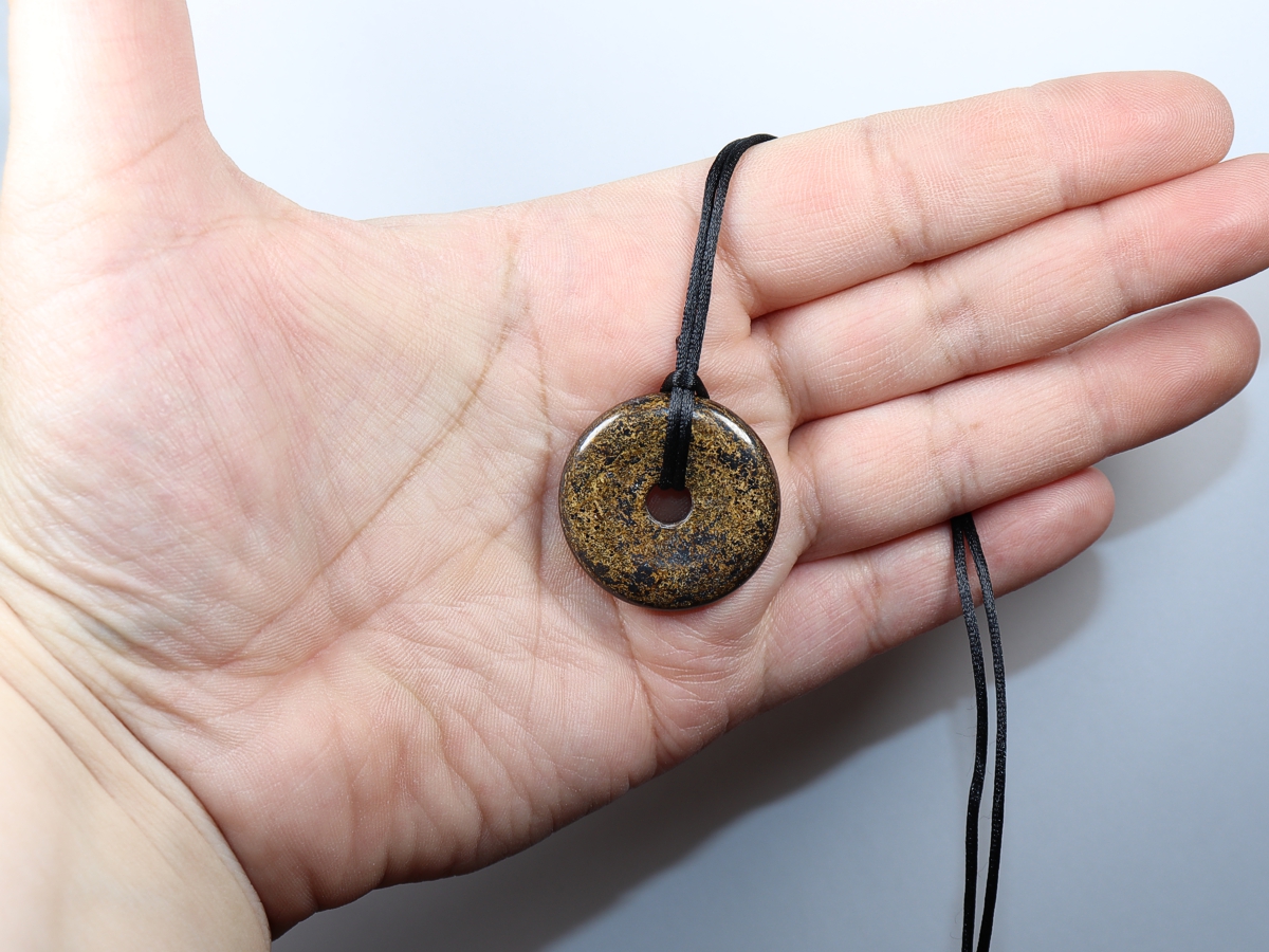 Die Halskette mit dem Donut aus Bronzit und einem schwarzen Band wird nach Ihren Angaben individualisiert. Der Verschluss ist aus Edelstahl.
