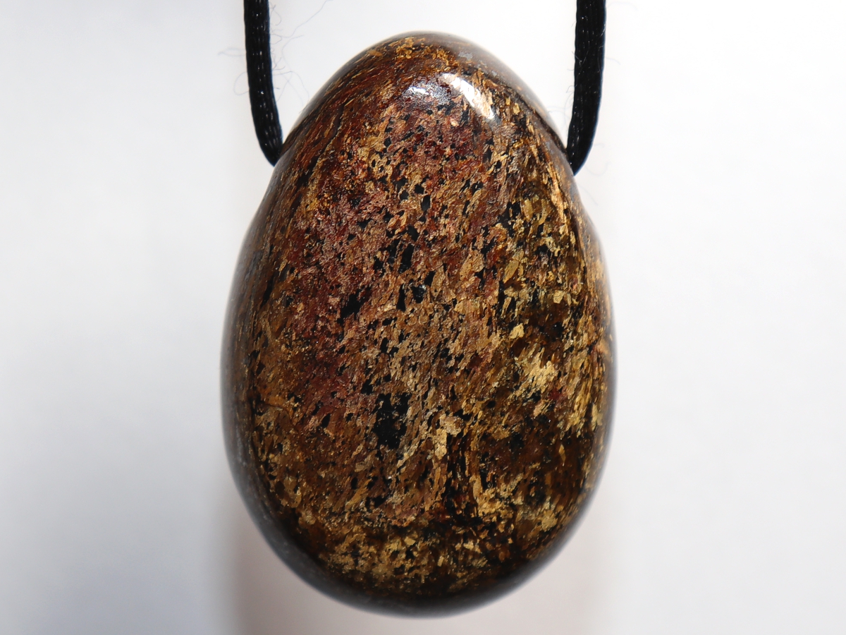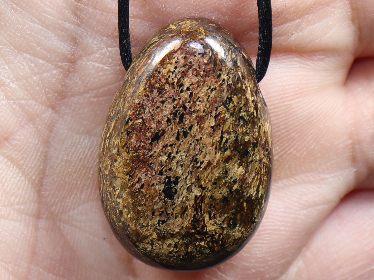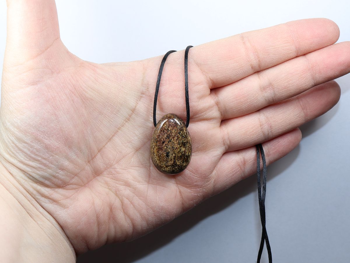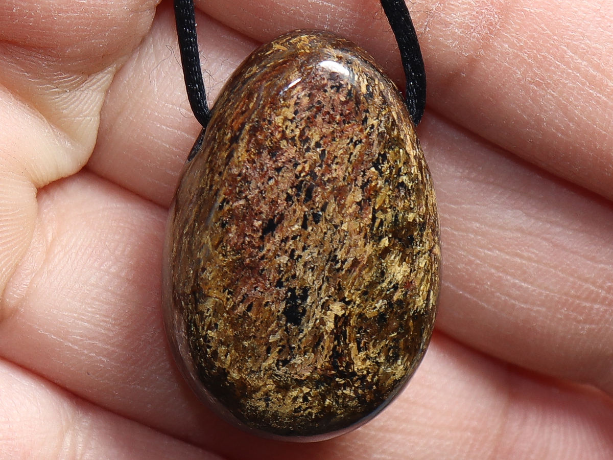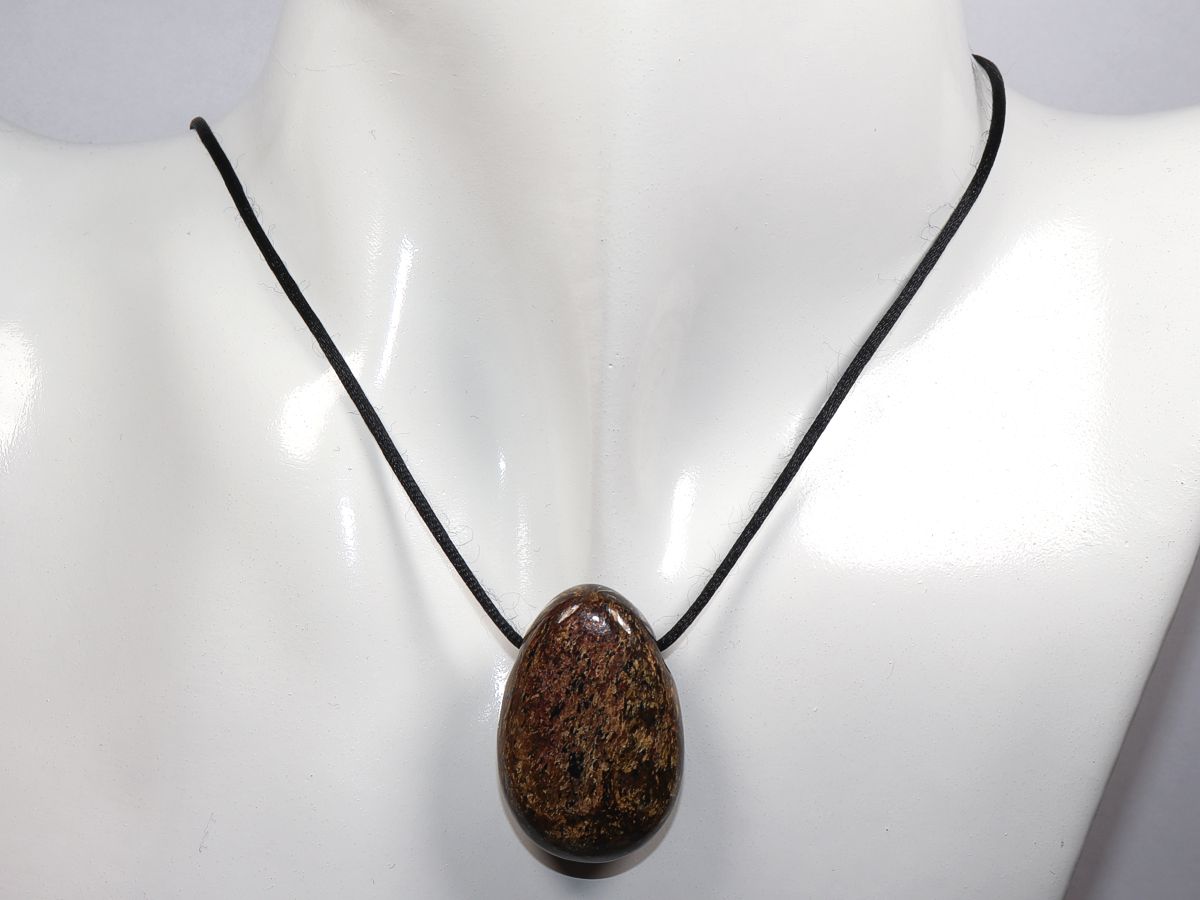 Die Halskette mit Bronzit wird nach Ihren Angaben individualisiert. Sie haben die Wahl zwischen einem schwarzen Band mit einem Verschluss aus Edelstahl oder einer Kette aus Silber 925.