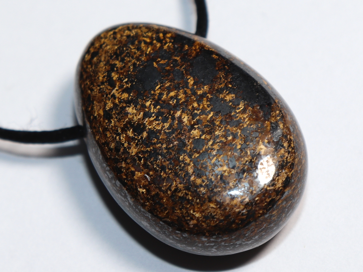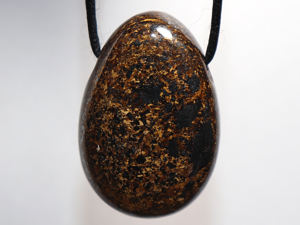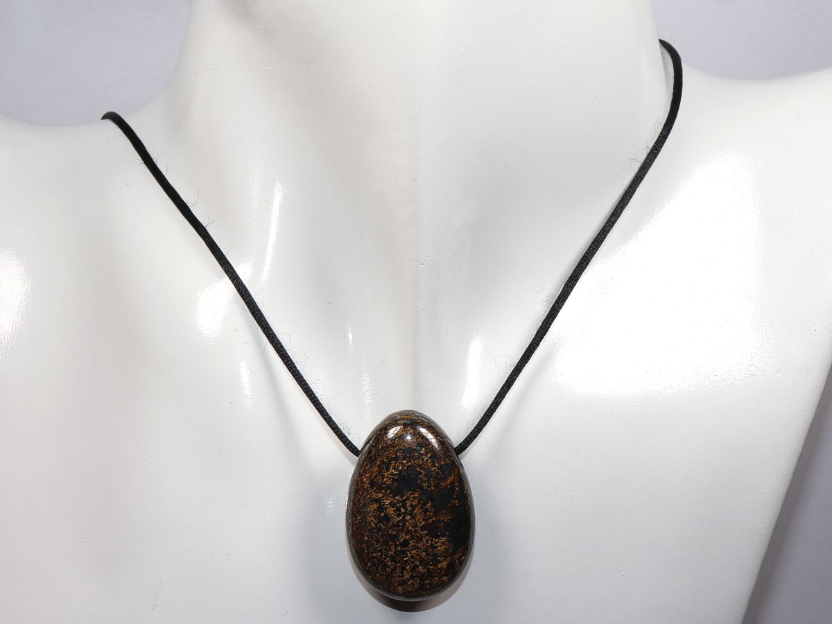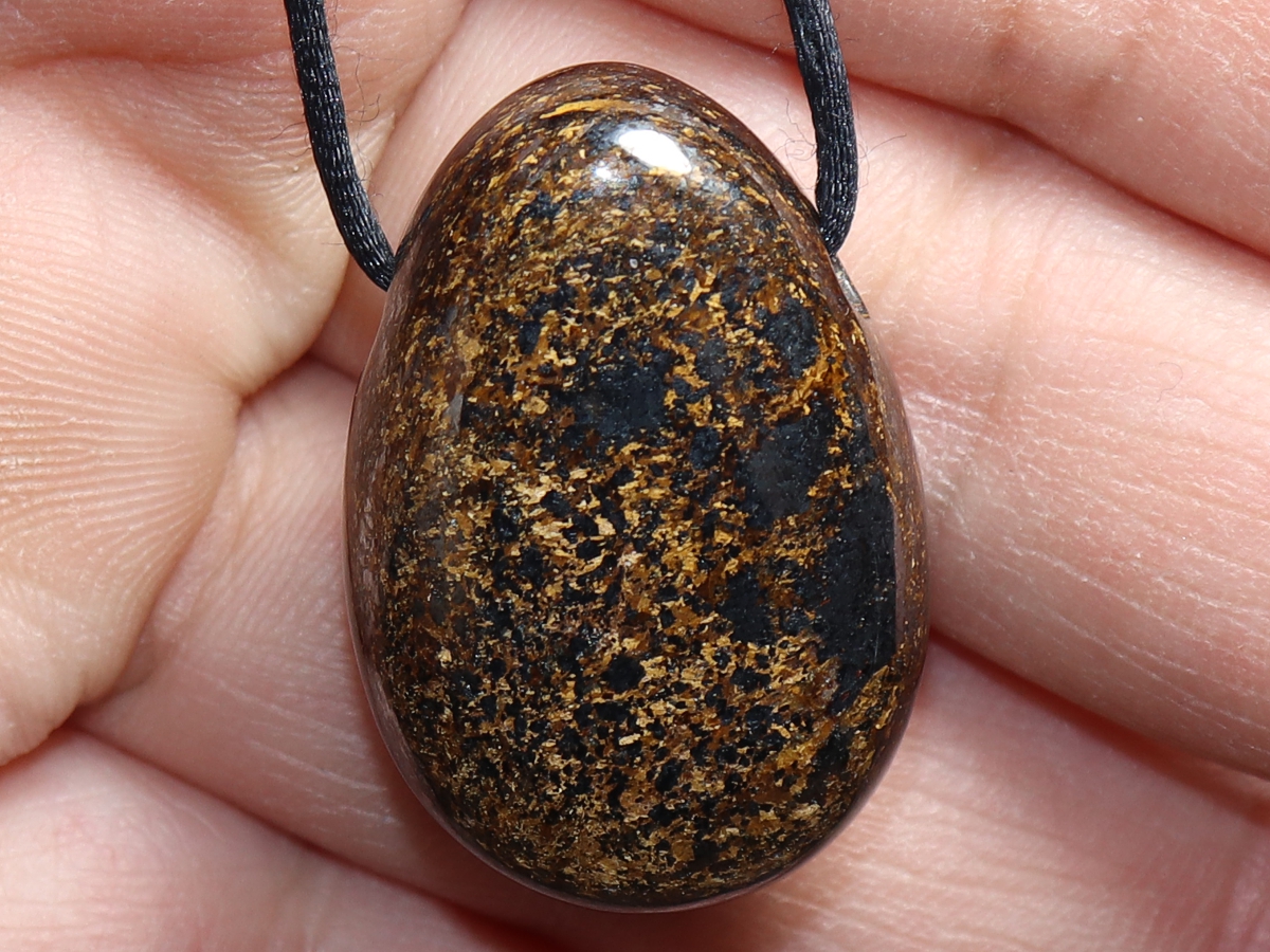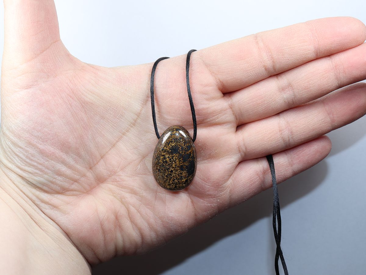 Die Halskette mit Bronzit wird nach Ihren Angaben individualisiert. Sie haben die Wahl zwischen einem schwarzen Band mit einem Verschluss aus Edelstahl oder einer Kette aus Silber 925.