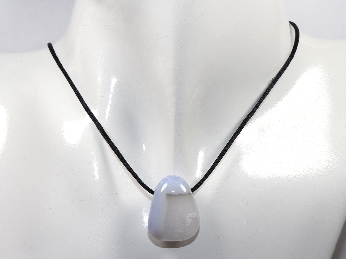 Die Halskette mit Chalcedon wird nach Ihren Angaben individualisiert. Sie haben die Wahl zwischen einem schwarzen Band mit einem Verschluss aus Edelstahl oder einer Kette aus Silber 925.