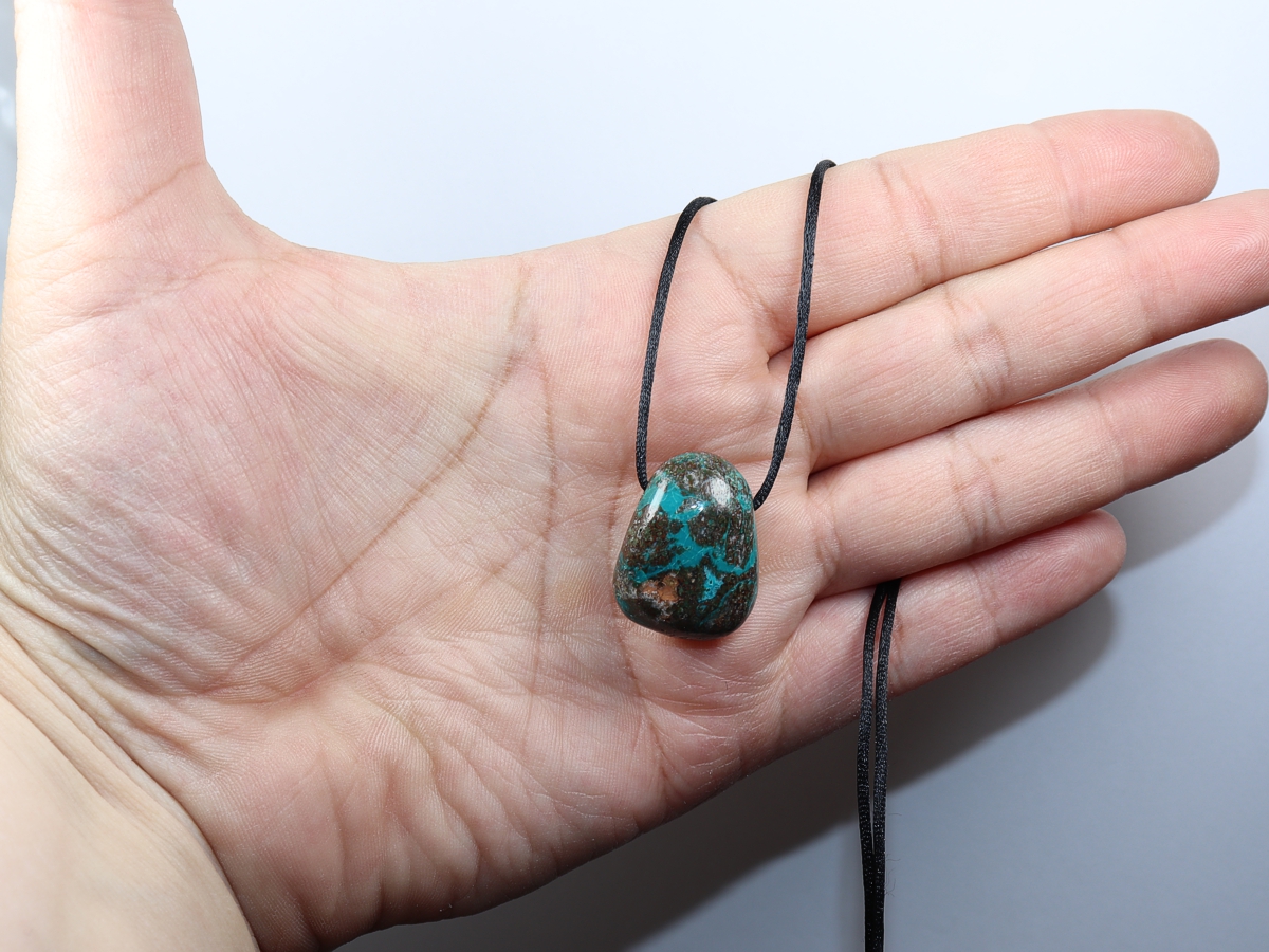 Die Halskette mit Chrysokoll wird nach Ihren Angaben individualisiert. Sie haben die Wahl zwischen einem schwarzen Band mit einem Verschluss aus Edelstahl oder einer Kette aus Silber 925.
