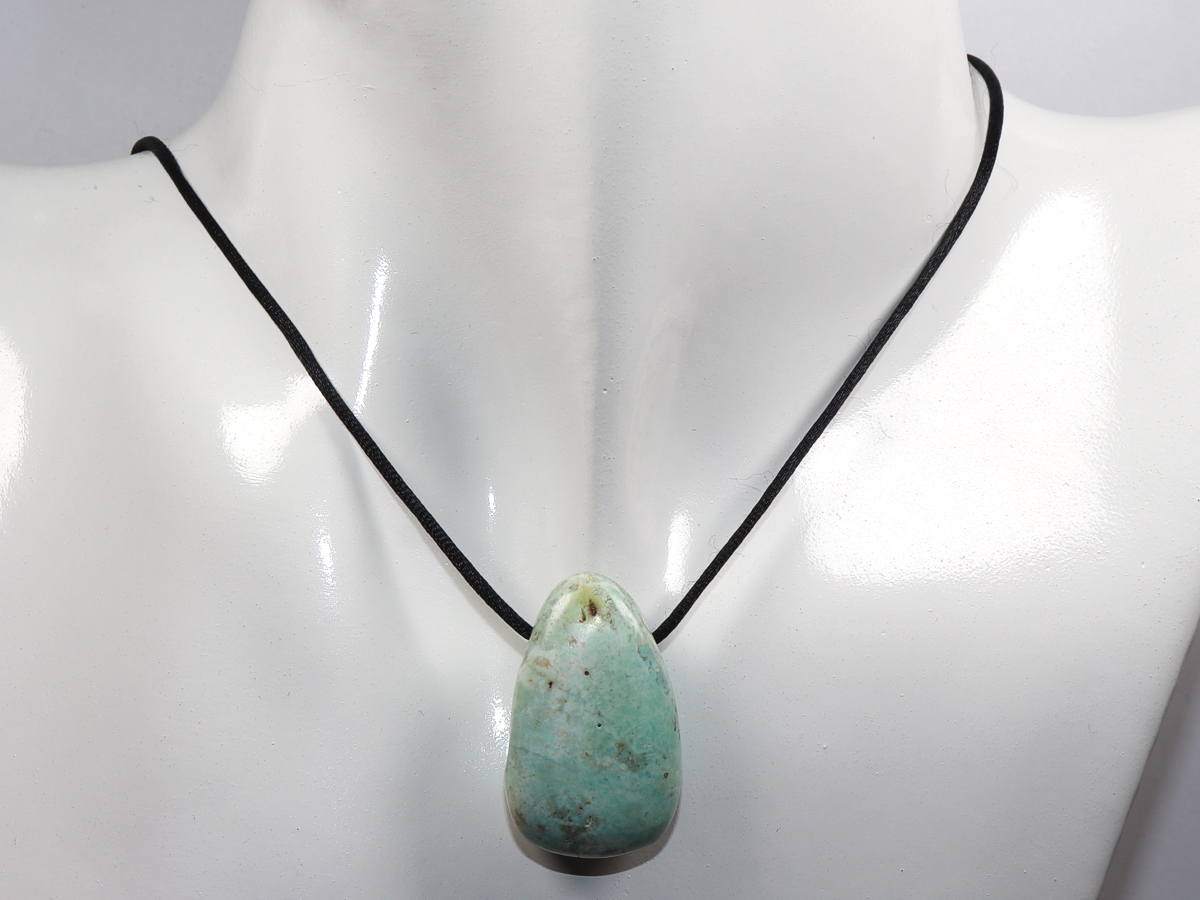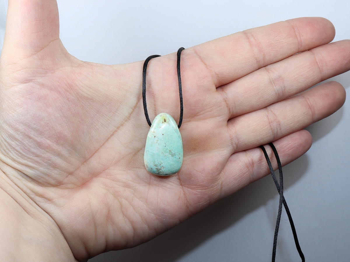 Die Halskette mit Chrysokoll wird nach Ihren Angaben individualisiert. Sie haben die Wahl zwischen einem schwarzen Band mit einem Verschluss aus Edelstahl oder einer Kette aus Silber 925.