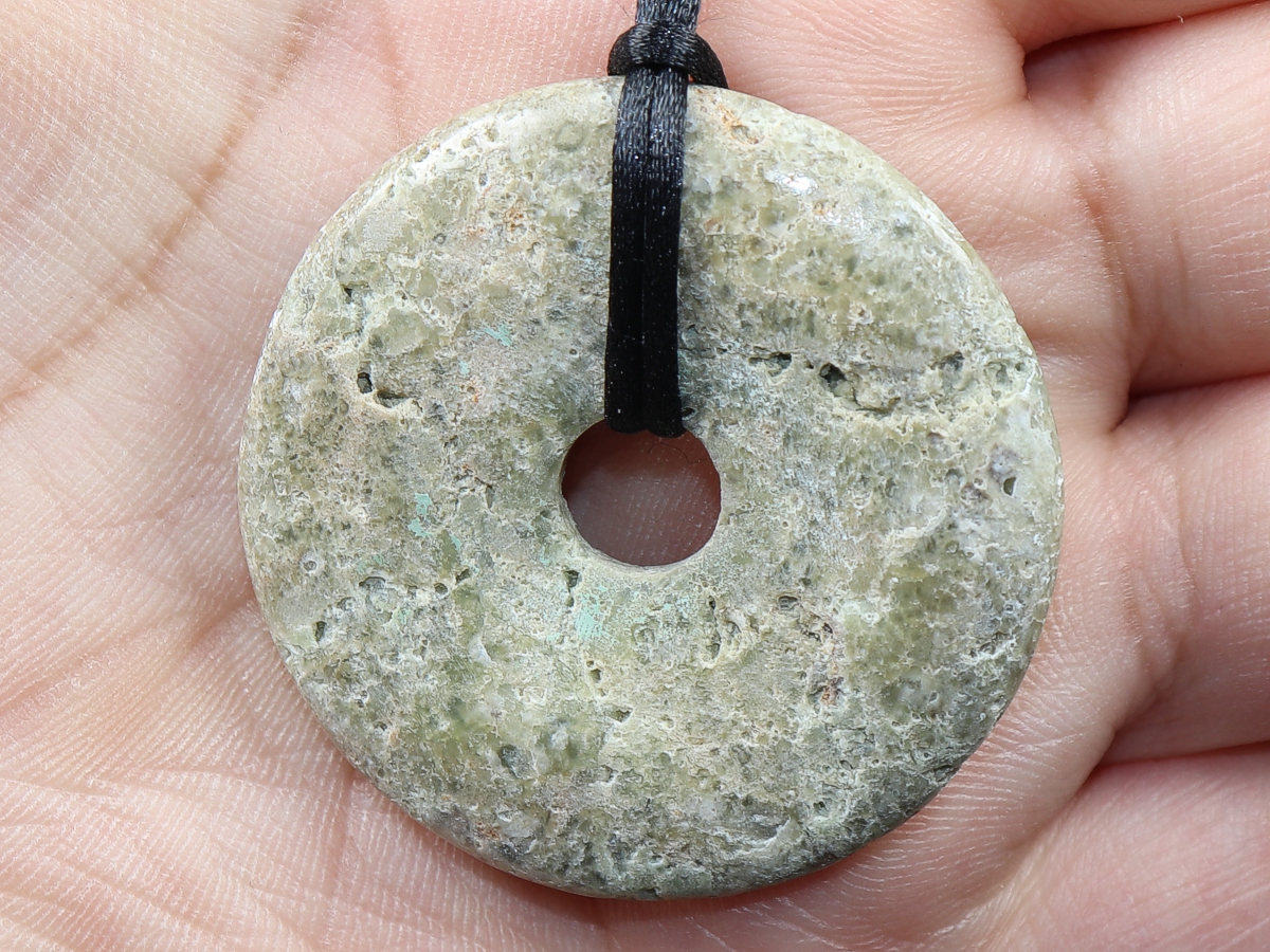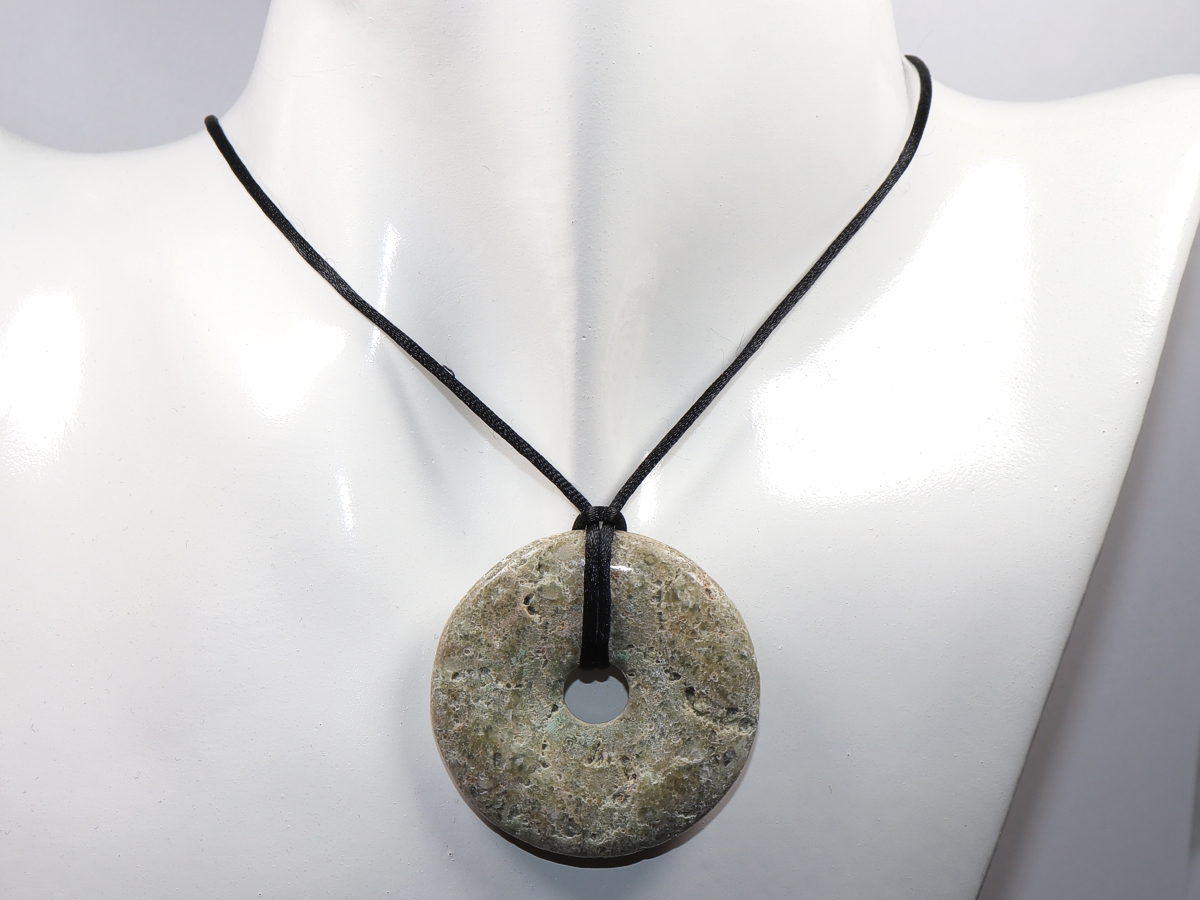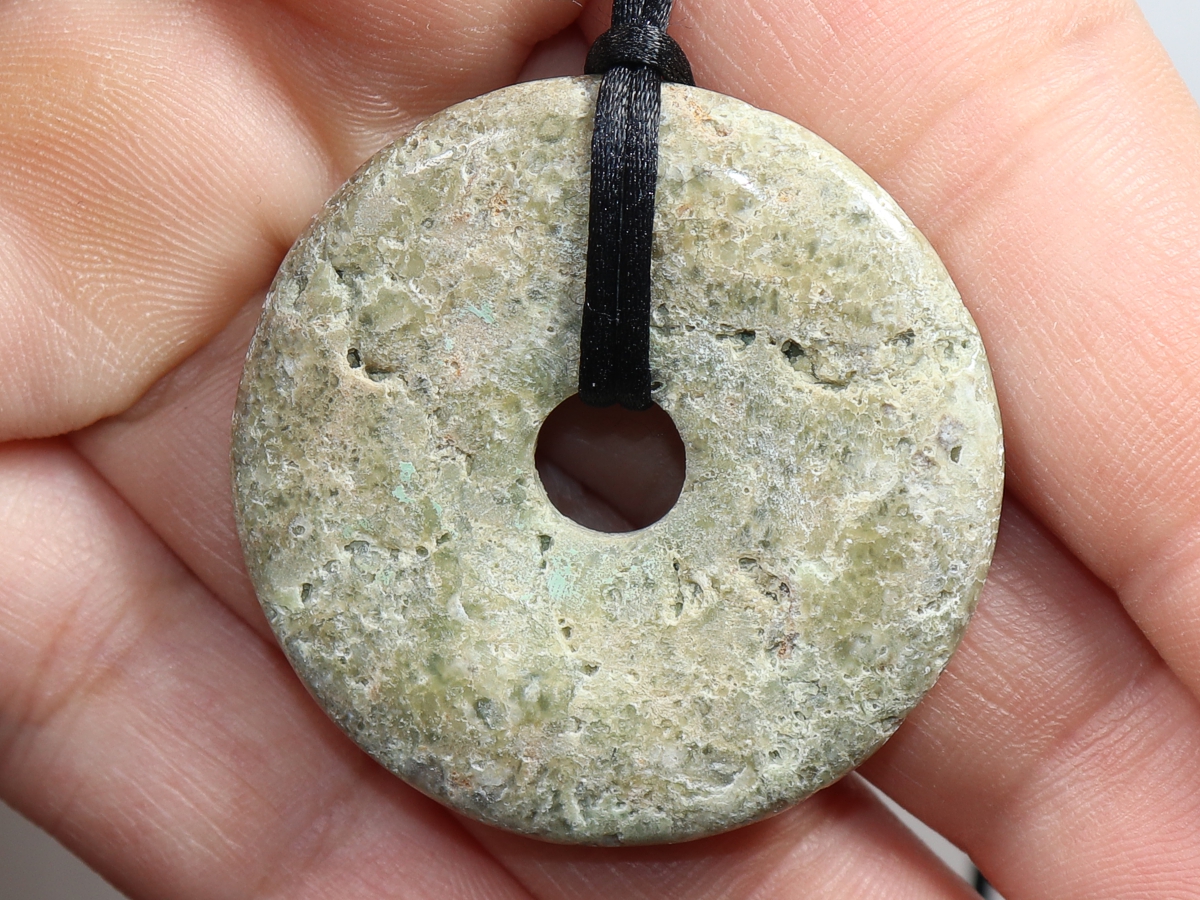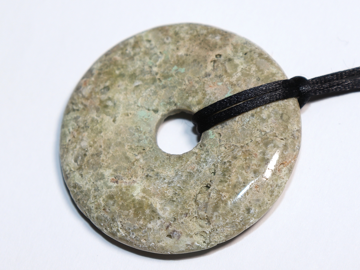 Die Halskette mit dem Donut aus Chrysopras und einem schwarzen Band wird nach Ihren Angaben individualisiert. Der Verschluss ist aus Edelstahl.