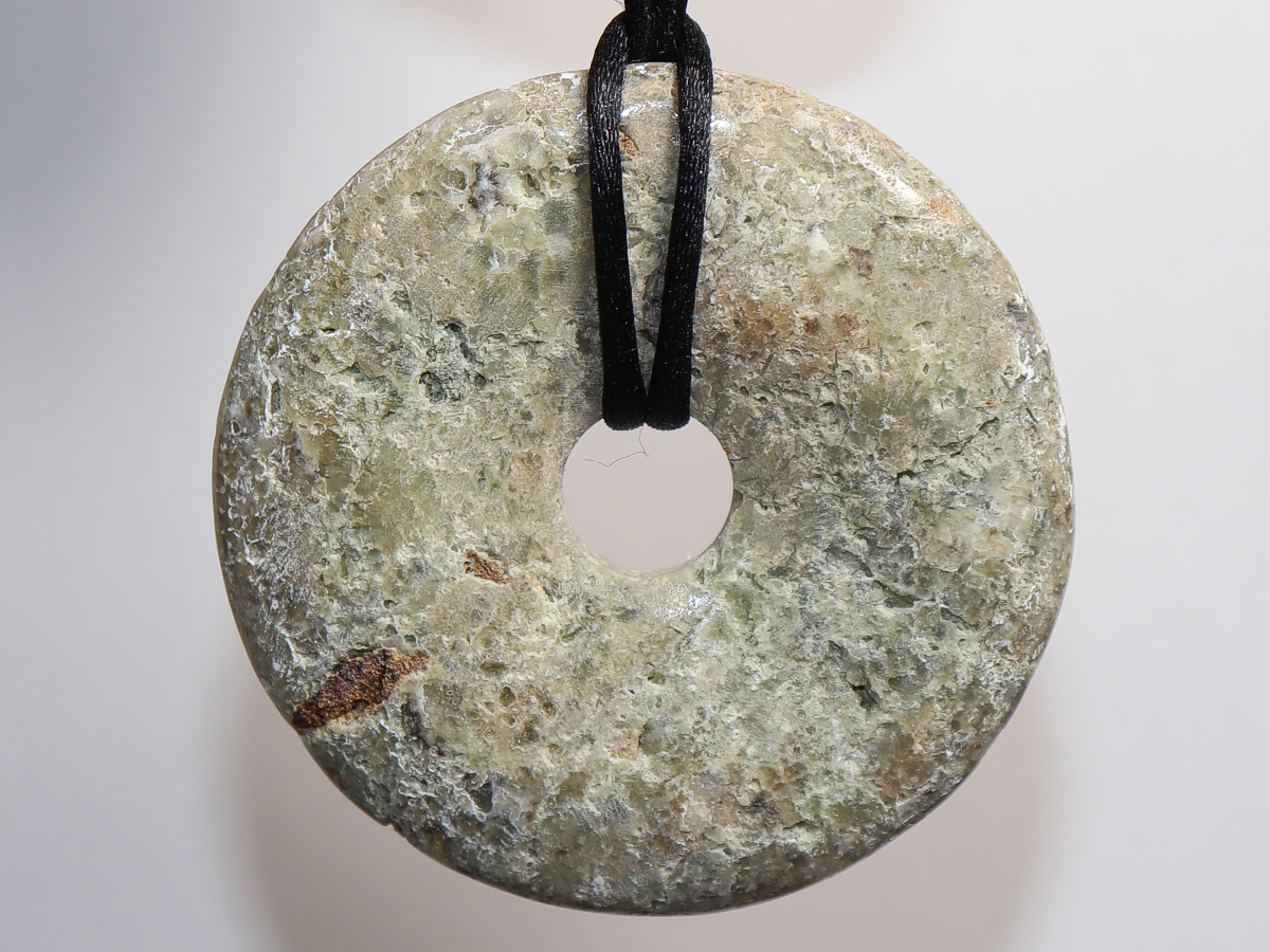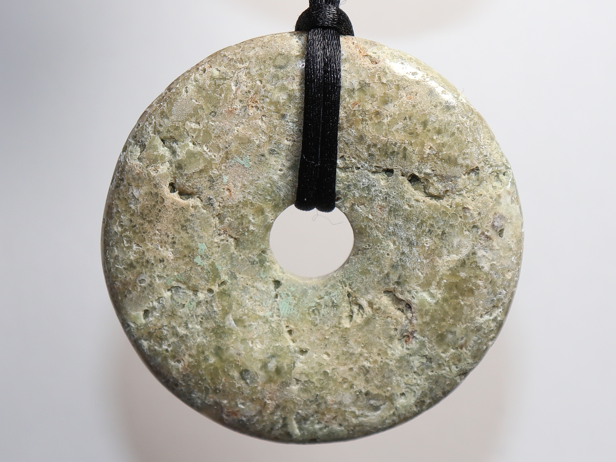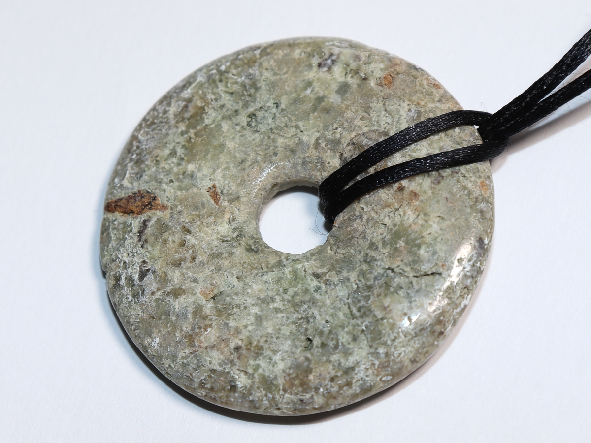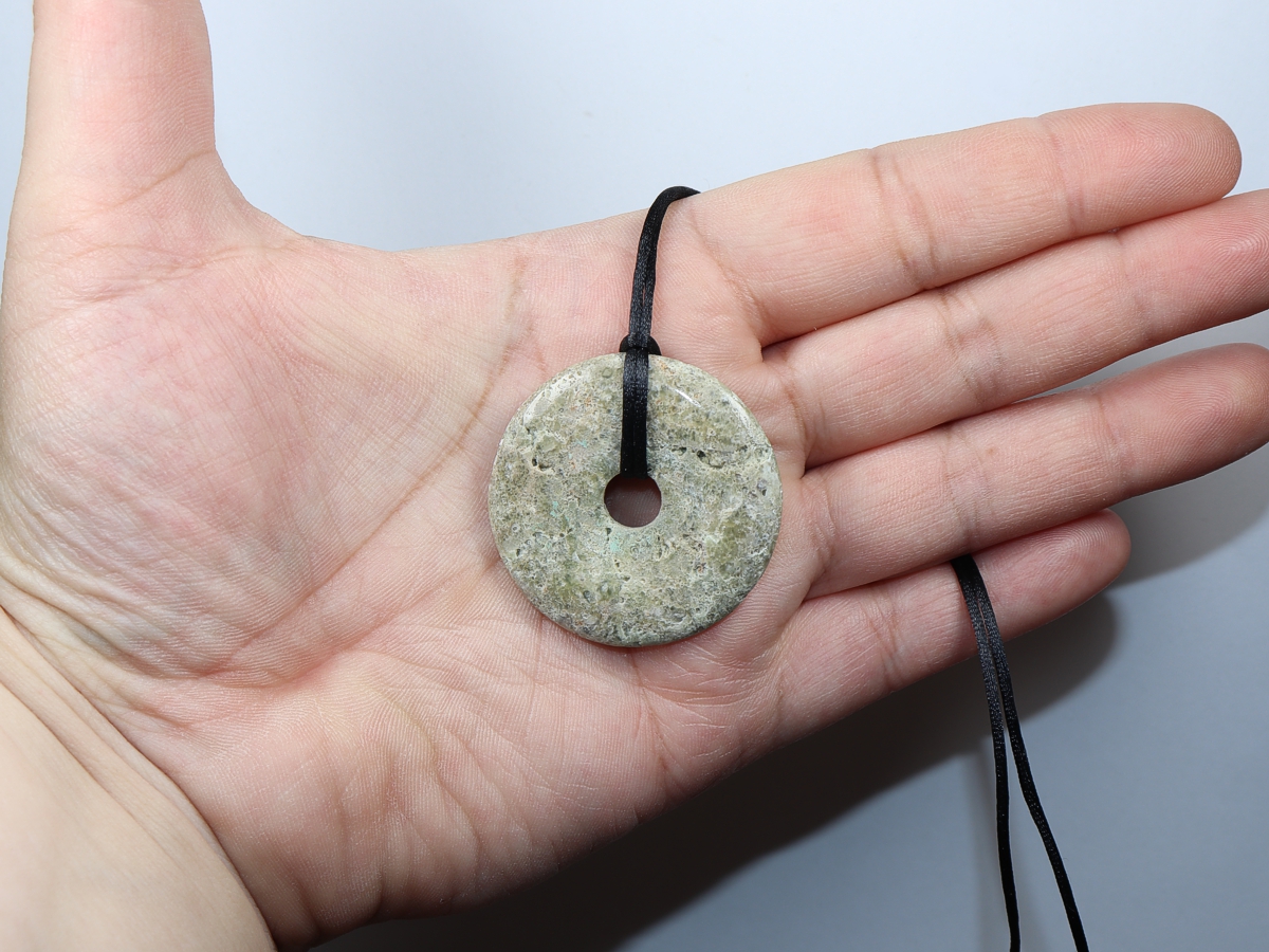 Die Halskette mit dem Donut aus Chrysopras und einem schwarzen Band wird nach Ihren Angaben individualisiert. Der Verschluss ist aus Edelstahl.