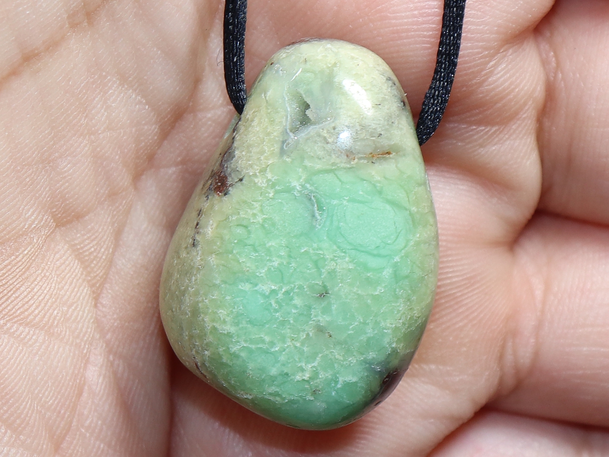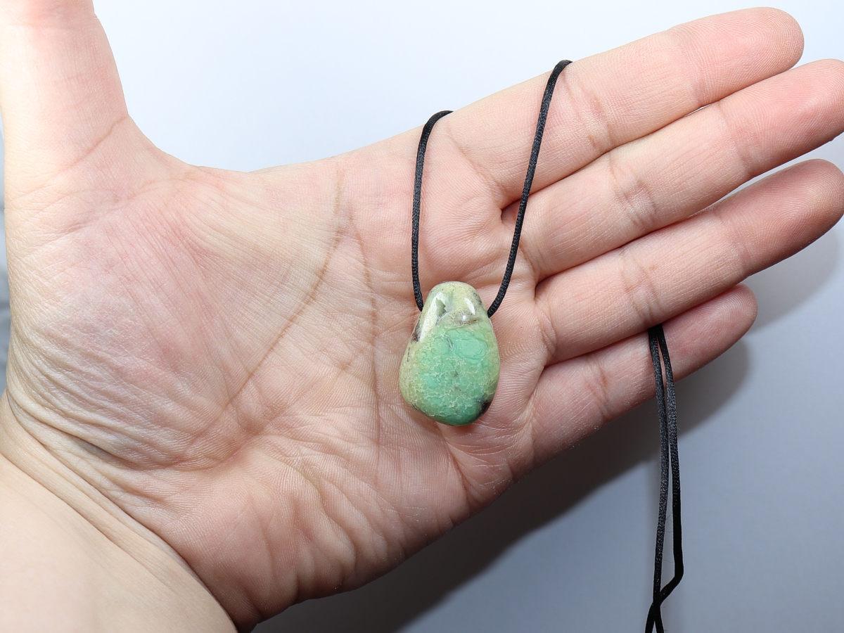 Die Halskette mit Chrysopras wird nach Ihren Angaben individualisiert. Sie haben die Wahl zwischen einem schwarzen Band mit einem Verschluss aus Edelstahl oder einer Kette aus Silber 925.