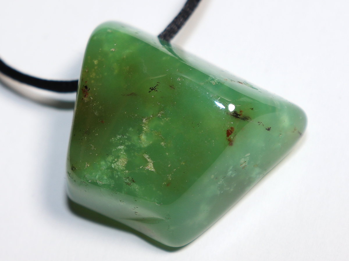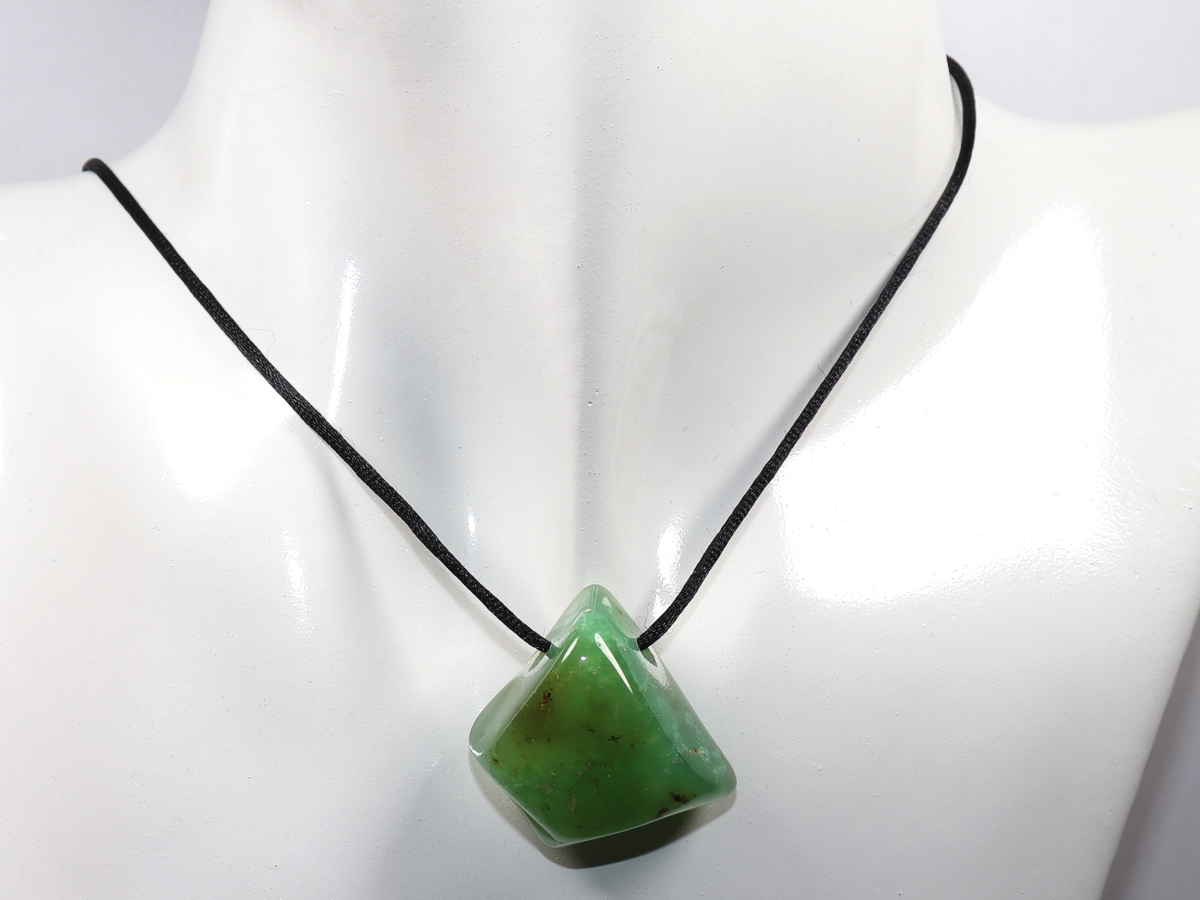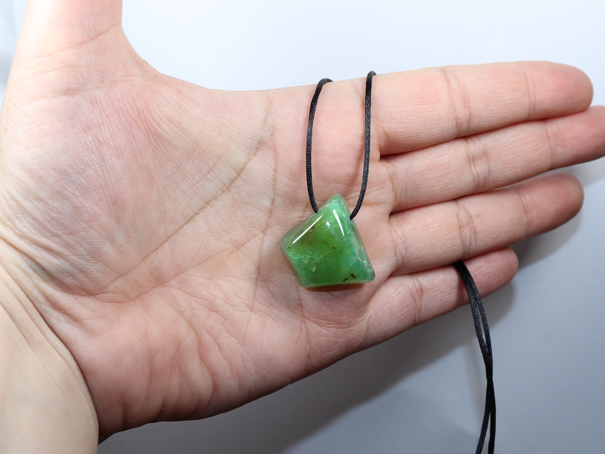 Die Halskette mit Chrysopras wird nach Ihren Angaben individualisiert. Sie haben die Wahl zwischen einem schwarzen Band mit einem Verschluss aus Edelstahl oder einer Kette aus Silber 925.