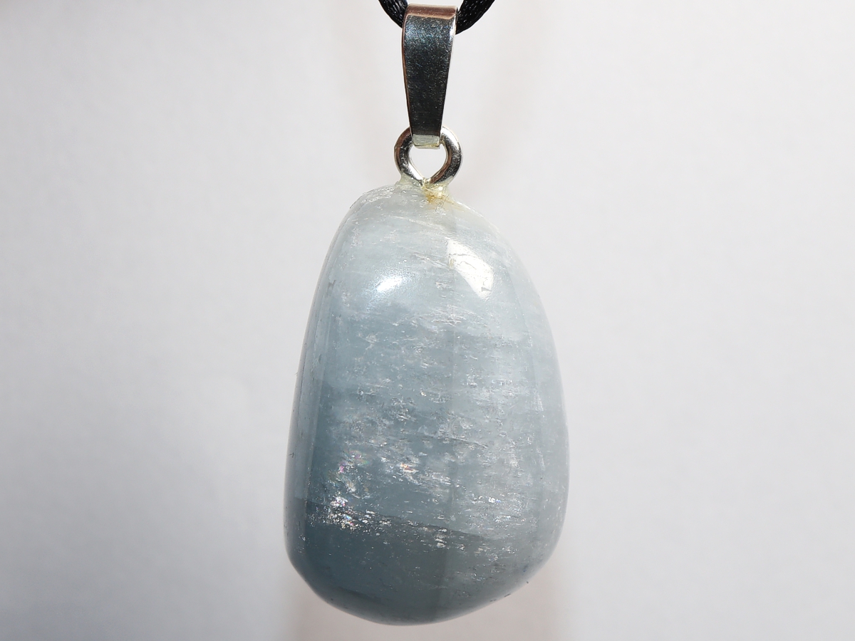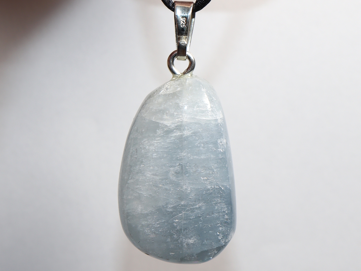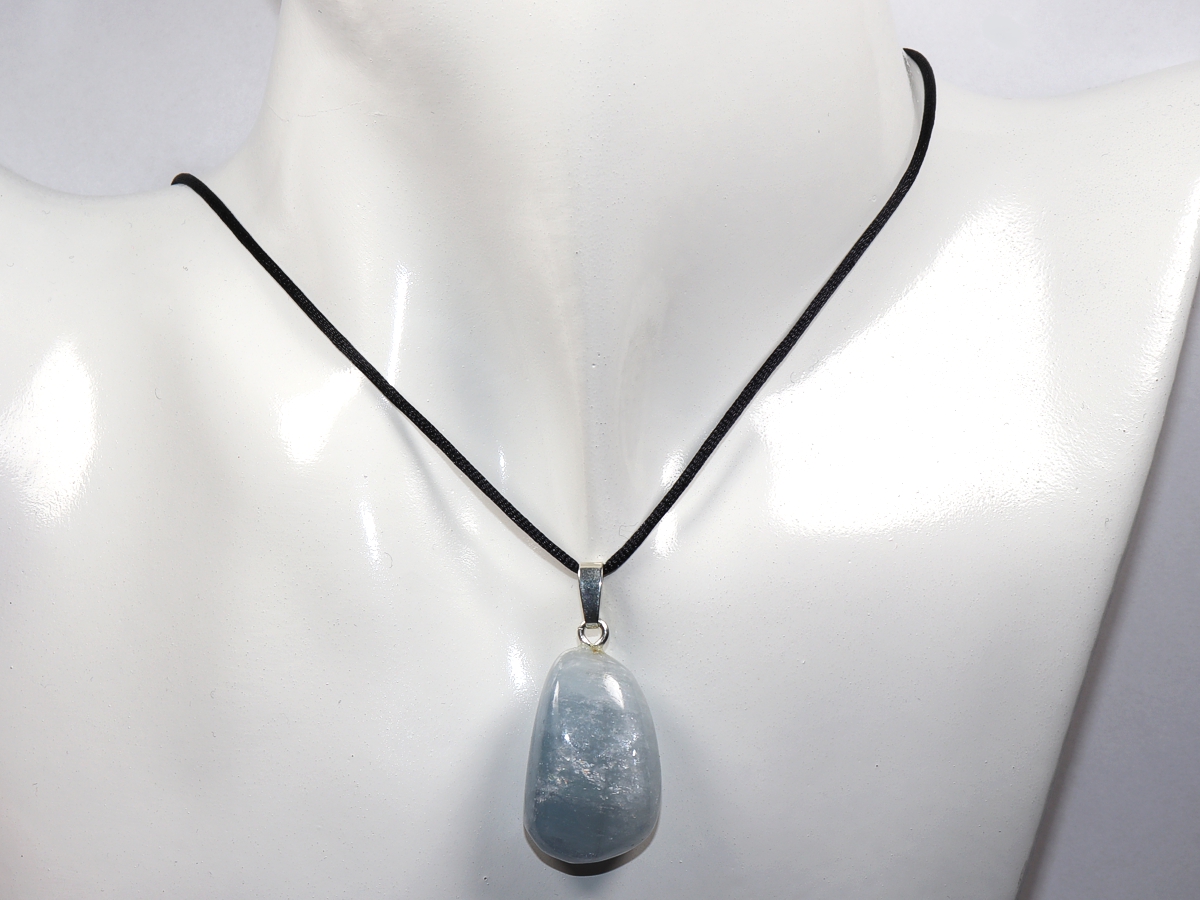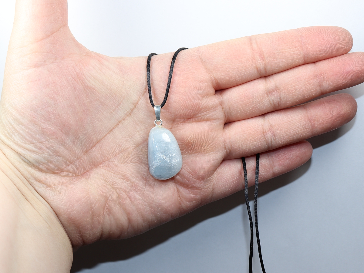 Die Halskette mit Coelestin wird nach Ihren Angaben individualisiert. Sie haben die Wahl zwischen einem schwarzen Band mit einem Verschluss aus Edelstahl oder einer Kette aus Silber 925.
