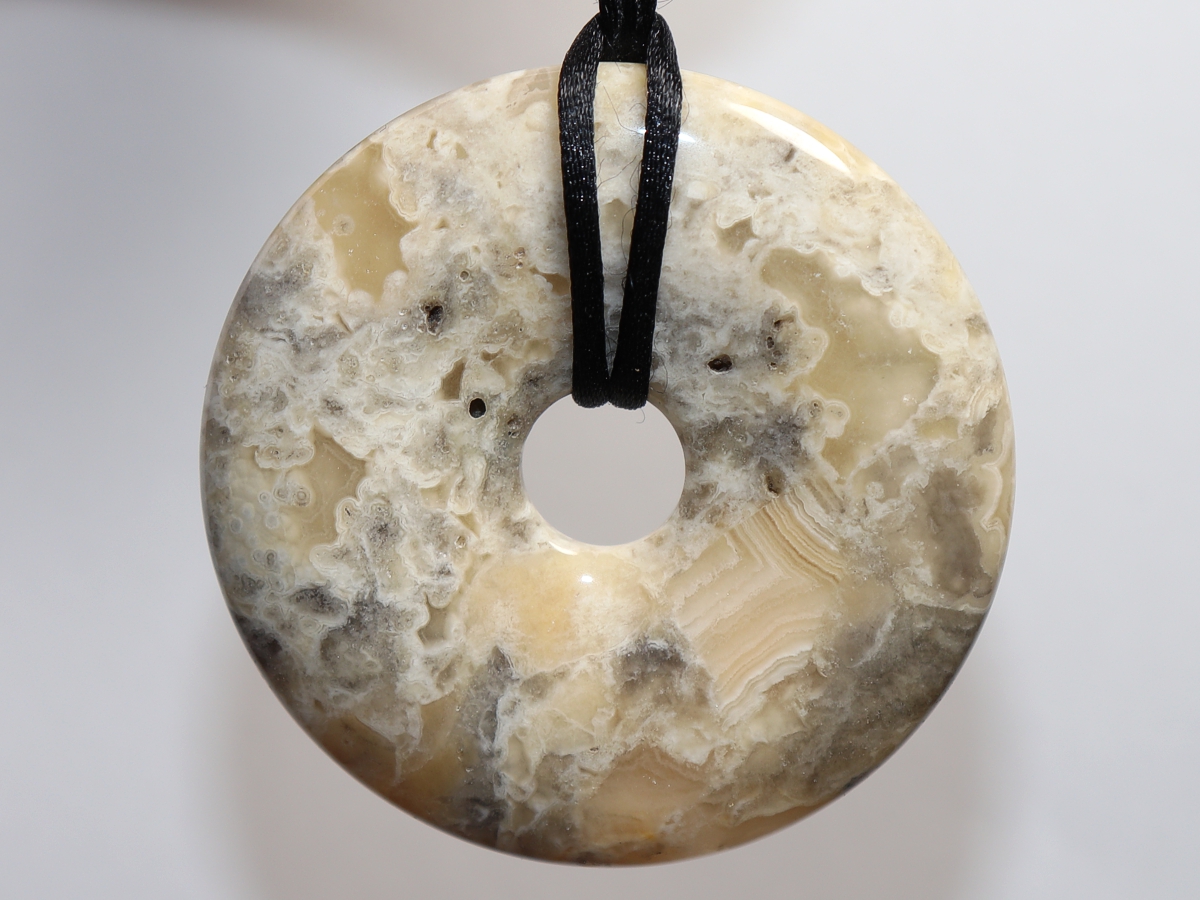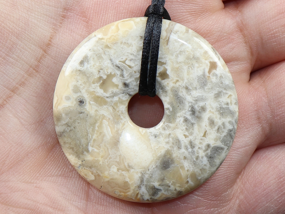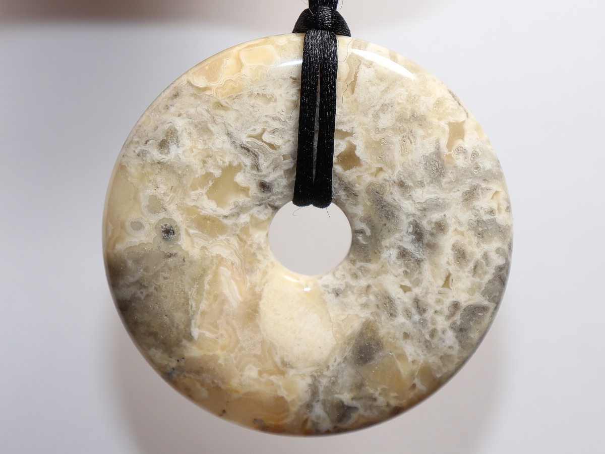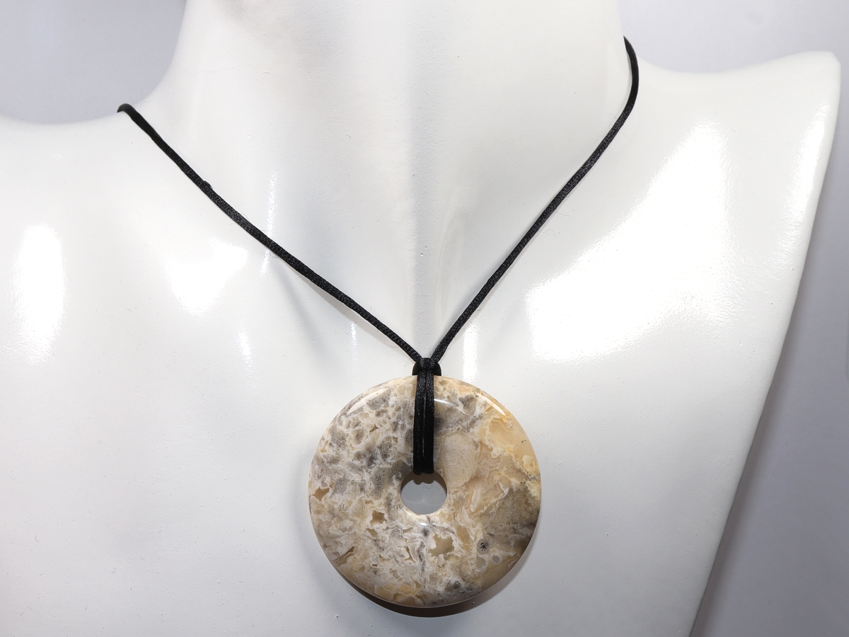 Die Halskette mit dem Donut aus Crazy-Lace-Achat und einem schwarzen Band wird nach Ihren Angaben individualisiert. Der Verschluss ist aus Edelstahl.