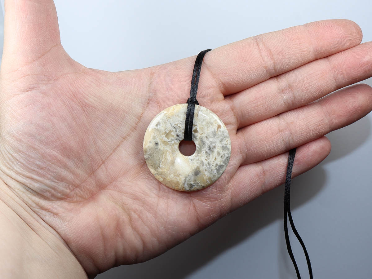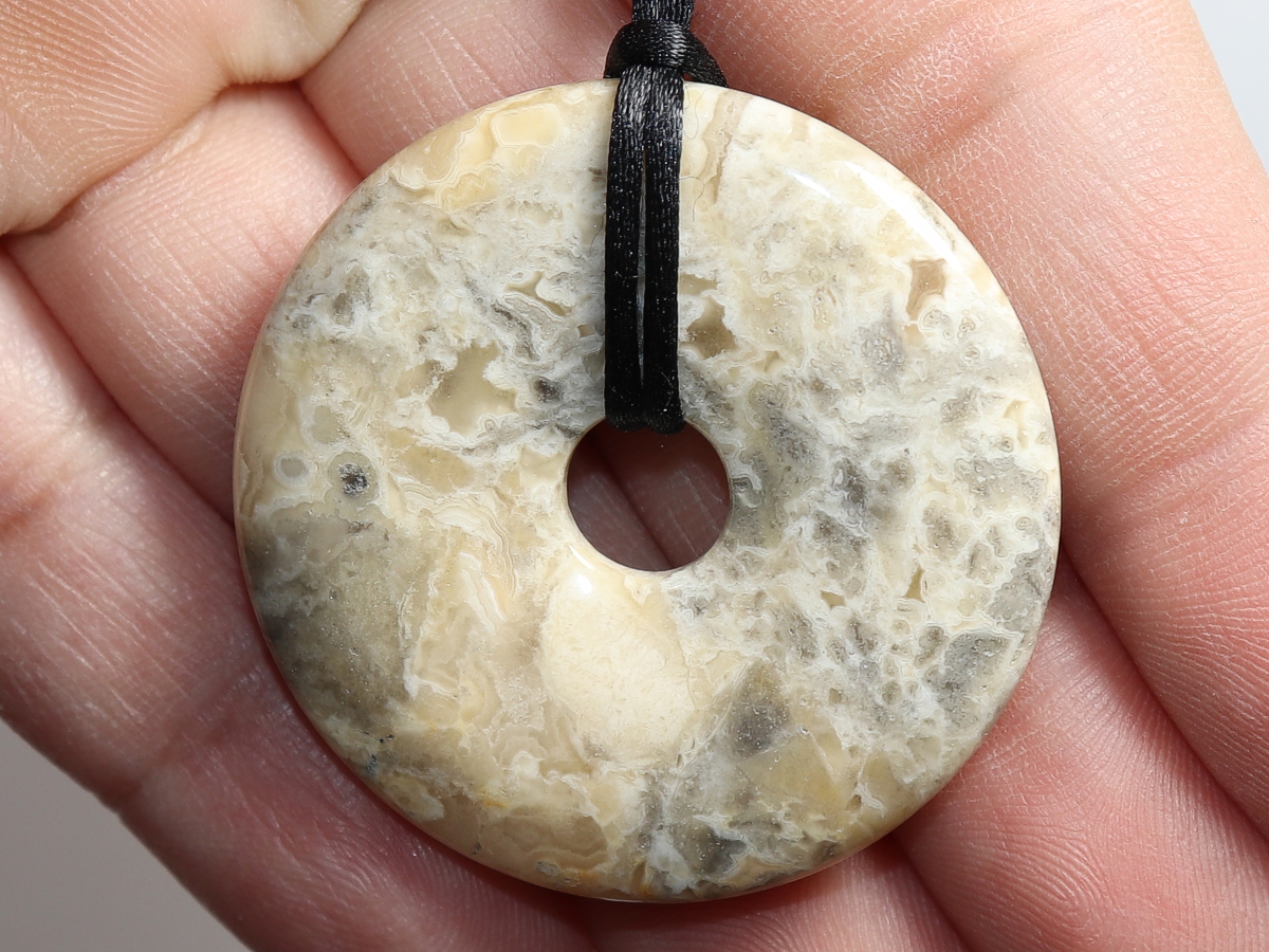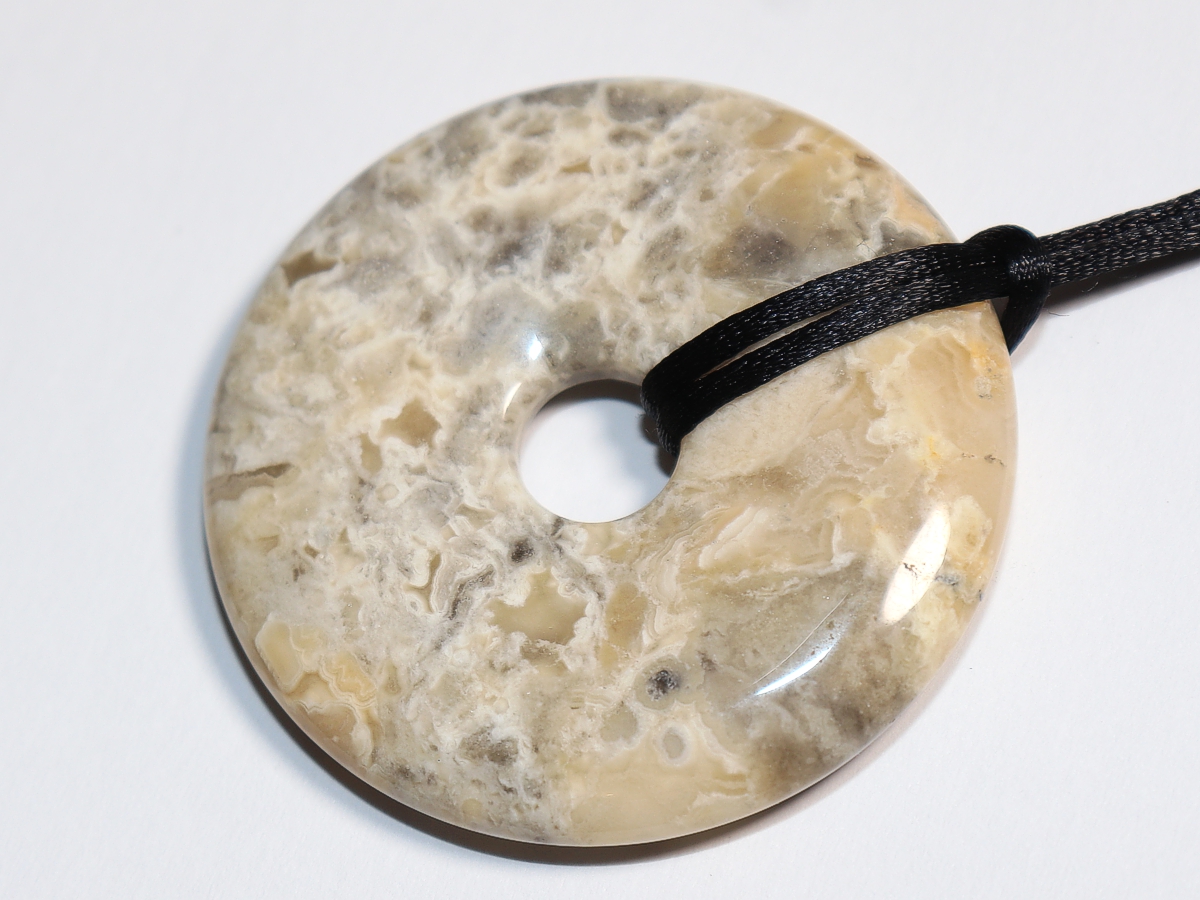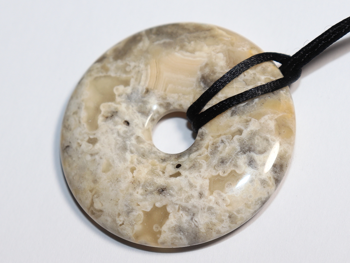 Die Halskette mit dem Donut aus Crazy-Lace-Achat und einem schwarzen Band wird nach Ihren Angaben individualisiert. Der Verschluss ist aus Edelstahl.