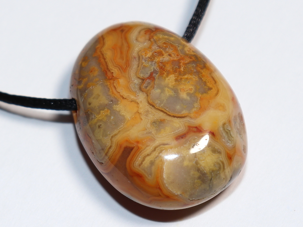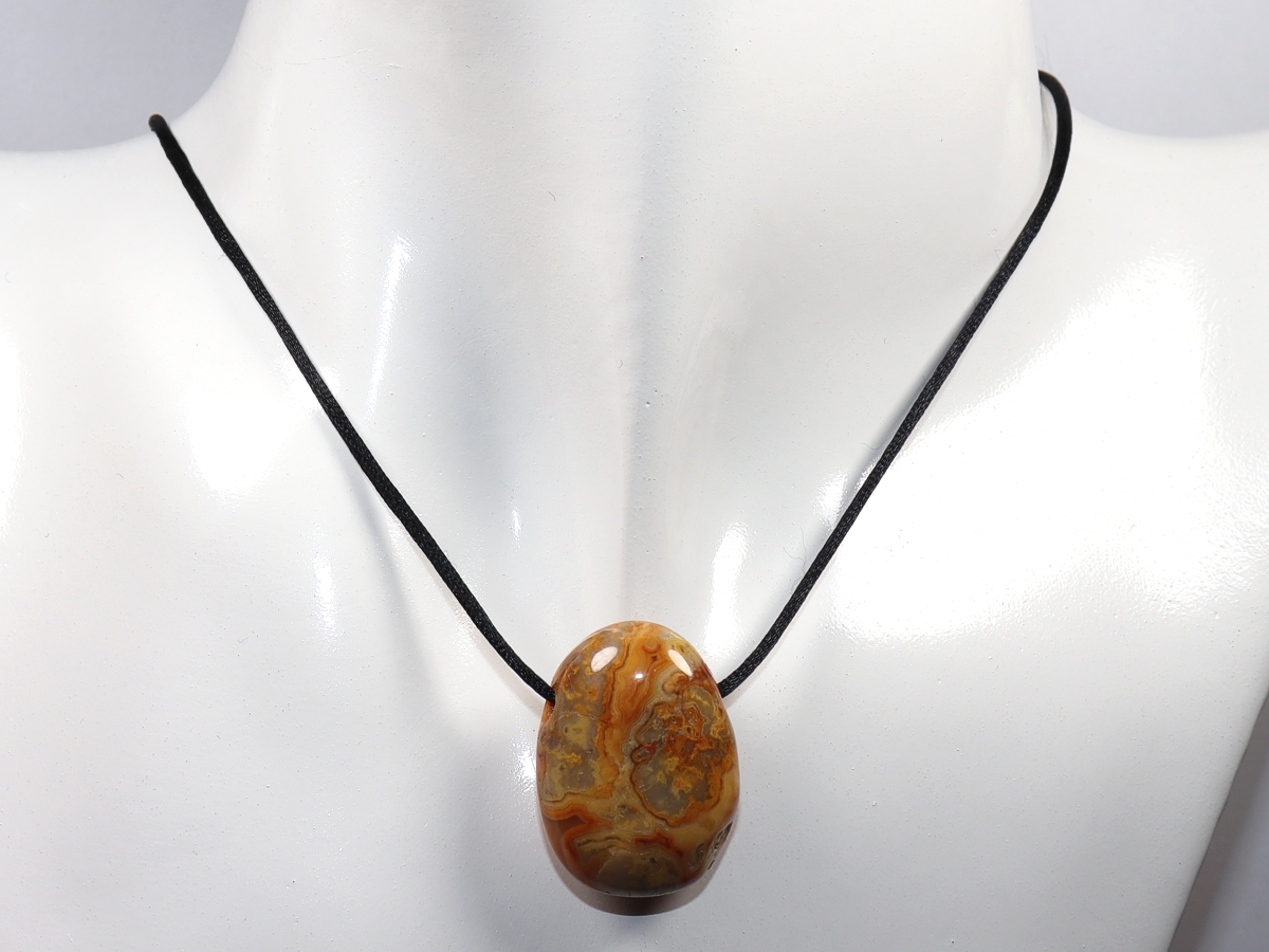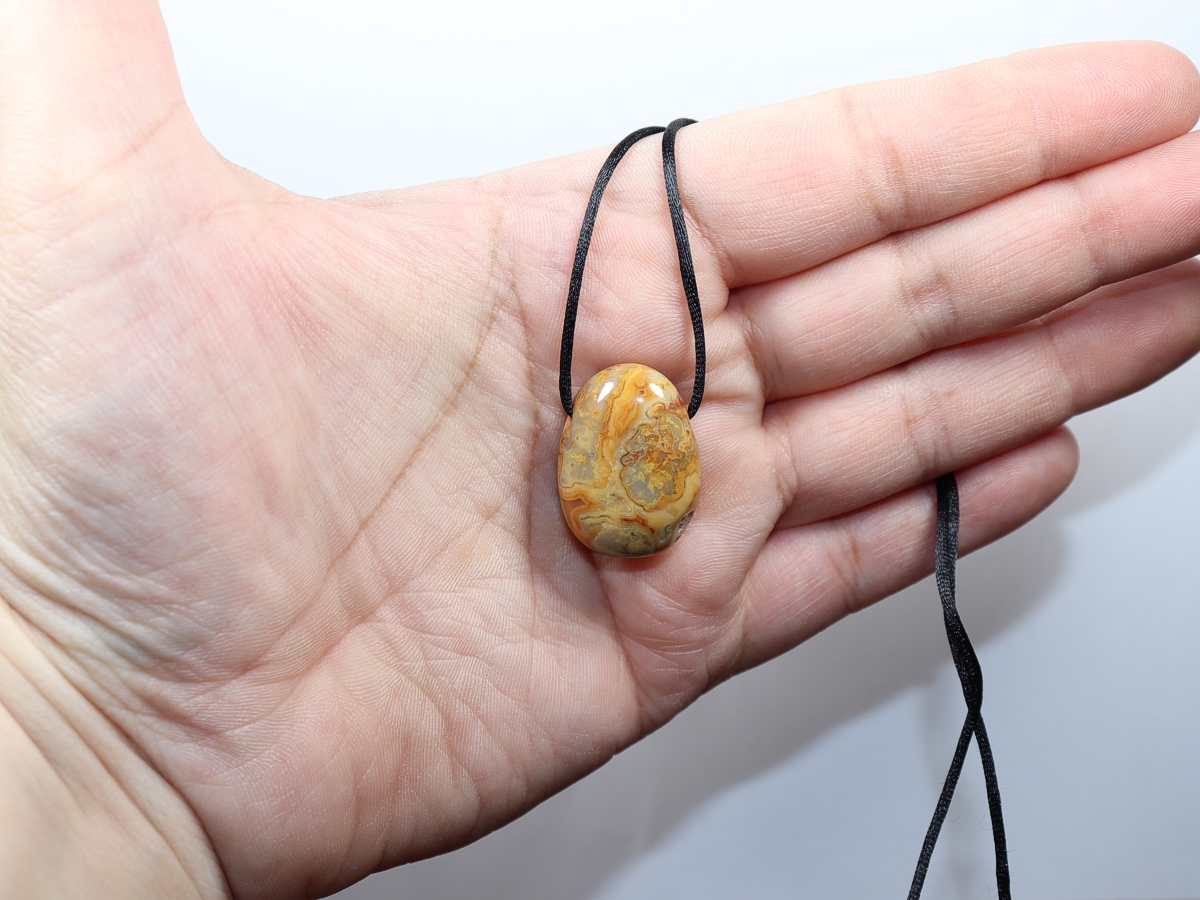 Die Halskette mit Crazy-Lace-Achat wird nach Ihren Angaben individualisiert. Sie haben die Wahl zwischen einem schwarzen Band mit einem Verschluss aus Edelstahl oder einer Kette aus Silber 925.