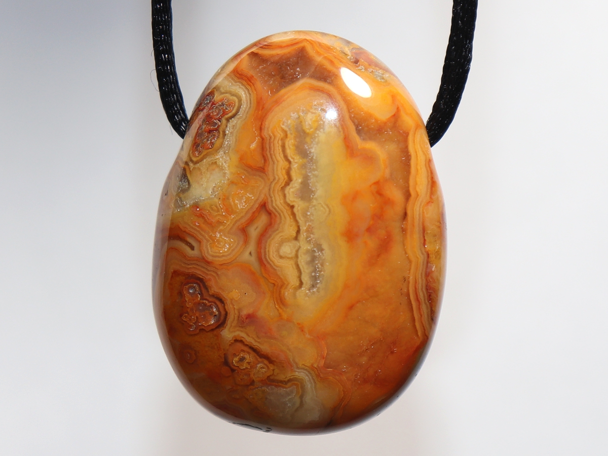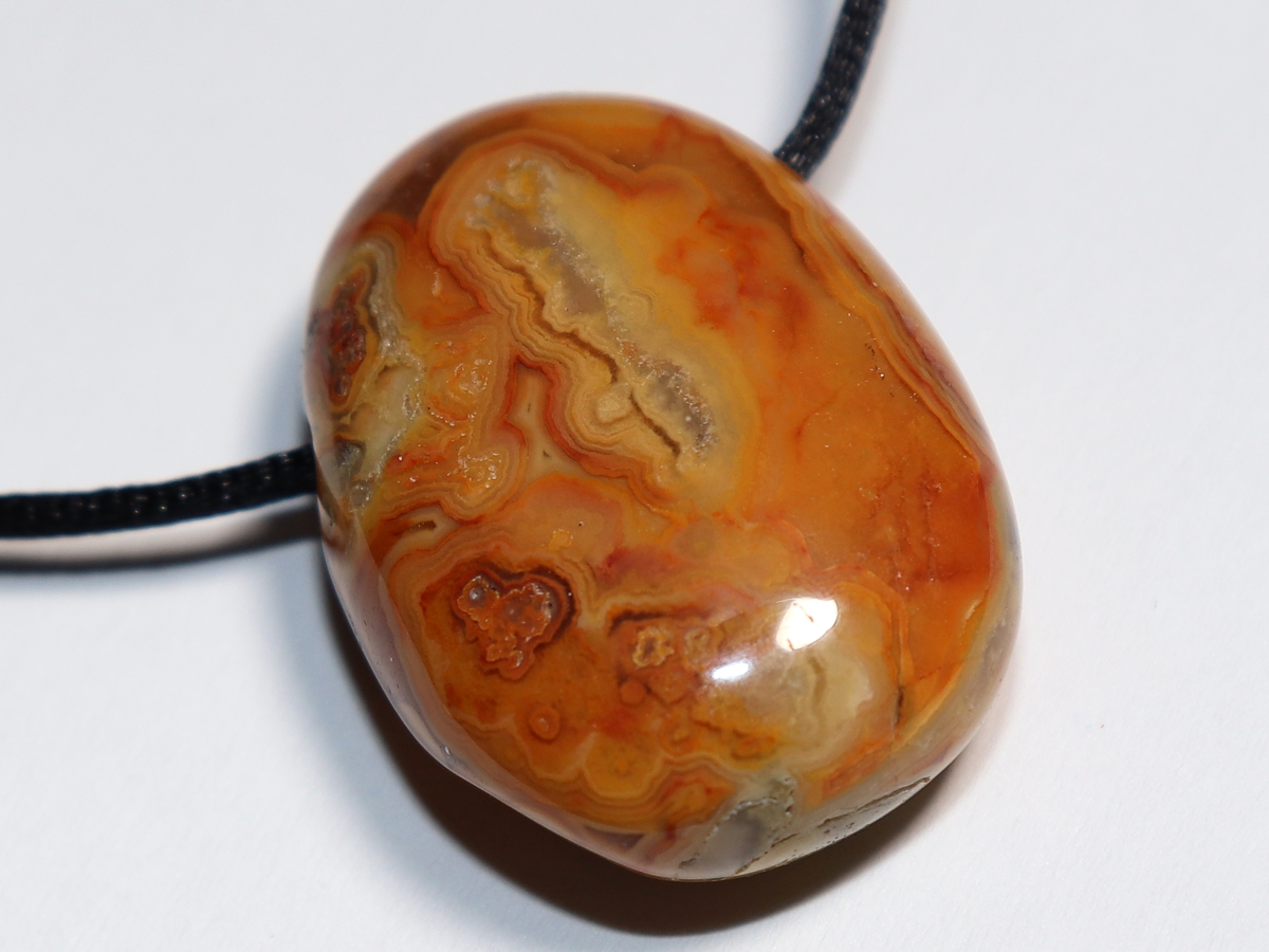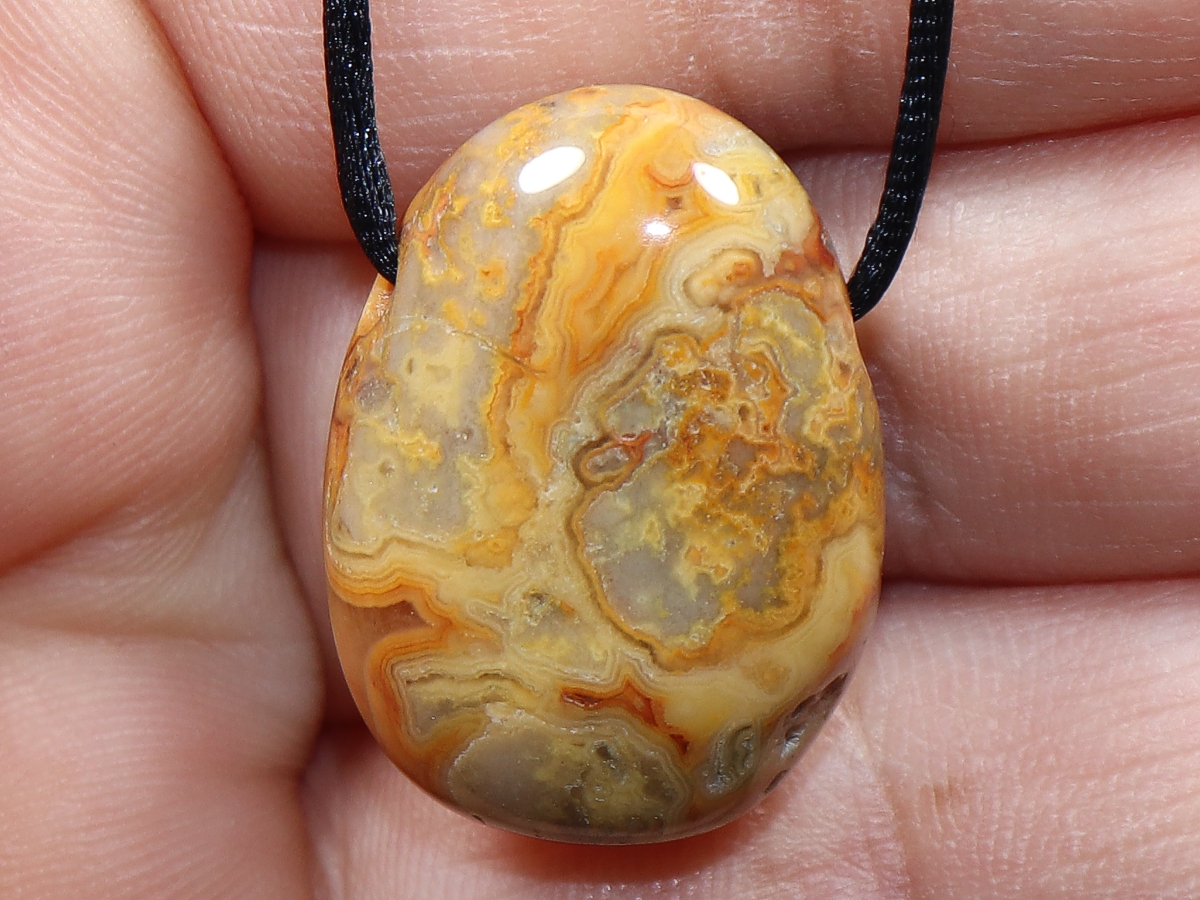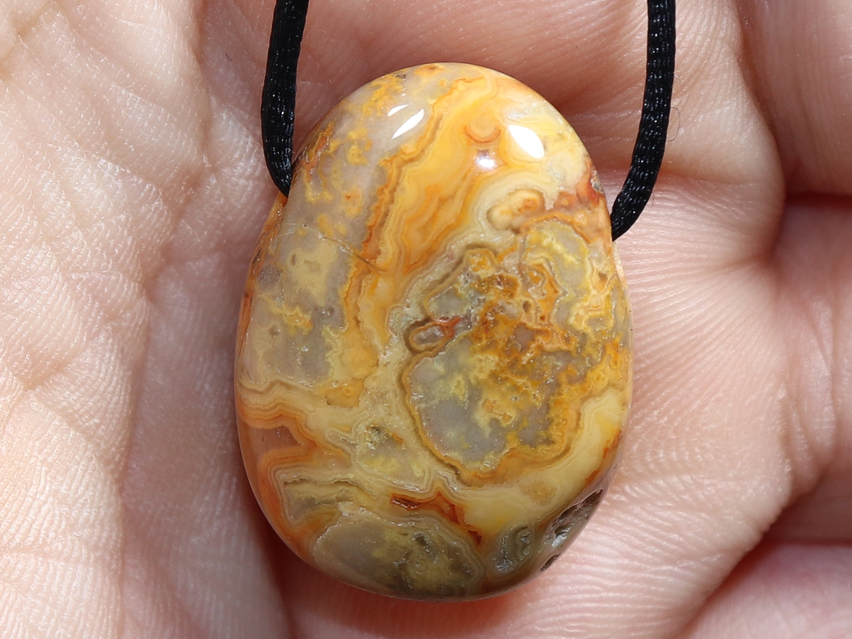 Die Halskette mit Crazy-Lace-Achat wird nach Ihren Angaben individualisiert. Sie haben die Wahl zwischen einem schwarzen Band mit einem Verschluss aus Edelstahl oder einer Kette aus Silber 925.
