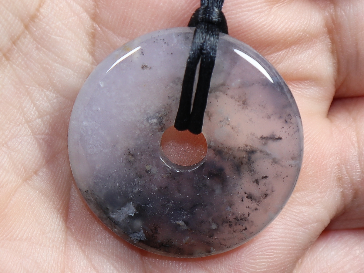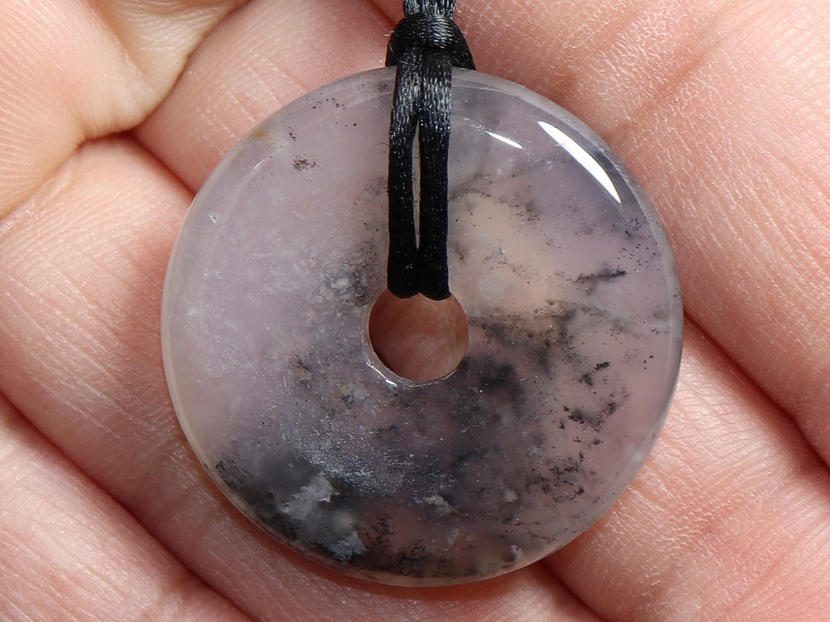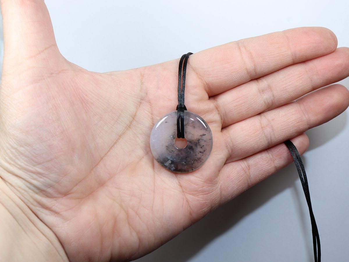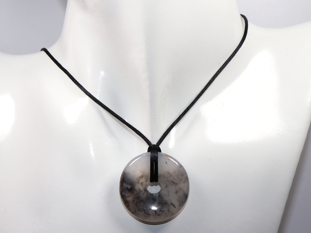 Die Halskette mit dem Donut aus Dendritenchalcedon und einem schwarzen Band wird nach Ihren Angaben individualisiert. Der Verschluss ist aus Edelstahl.