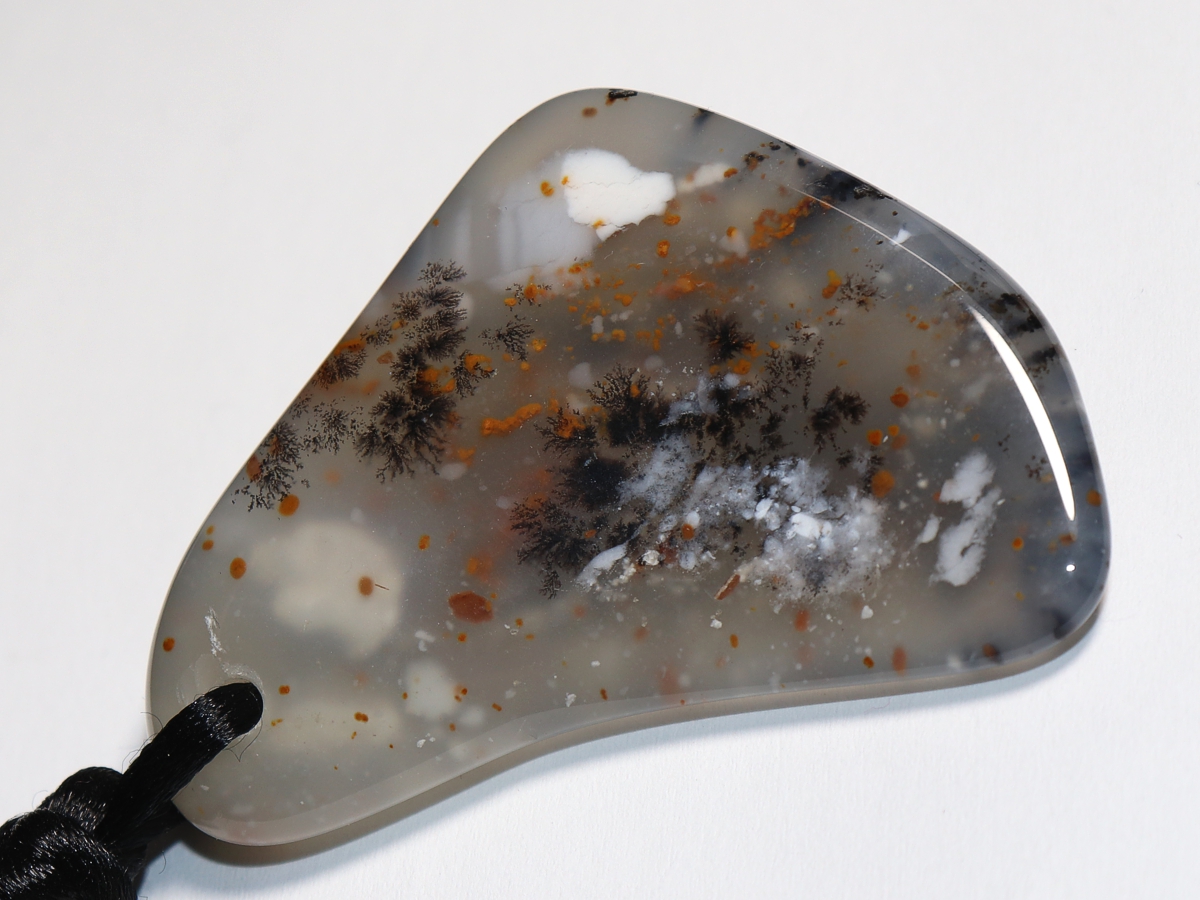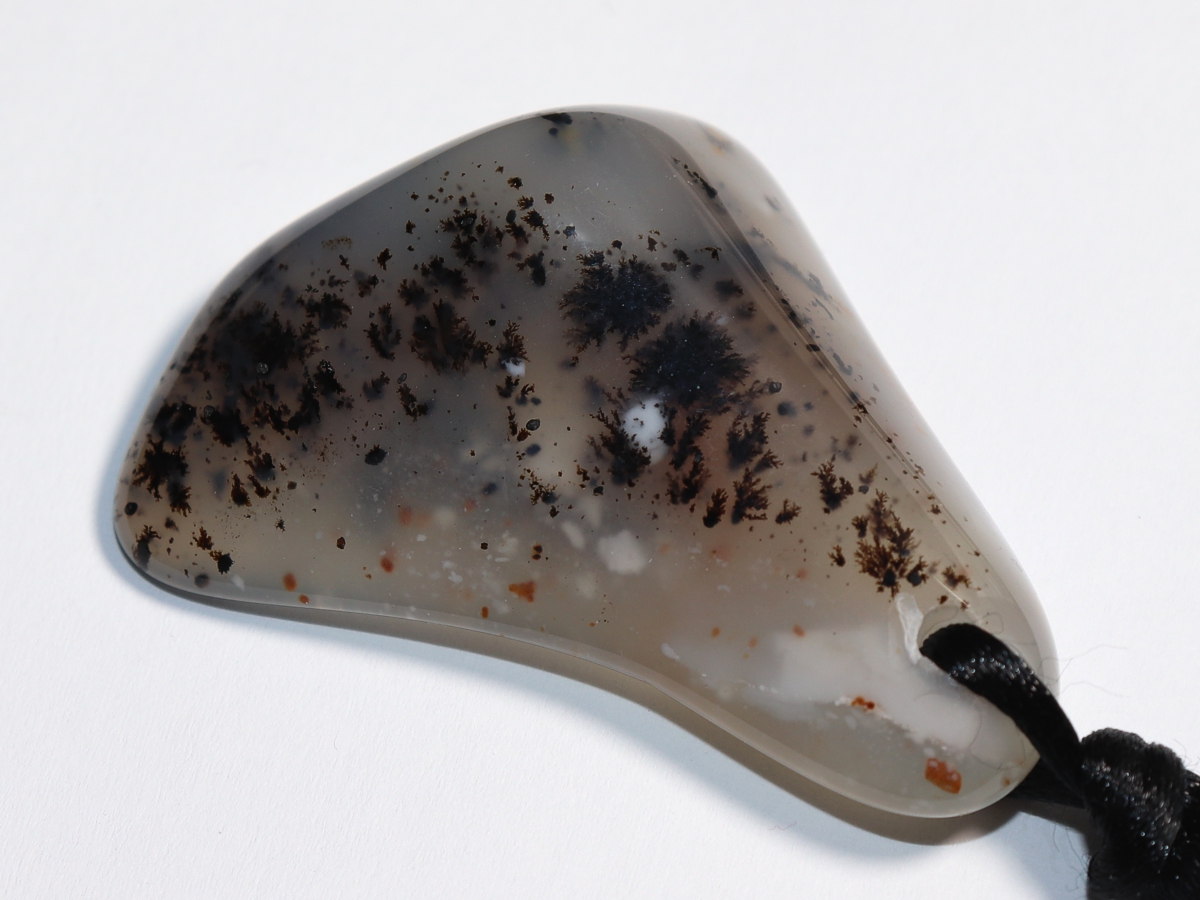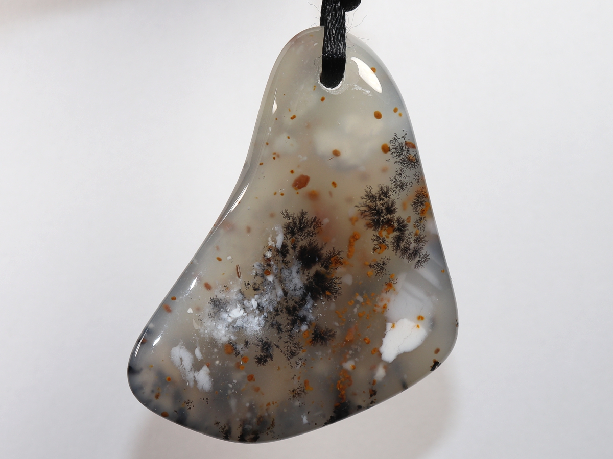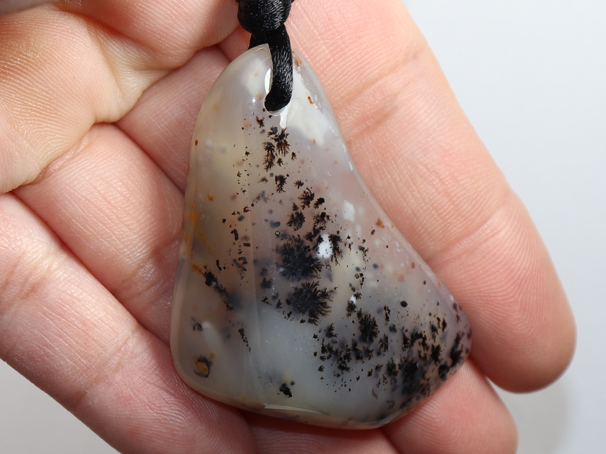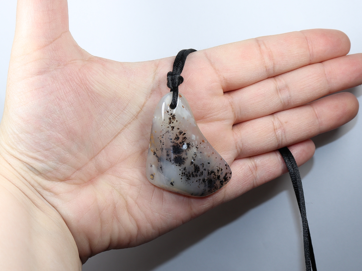 Die Halskette mit Dendritenchalcedon und einem schwarzen Band wird nach Ihren Angaben individualisiert. Der Verschluss ist aus Edelstahl.