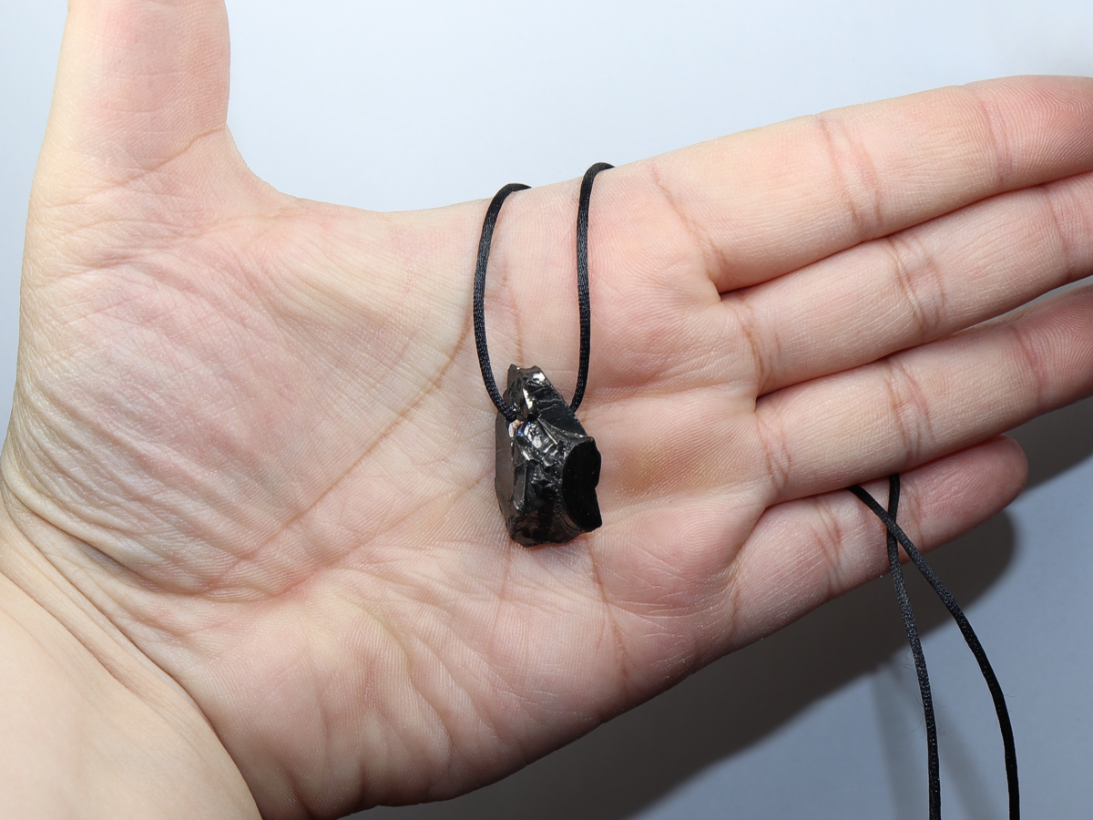 Die Halskette mit Edel-Shungit wird nach Ihren Angaben individualisiert. Sie haben die Wahl zwischen einem schwarzen Band mit einem Verschluss aus Edelstahl oder einer Kette aus Silber 925.