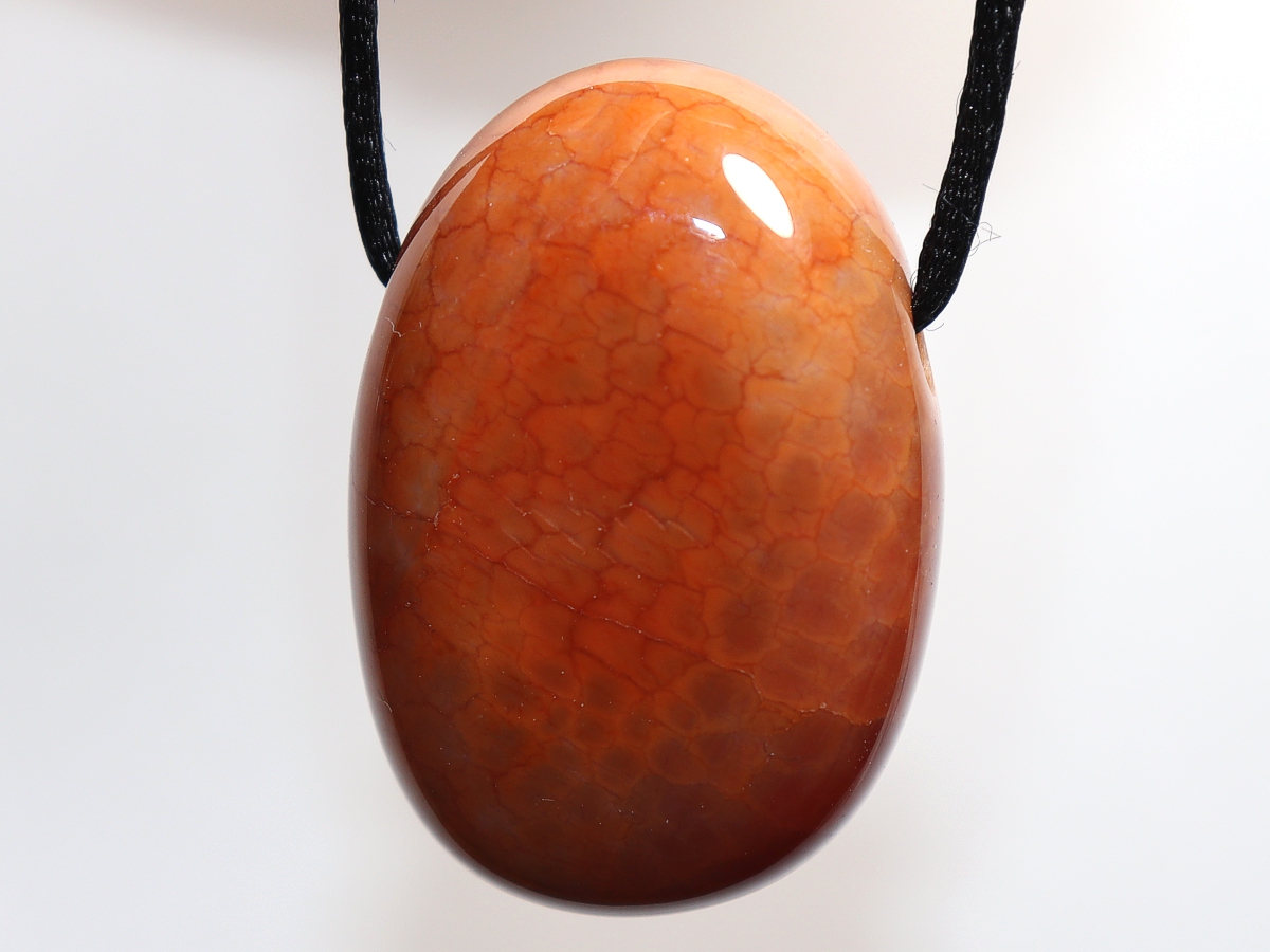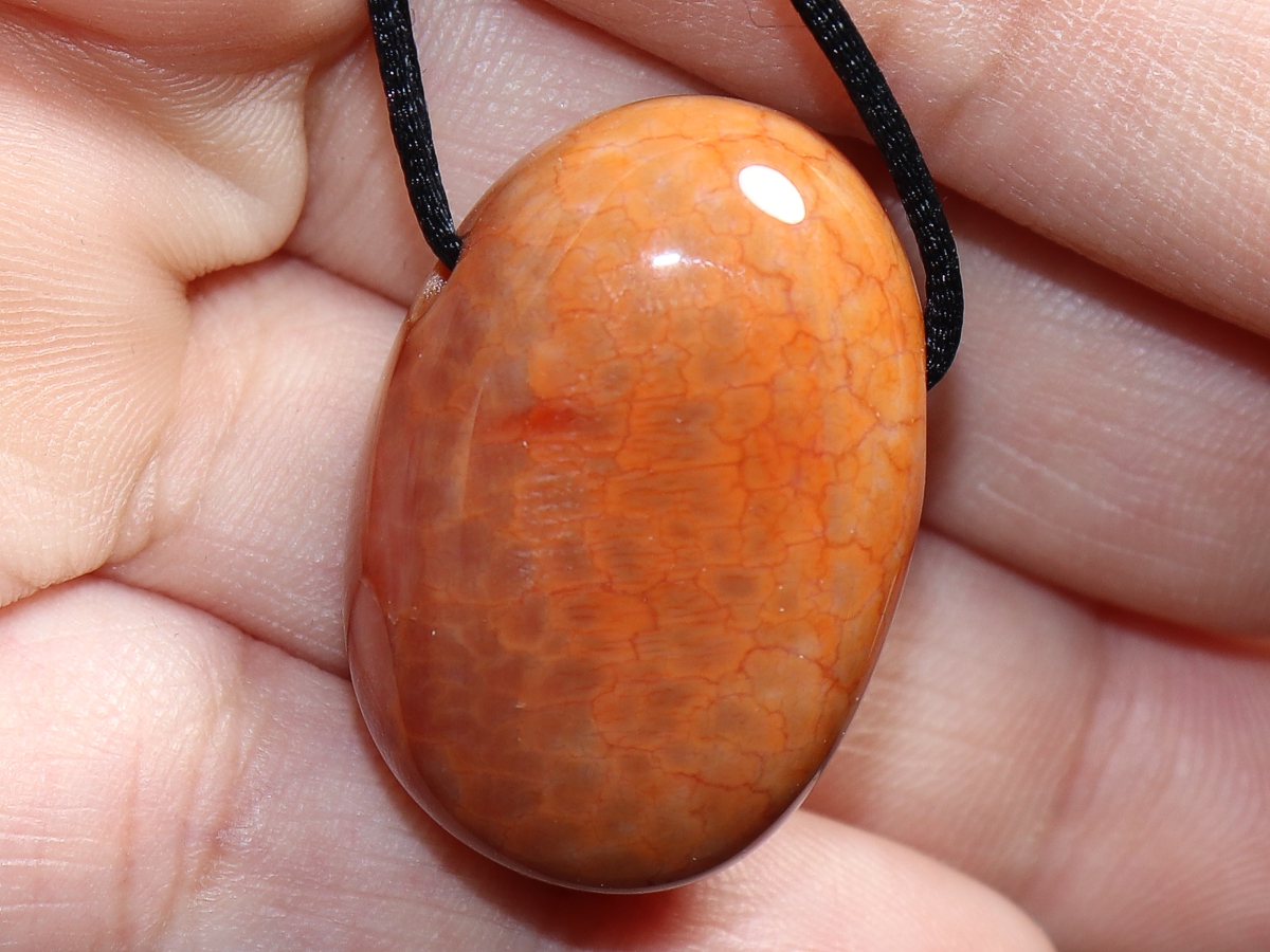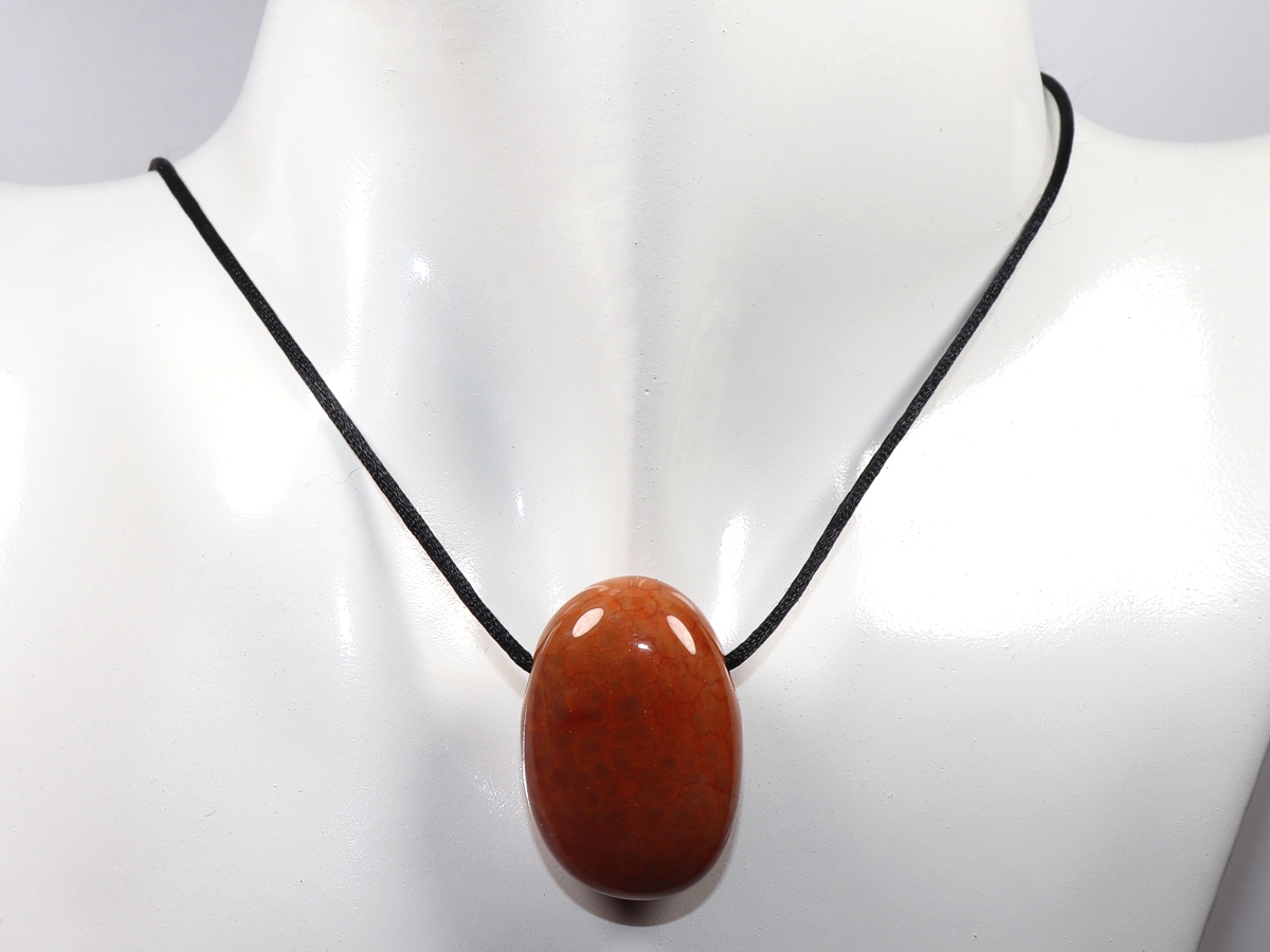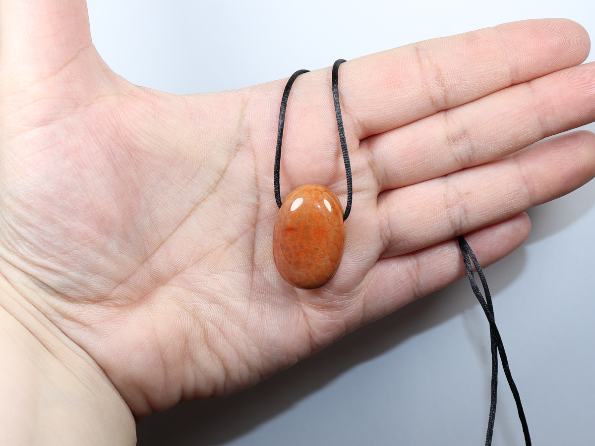 Die Halskette mit Feuerachat (gebrannter Chalcedon) wird nach Ihren Angaben individualisiert. Sie haben die Wahl zwischen einem schwarzen Band mit einem Verschluss aus Edelstahl oder einer Kette aus Silber 925.