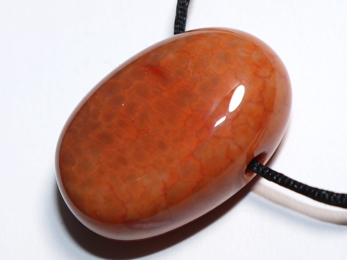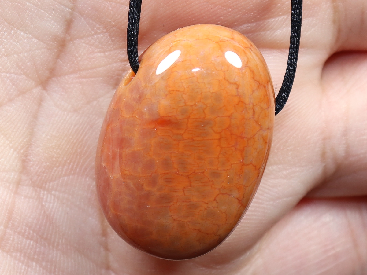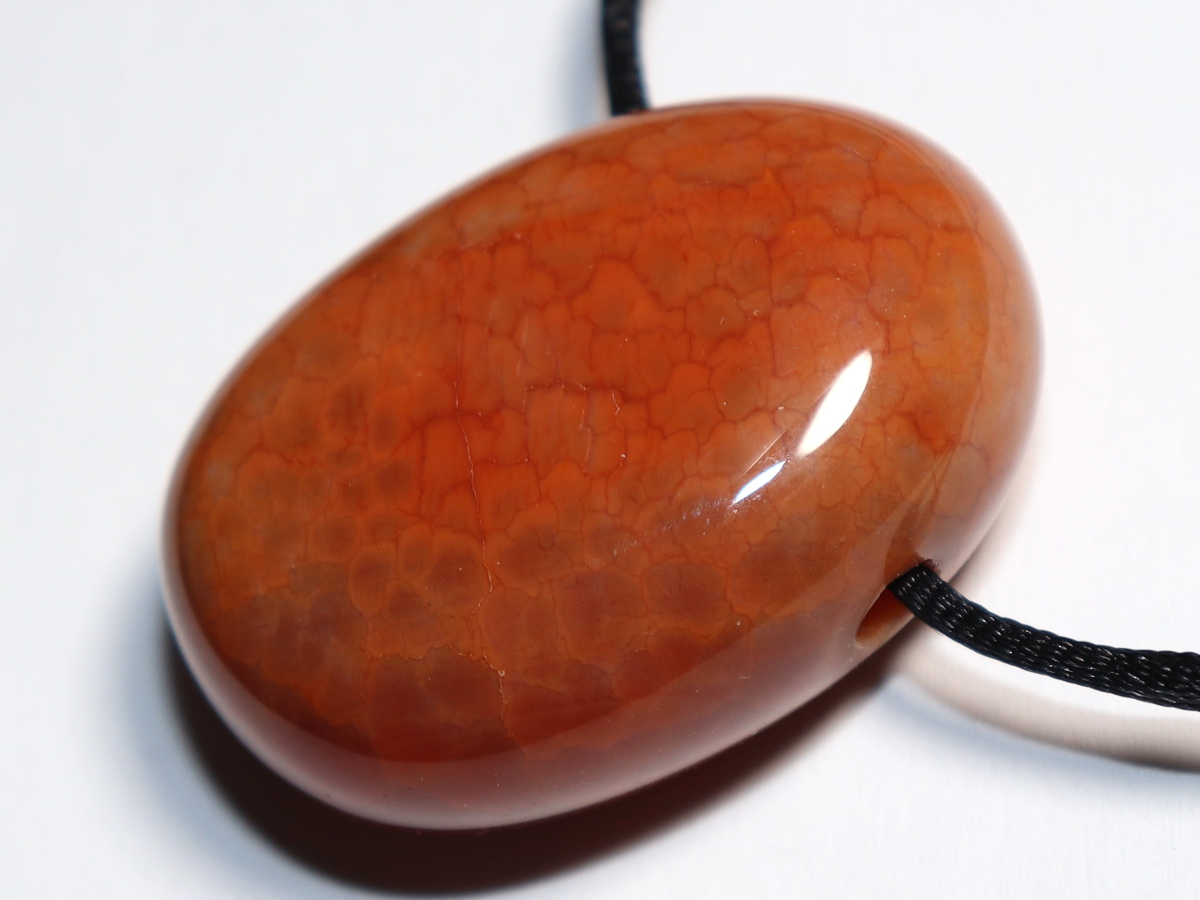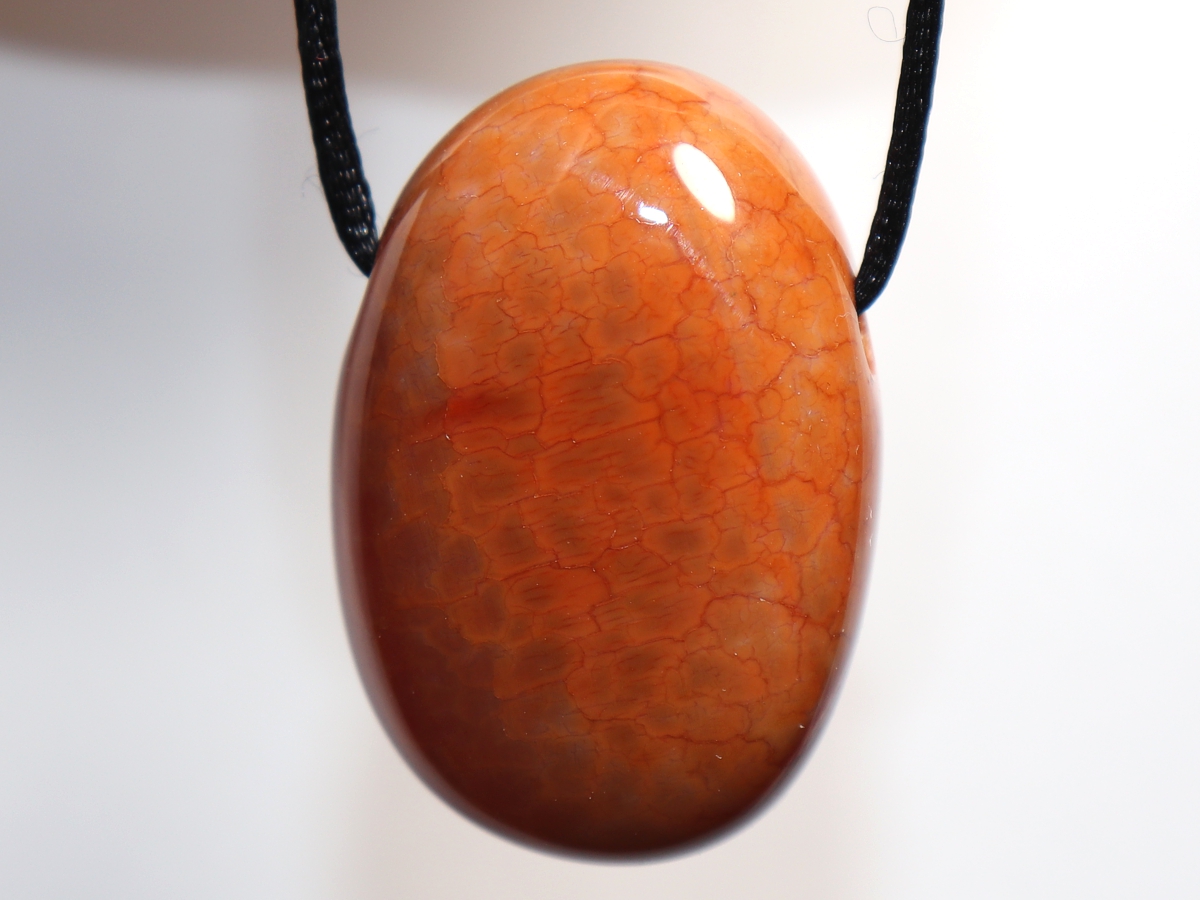 Die Halskette mit Feuerachat (gebrannter Chalcedon) wird nach Ihren Angaben individualisiert. Sie haben die Wahl zwischen einem schwarzen Band mit einem Verschluss aus Edelstahl oder einer Kette aus Silber 925.