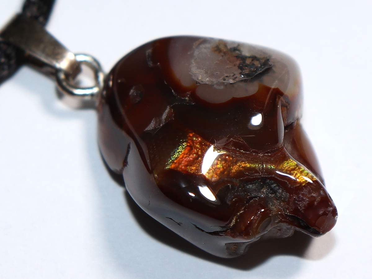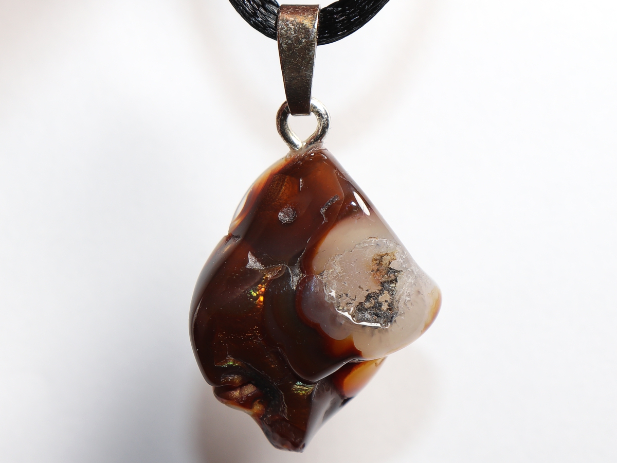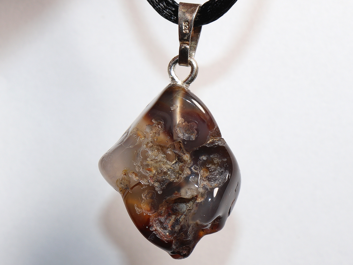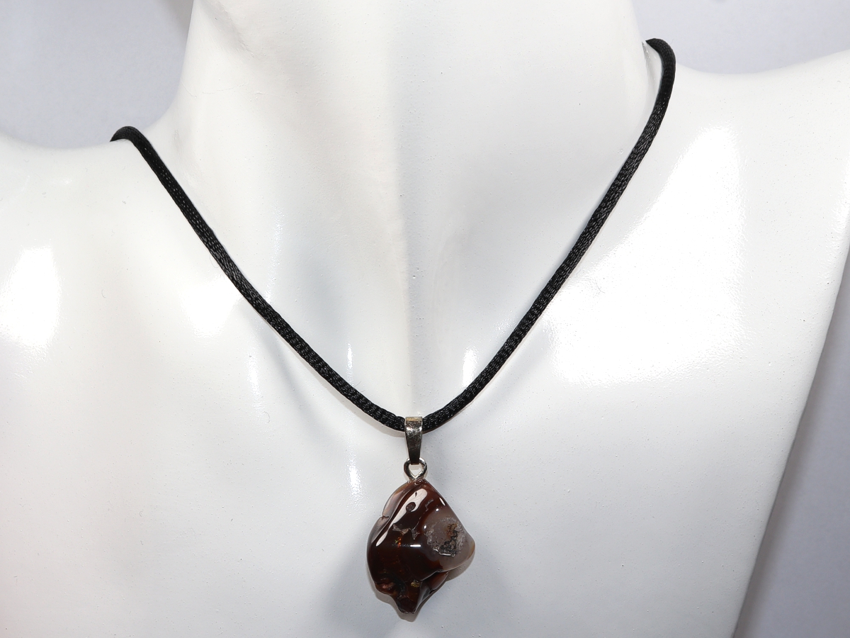 Die Halskette mit Feuerachat wird nach Ihren Angaben individualisiert. Sie haben die Wahl zwischen einem schwarzen Band mit einem Verschluss aus Edelstahl oder einer Kette aus Silber 925.
