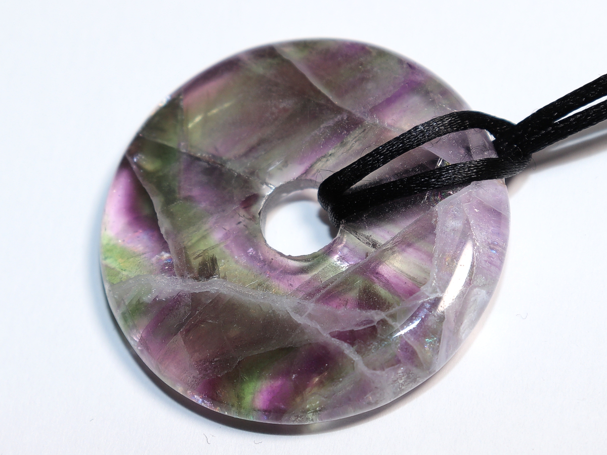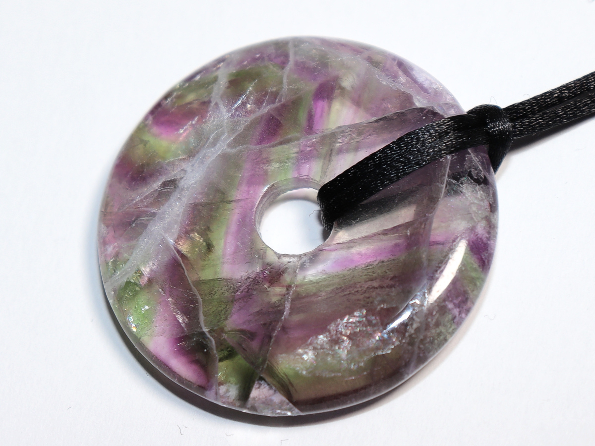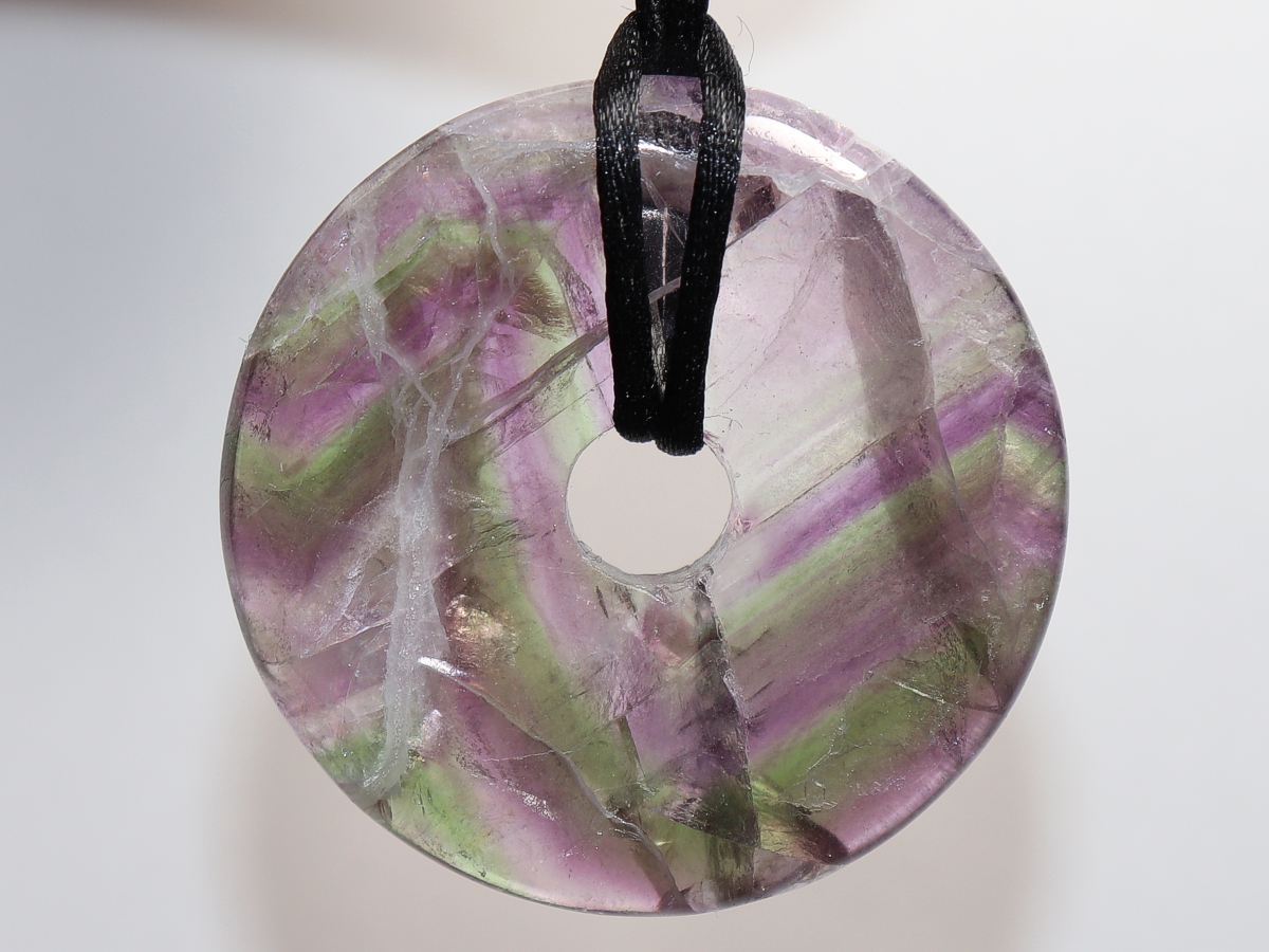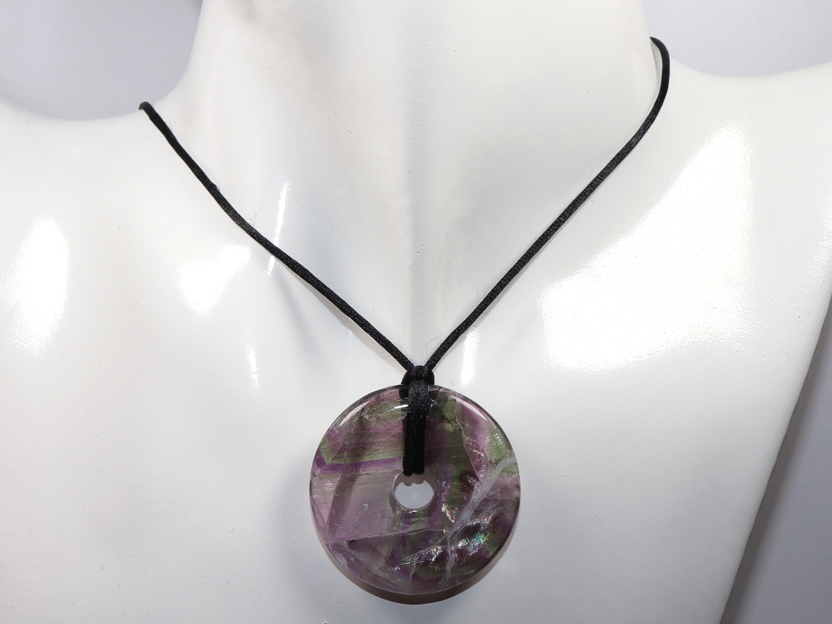 Die Halskette mit dem Donut aus Fluorit und einem schwarzen Band wird nach Ihren Angaben individualisiert. Der Verschluss ist aus Edelstahl.