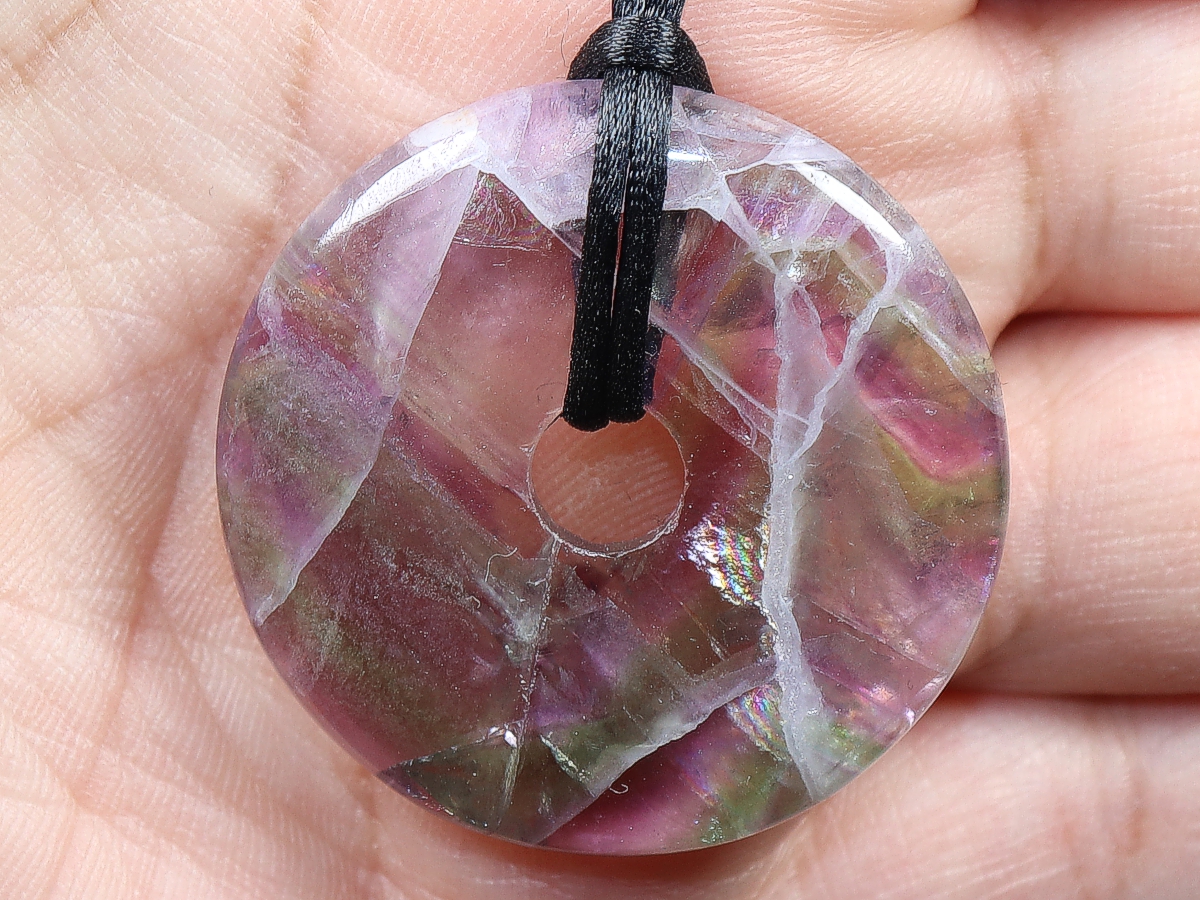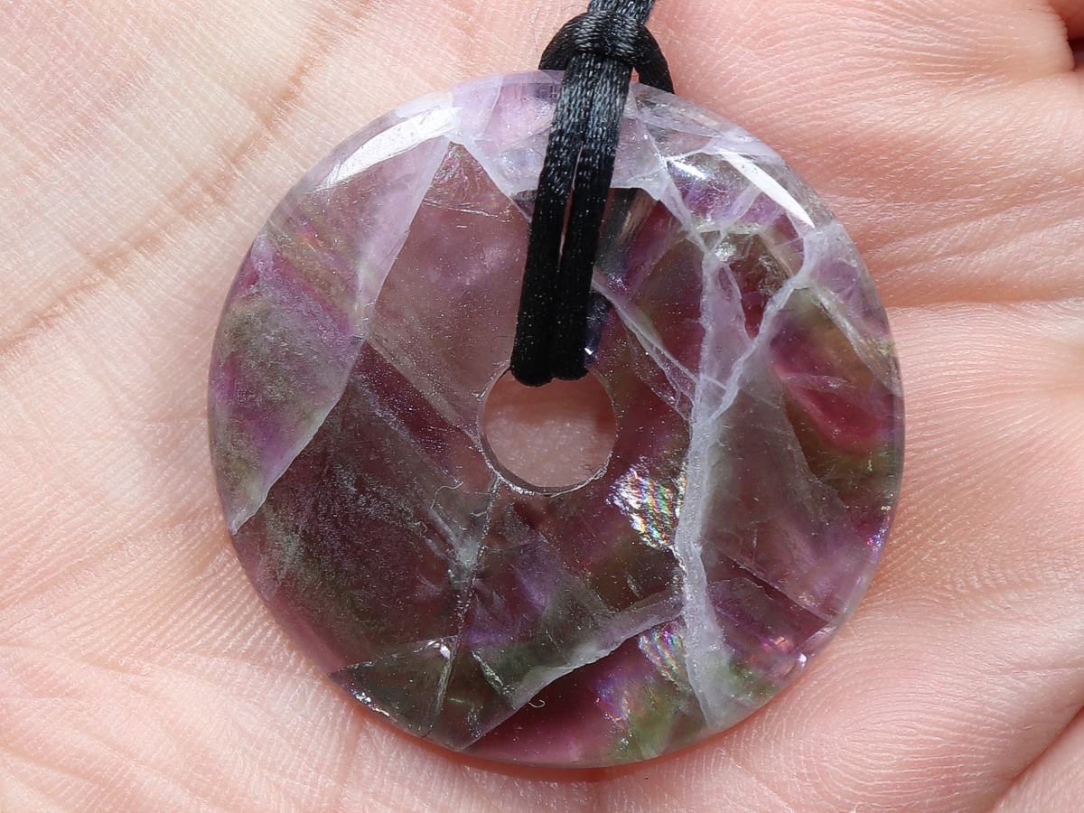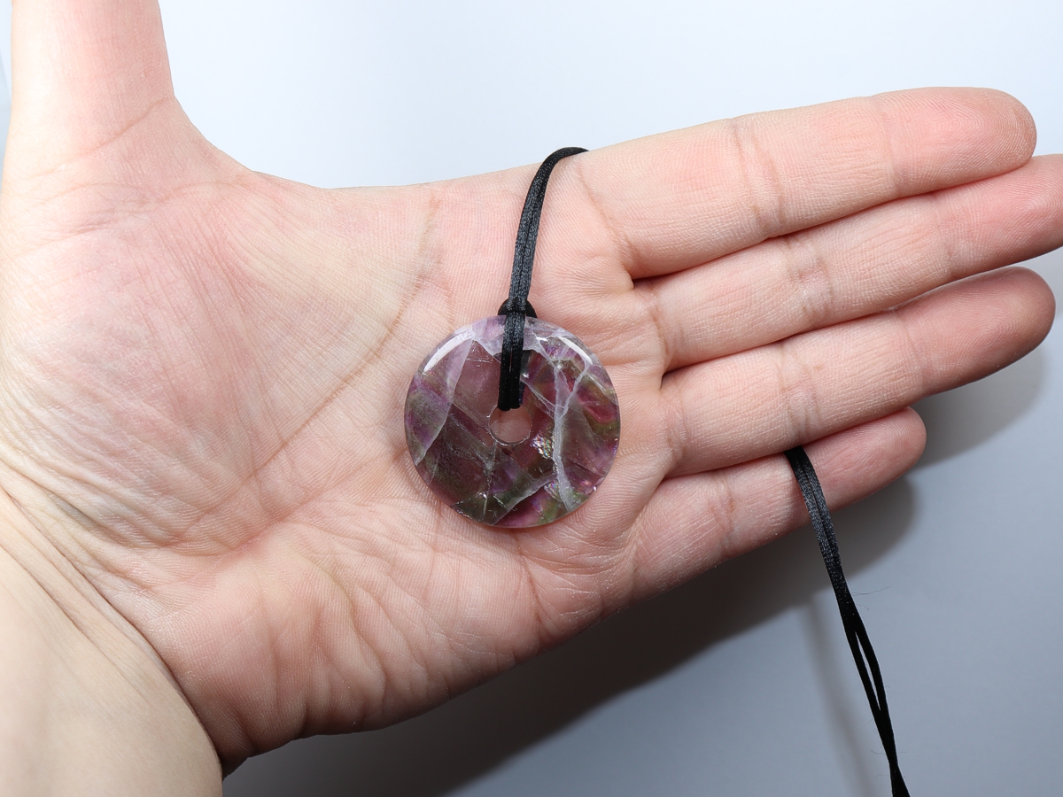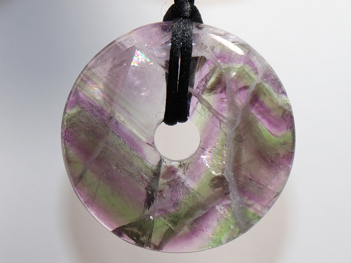 Die Halskette mit dem Donut aus Fluorit und einem schwarzen Band wird nach Ihren Angaben individualisiert. Der Verschluss ist aus Edelstahl.