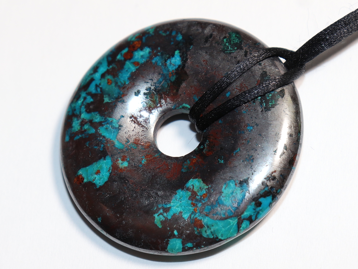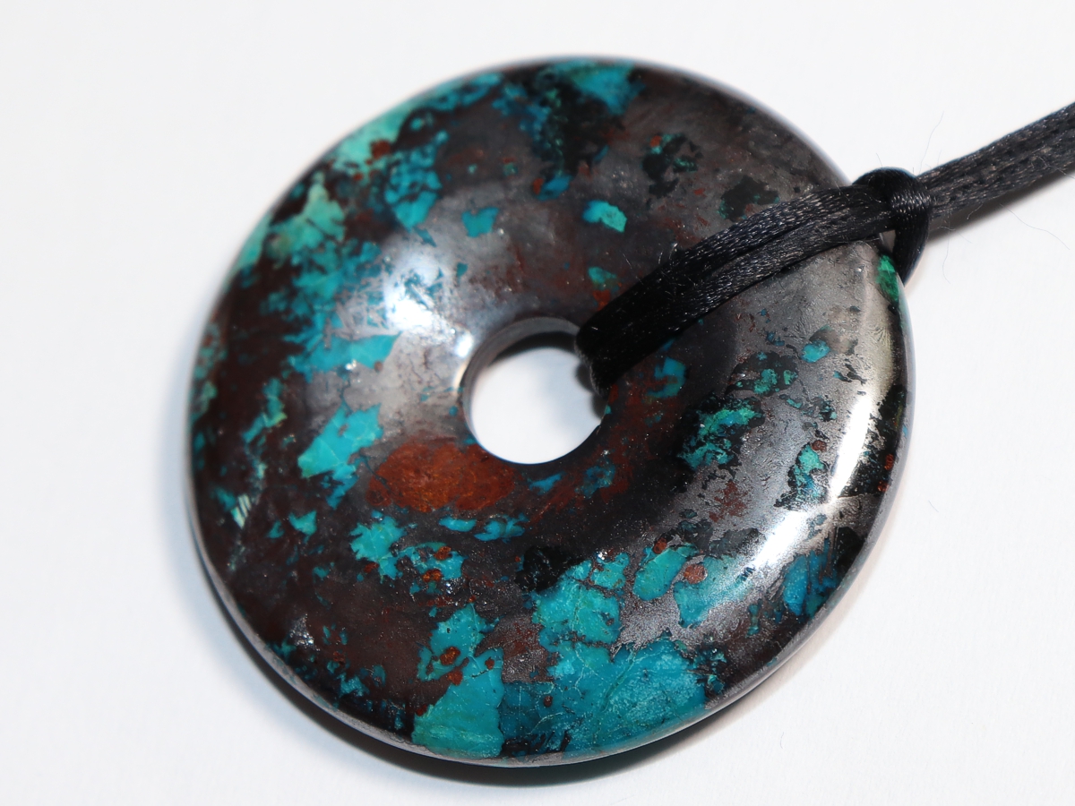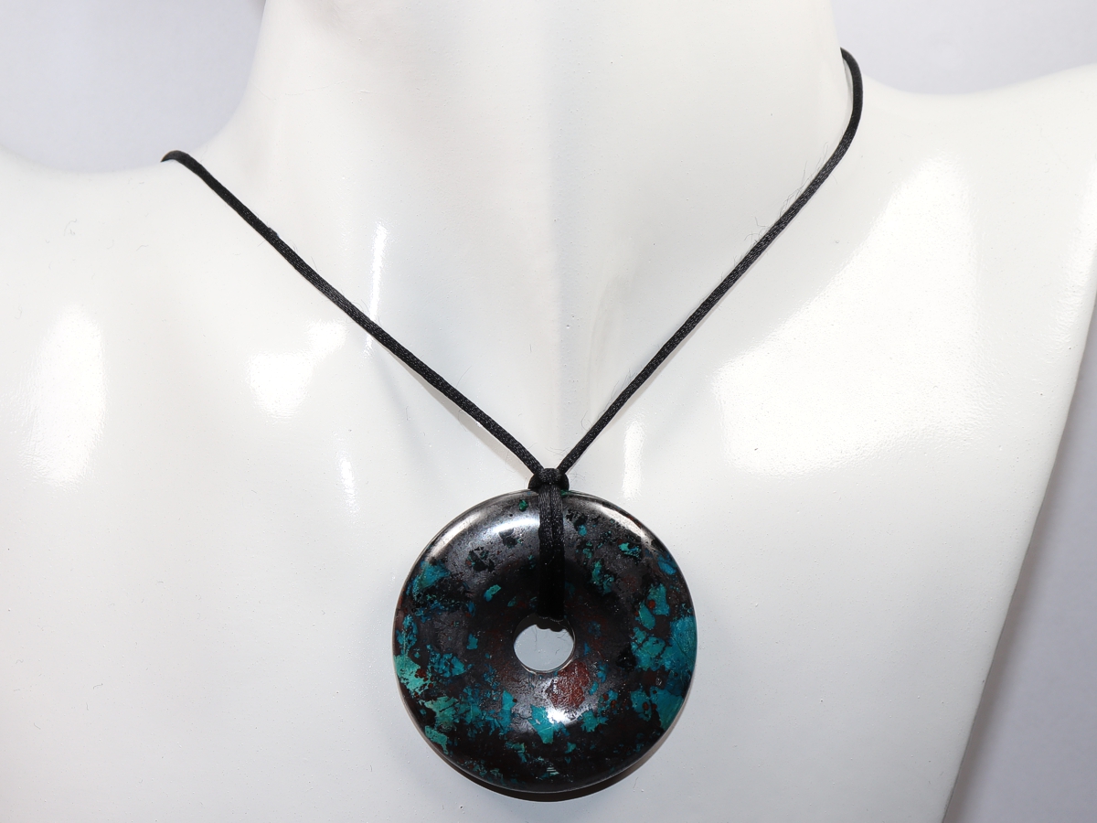 Die Halskette mit dem Donut aus Hämatit-Chrysokoll und einem schwarzen Band wird nach Ihren Angaben individualisiert. Der Verschluss ist aus Edelstahl.