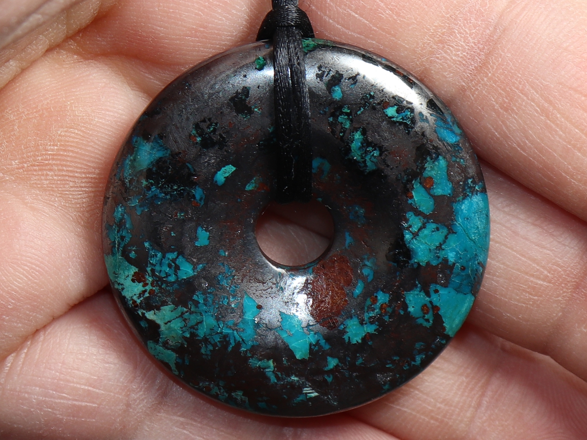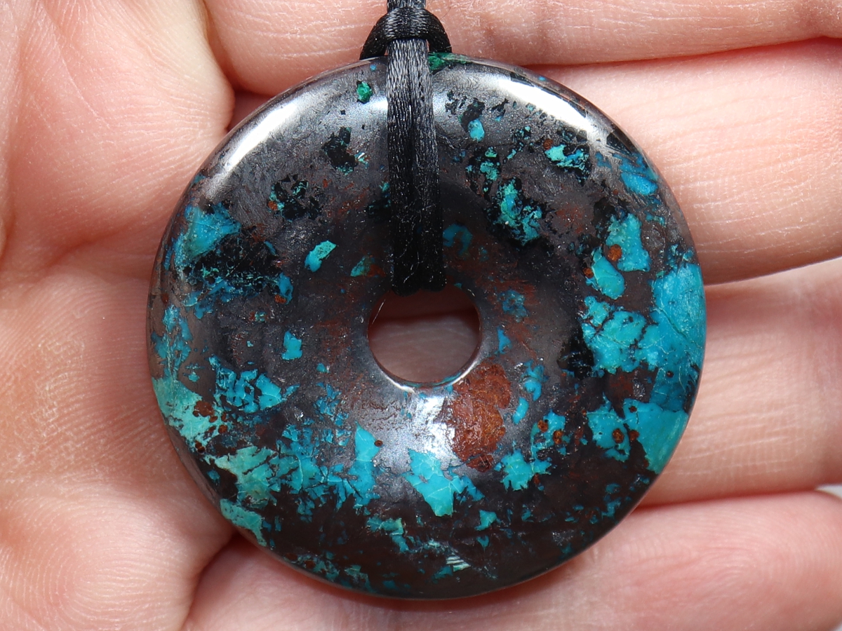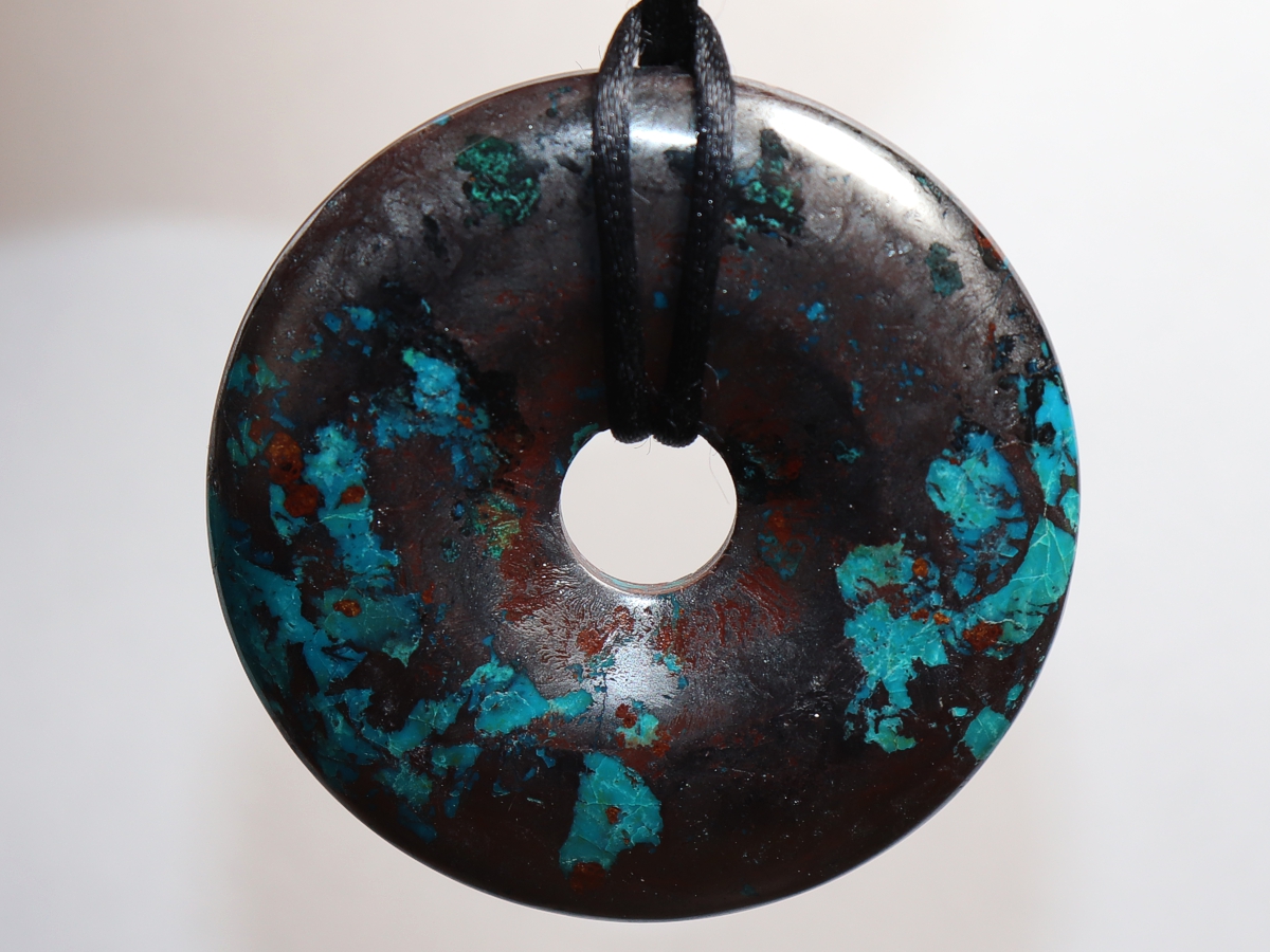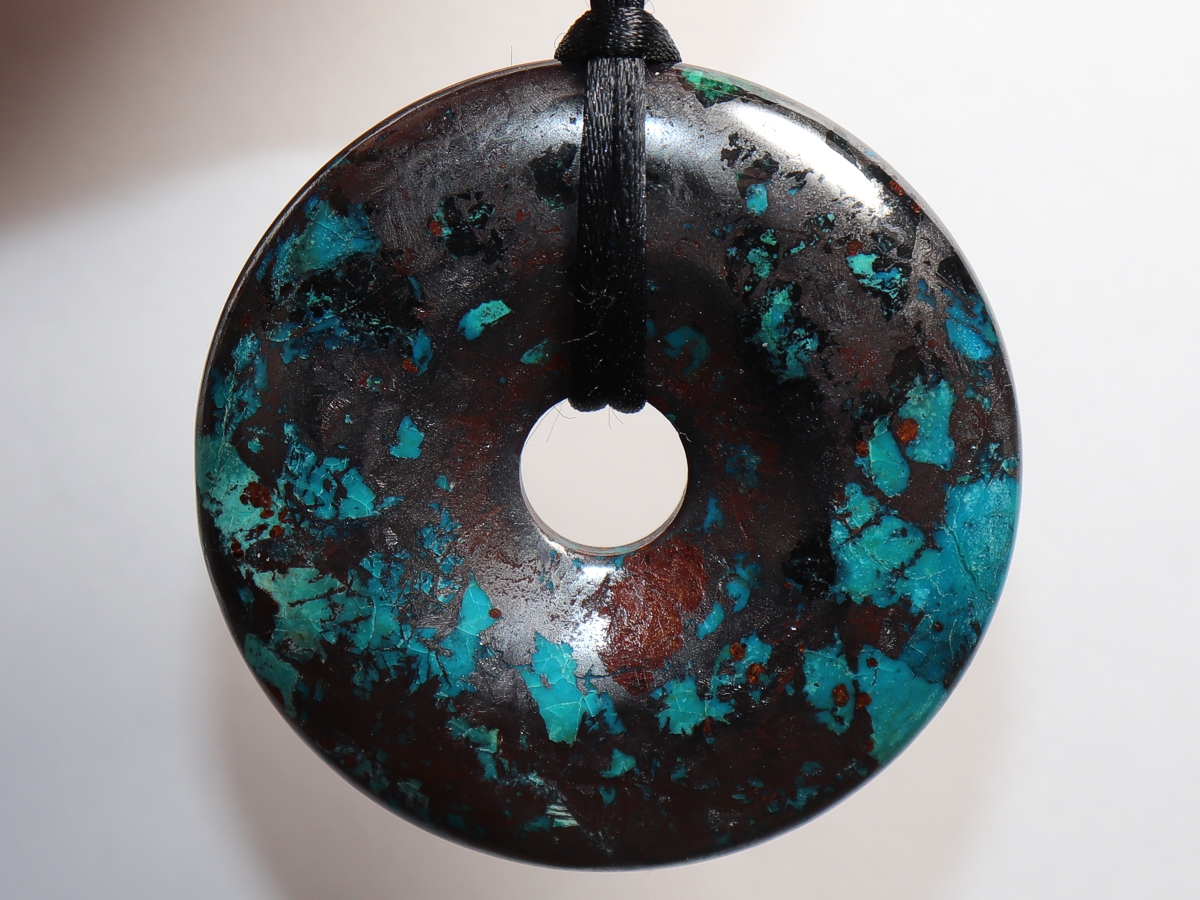Die Halskette mit dem Donut aus Hämatit-Chrysokoll und einem schwarzen Band wird nach Ihren Angaben individualisiert. Der Verschluss ist aus Edelstahl.