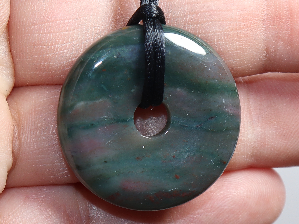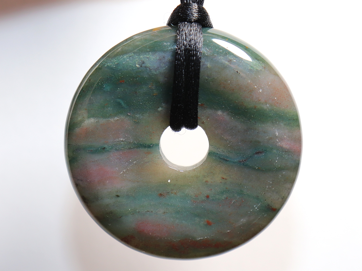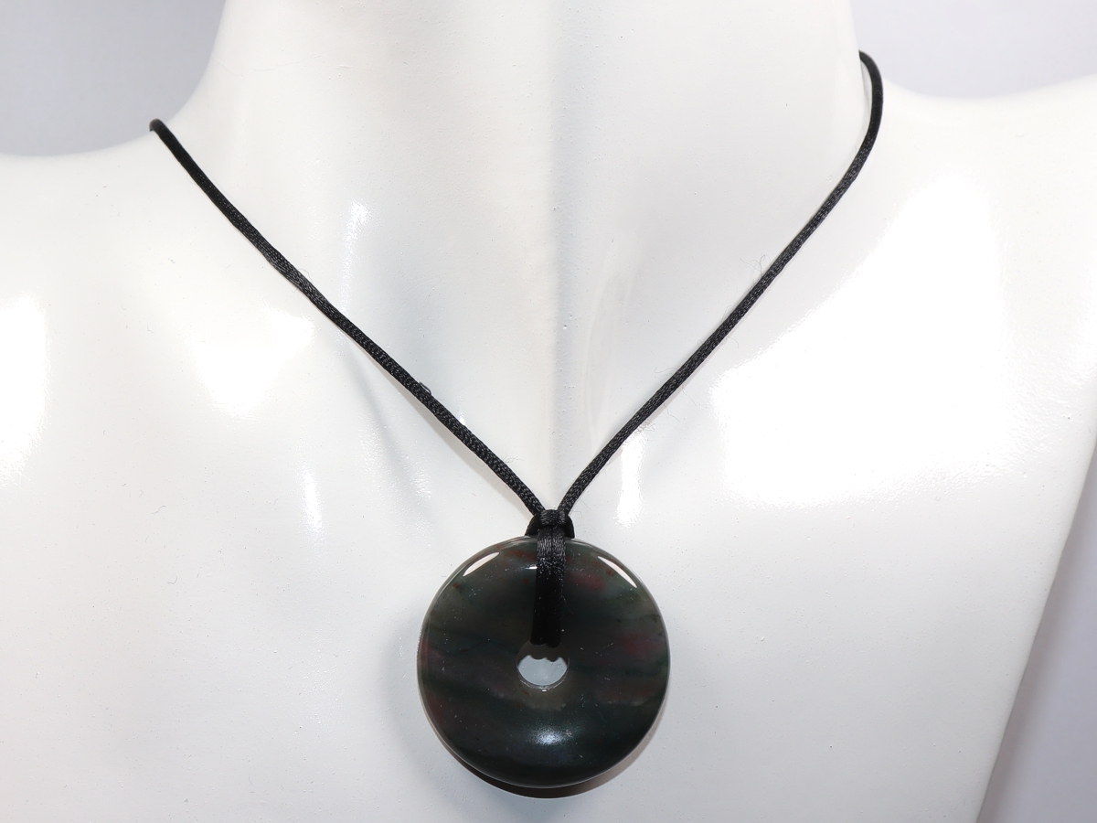 Die Halskette mit dem Donut aus Heliotrop und einem schwarzen Band wird nach Ihren Angaben individualisiert. Der Verschluss ist aus Edelstahl.