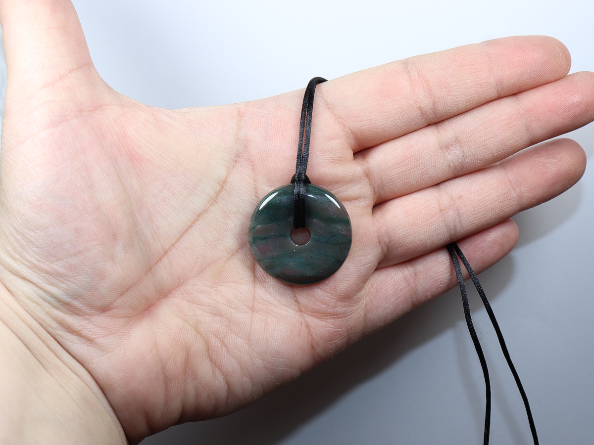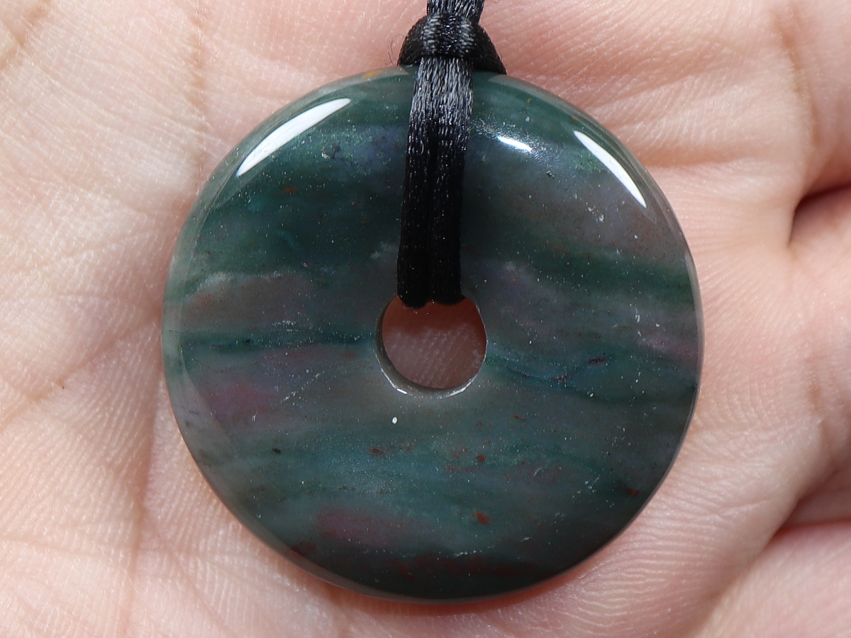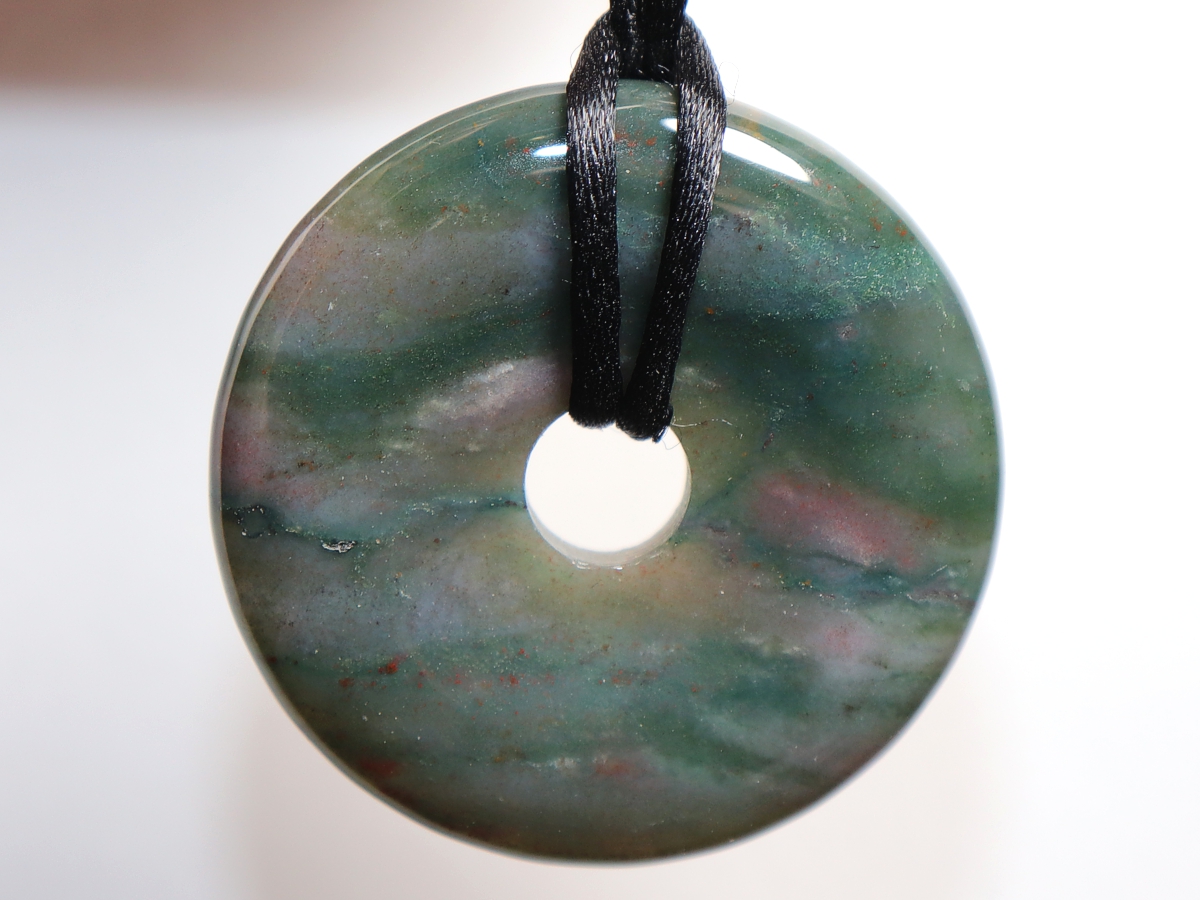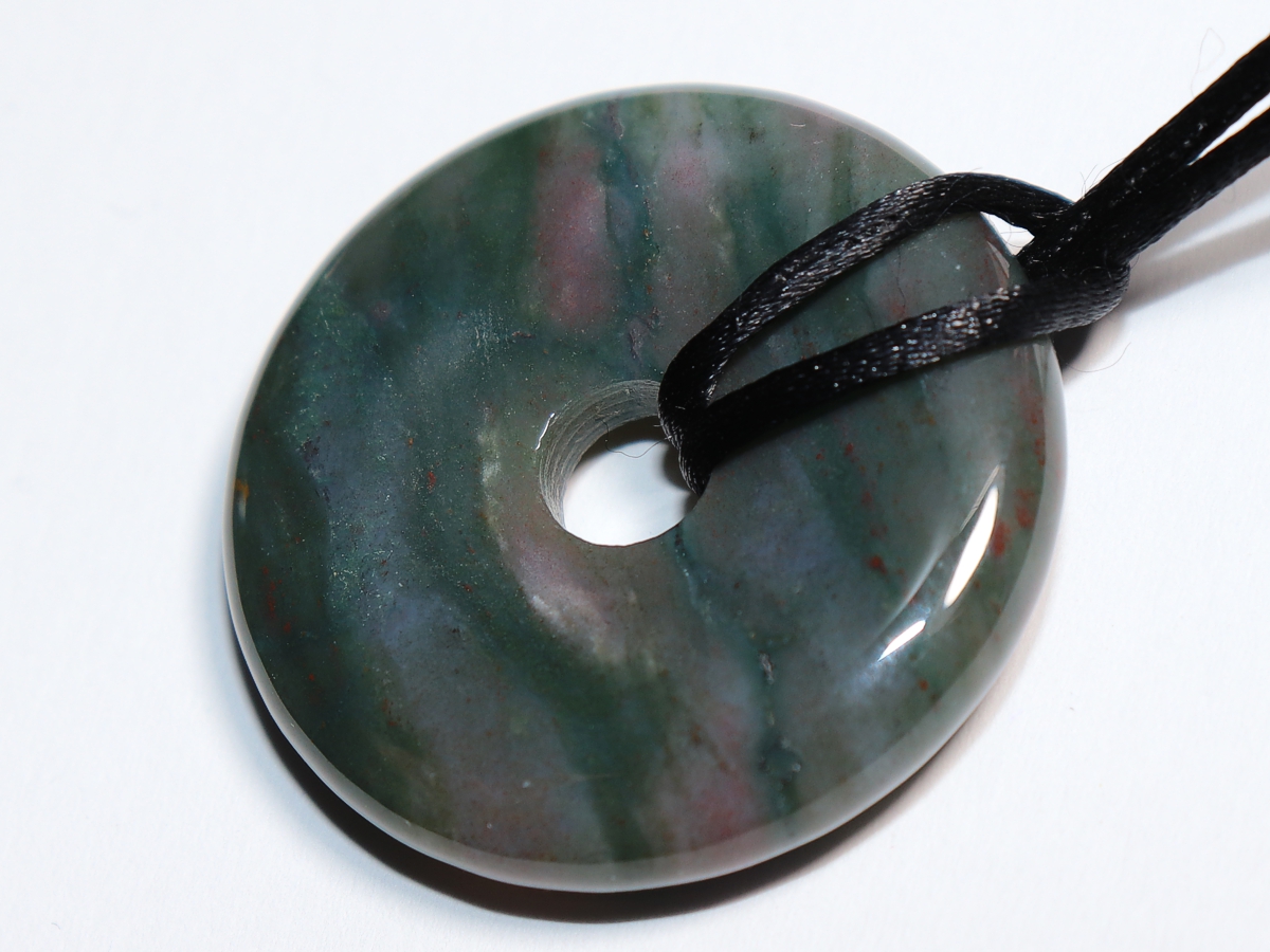 Die Halskette mit dem Donut aus Heliotrop und einem schwarzen Band wird nach Ihren Angaben individualisiert. Der Verschluss ist aus Edelstahl.