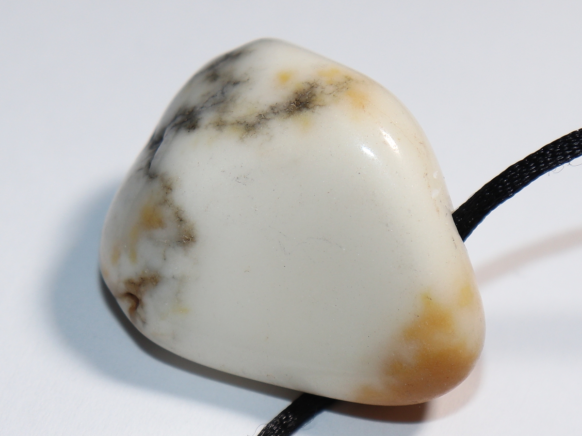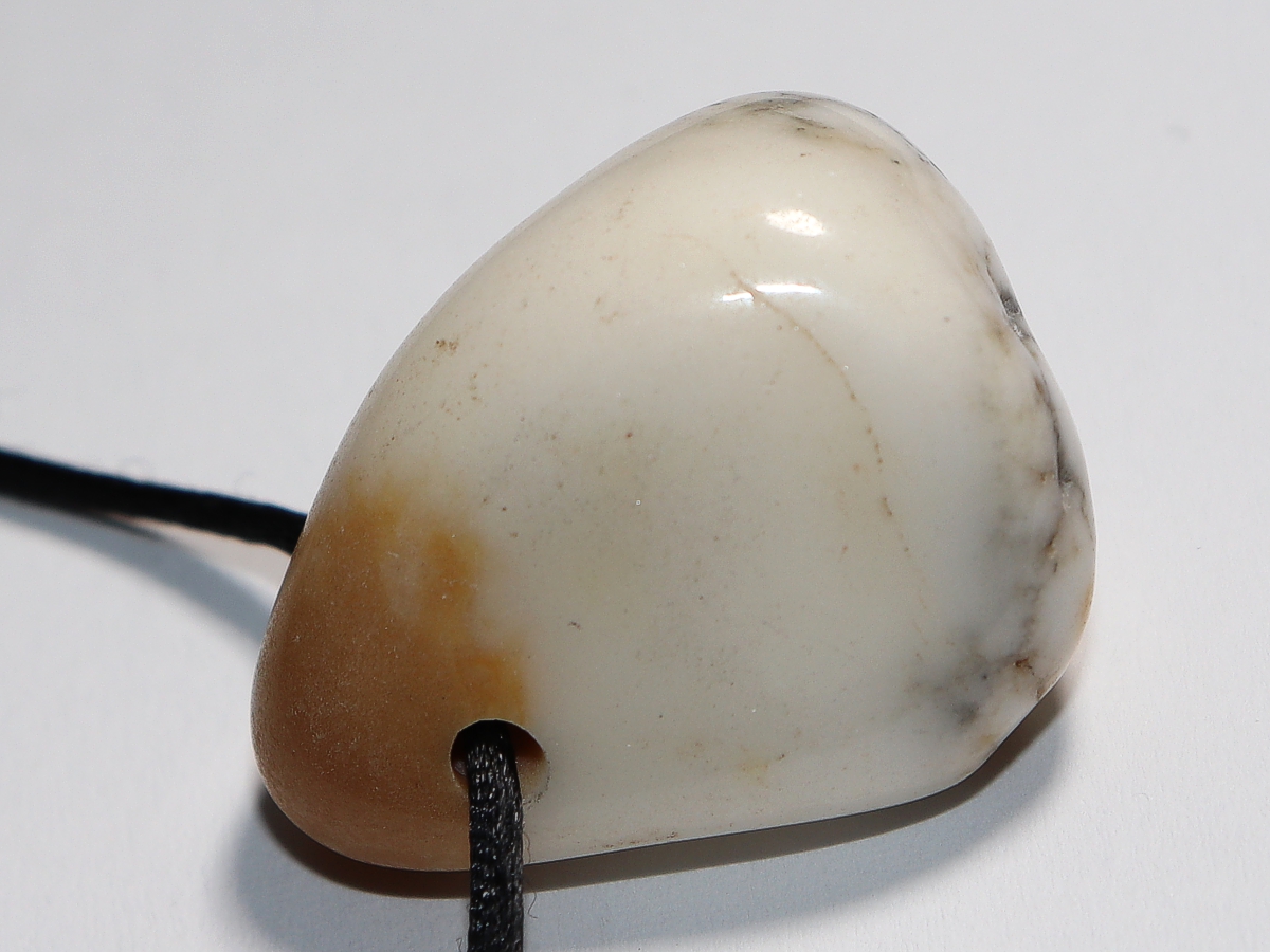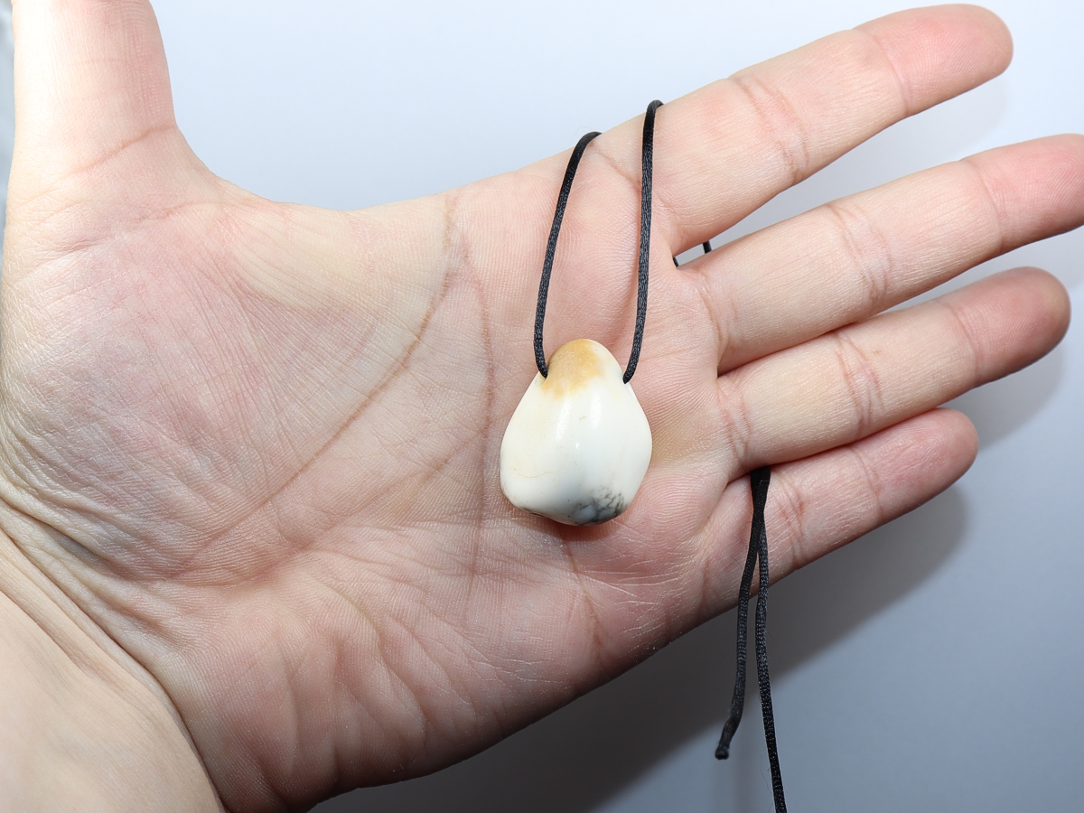 Die Halskette mit Howlith wird nach Ihren Angaben individualisiert. Sie haben die Wahl zwischen einem schwarzen Band mit einem Verschluss aus Edelstahl oder einer Kette aus Silber 925.
